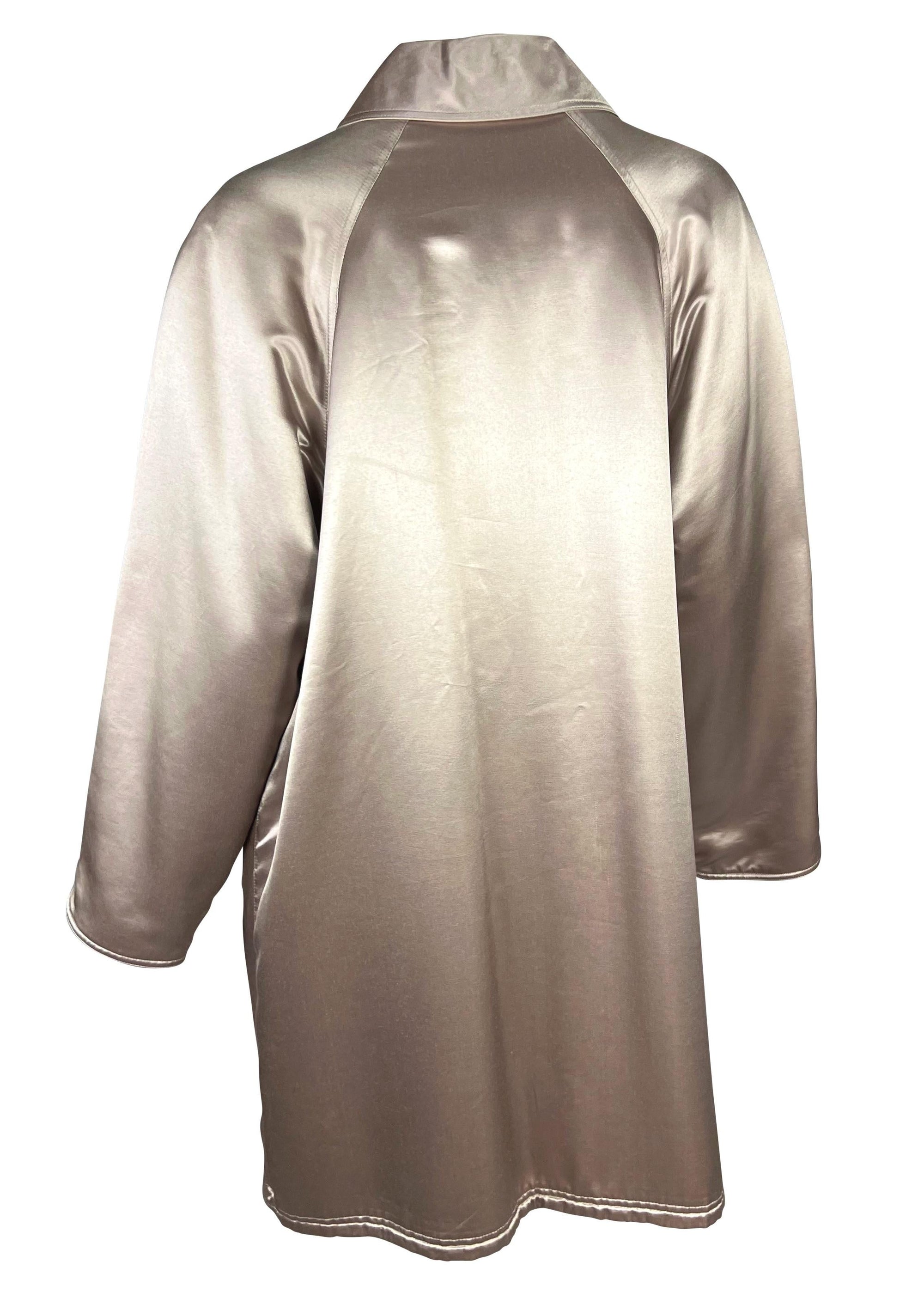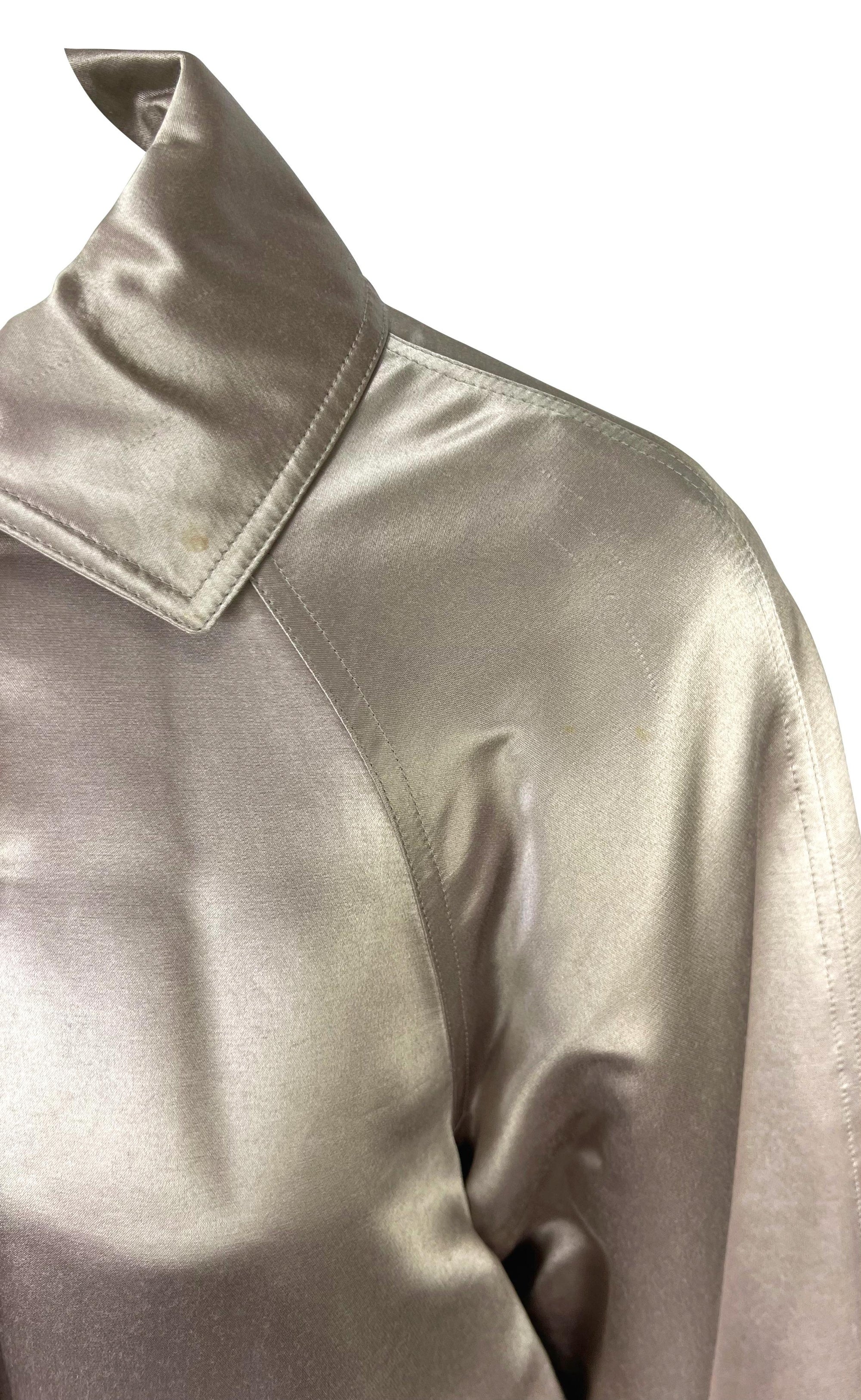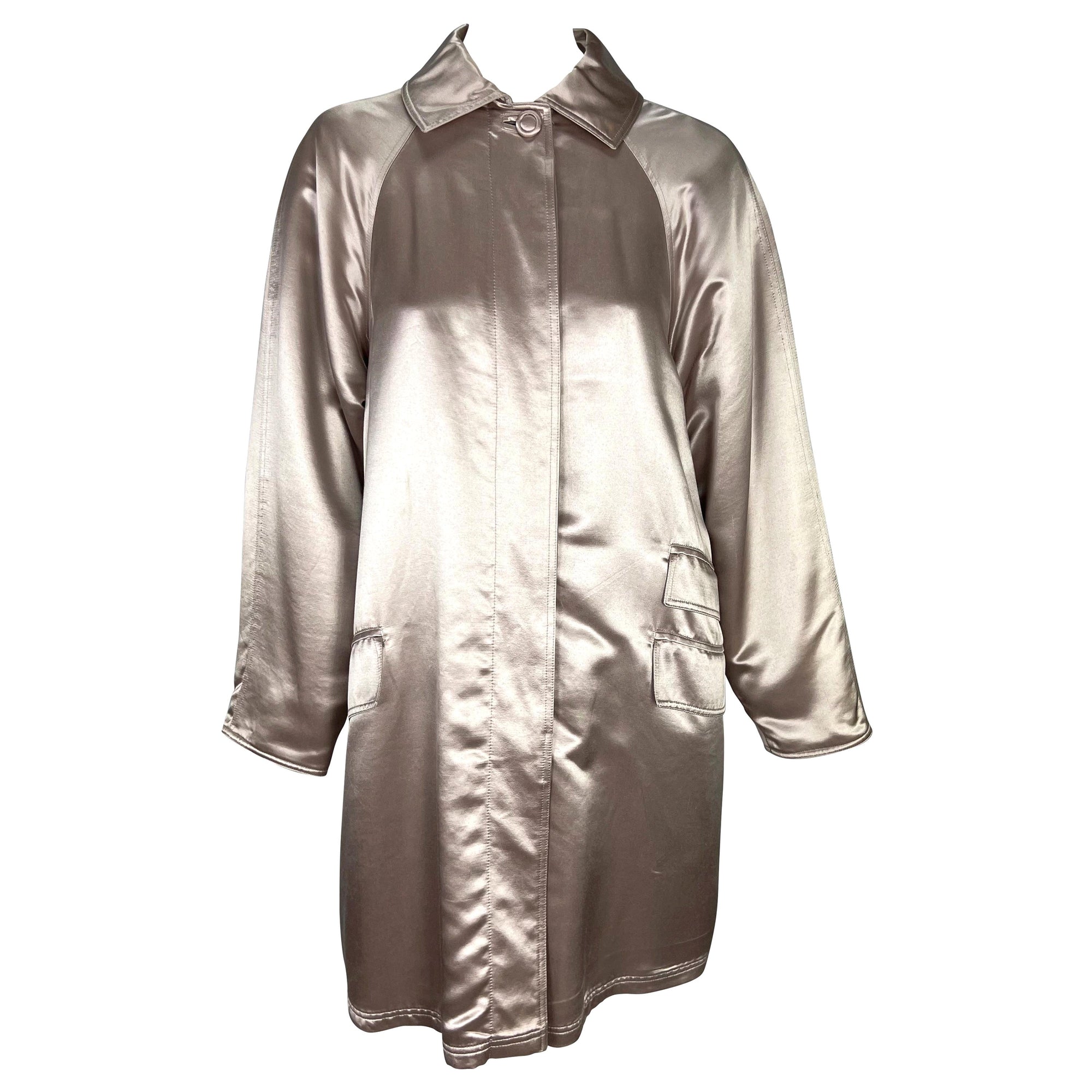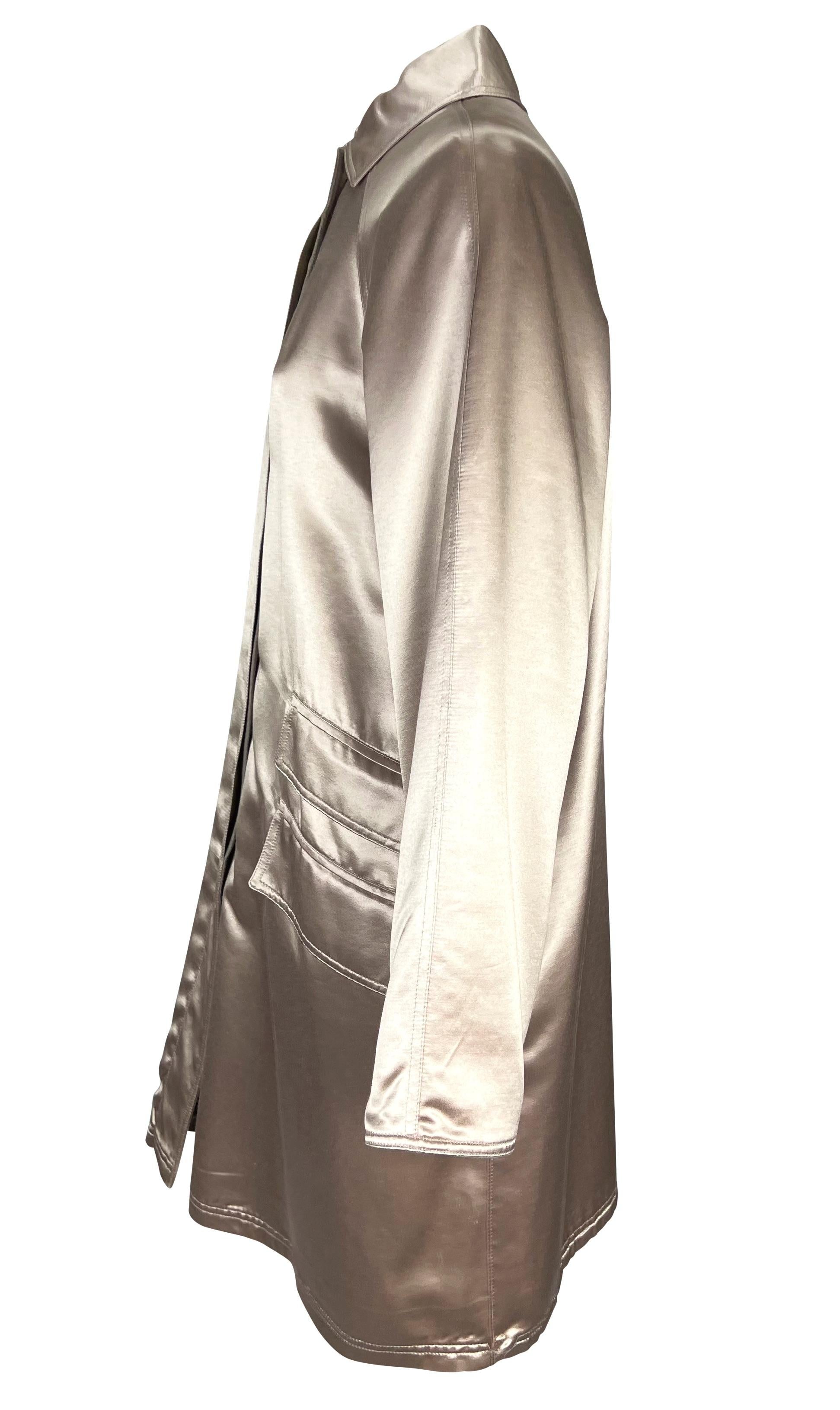 Presenting a stunning silver silk satin Gianni Versace oversized coat designed by Gianni Versace. From the Fall/Winter 1995 collection, this coat debuted as part of Look 44, modeled by Kristen McMenamy. This coat is constructed entirely of shiny satin and is made complete with a collar, hidden button closure, and pockets at the hips. Add this Versace runway gem to your closet!
