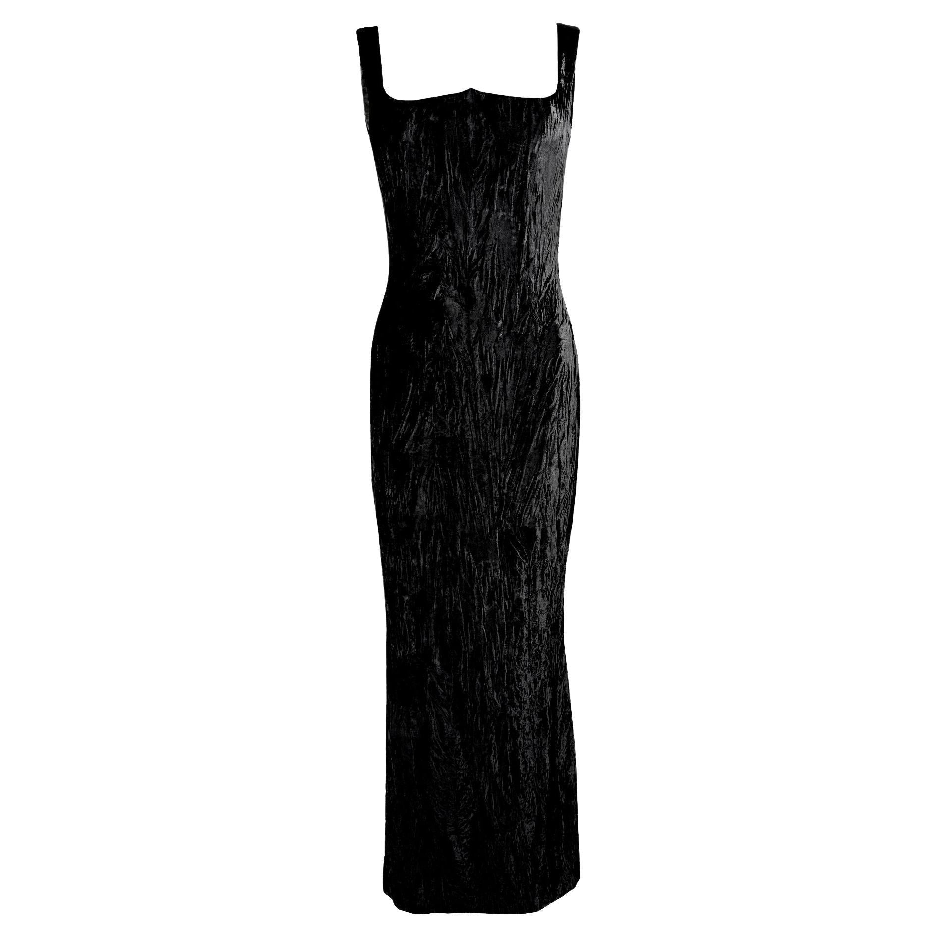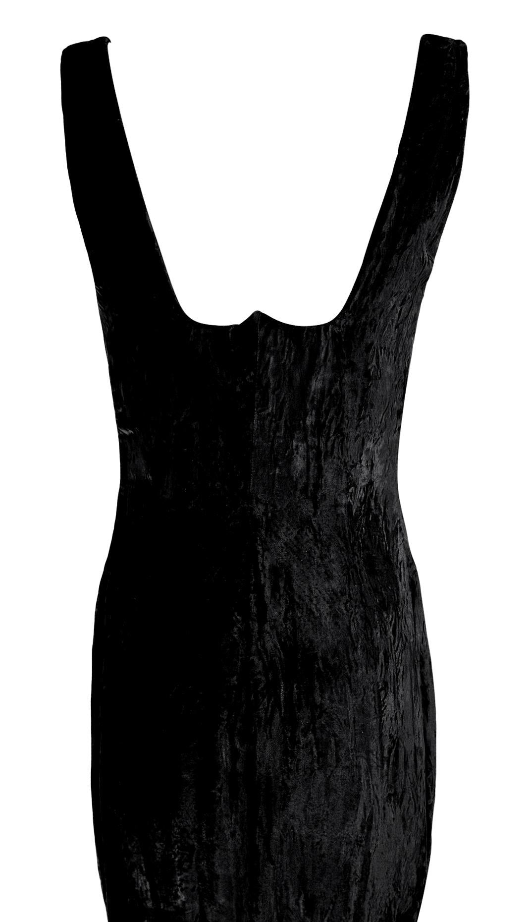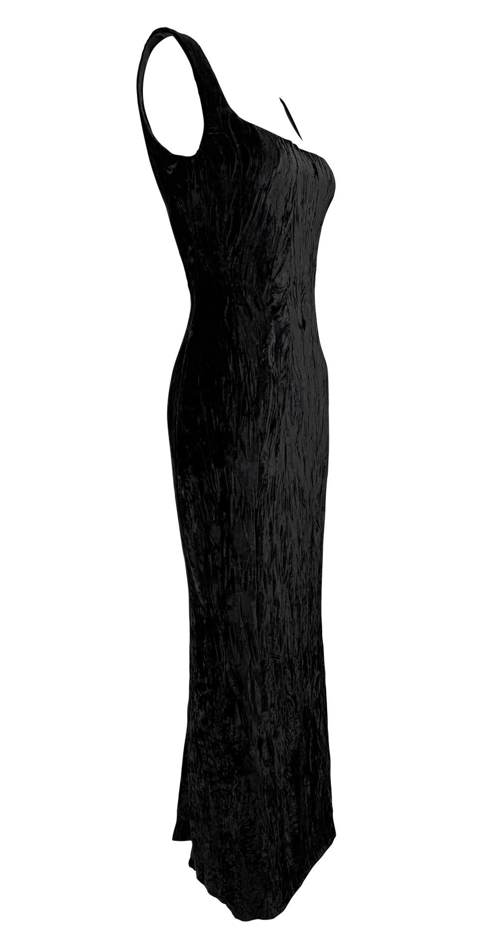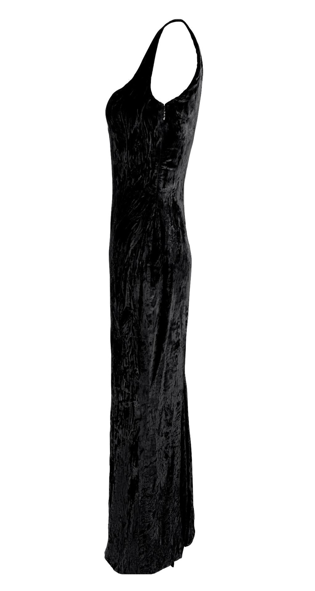 This Fall/Winter 1995 Gianni Versace evening gown is crafted from luxurious crushed black velvet, featuring a structured sweetheart neckline and a figure-hugging silhouette. Worn as look 59 on the runway by Eva Herzigova, the gown was also famously worn by Naomi Campbell to the Grand Opening of Seventh On Sale in New York. Additionally, it appeared in the August 1995 Vogue Italia "Vamp" editorial, modeled by Estella Warren and photographed by Ellen von Unwerth. This gown features a gorgeous intentionally wrinkled velvet for added textural depth.