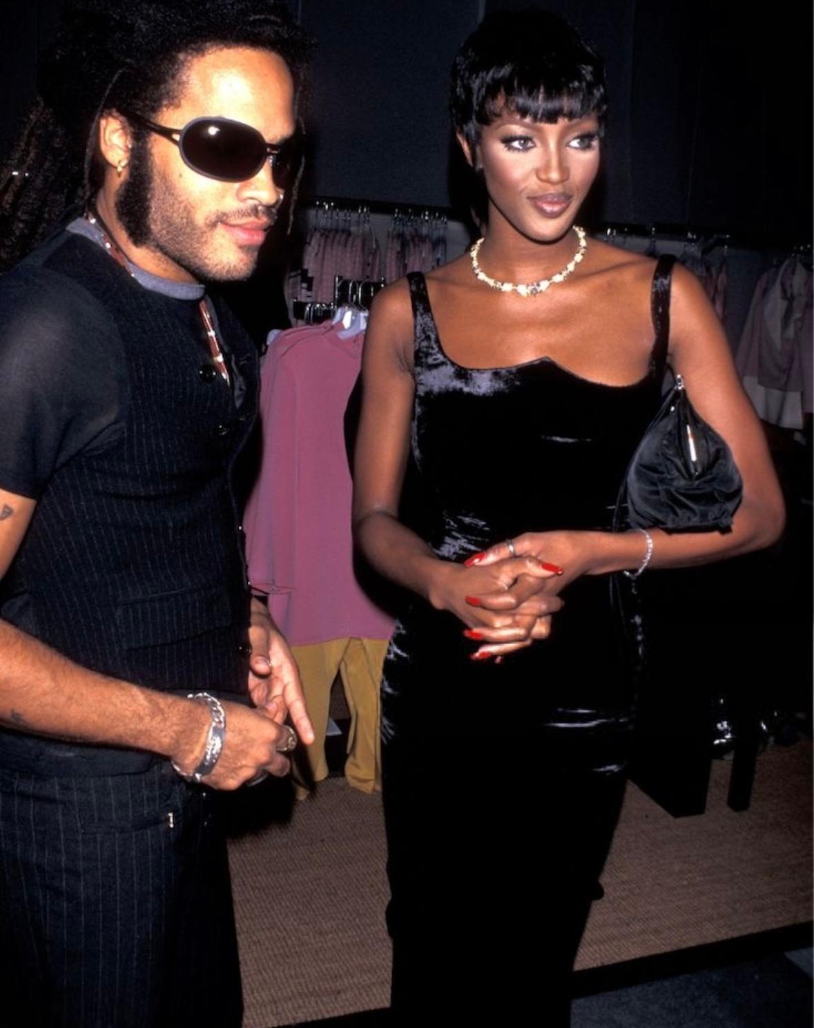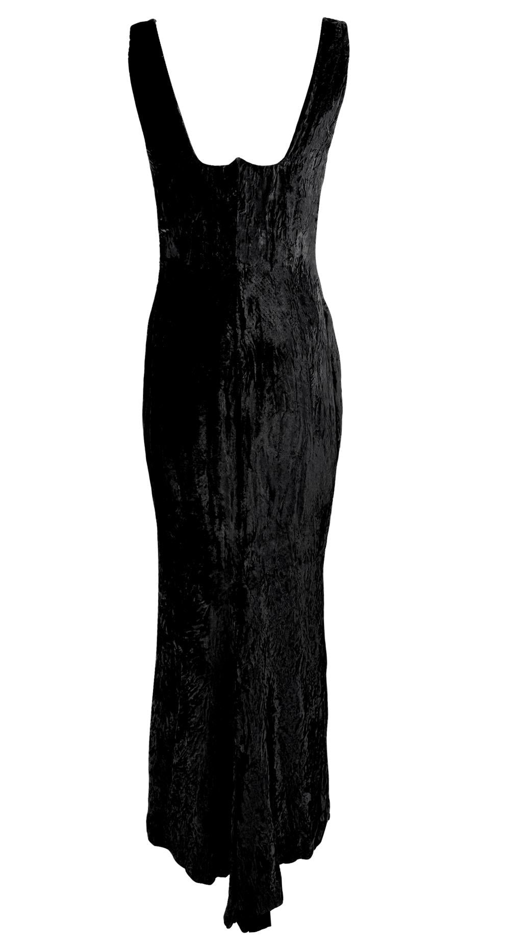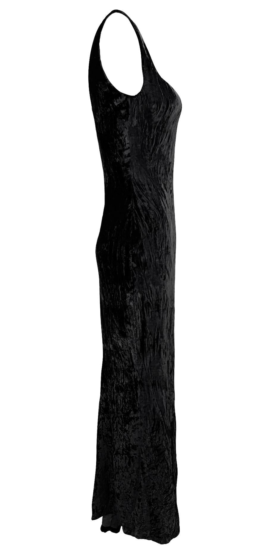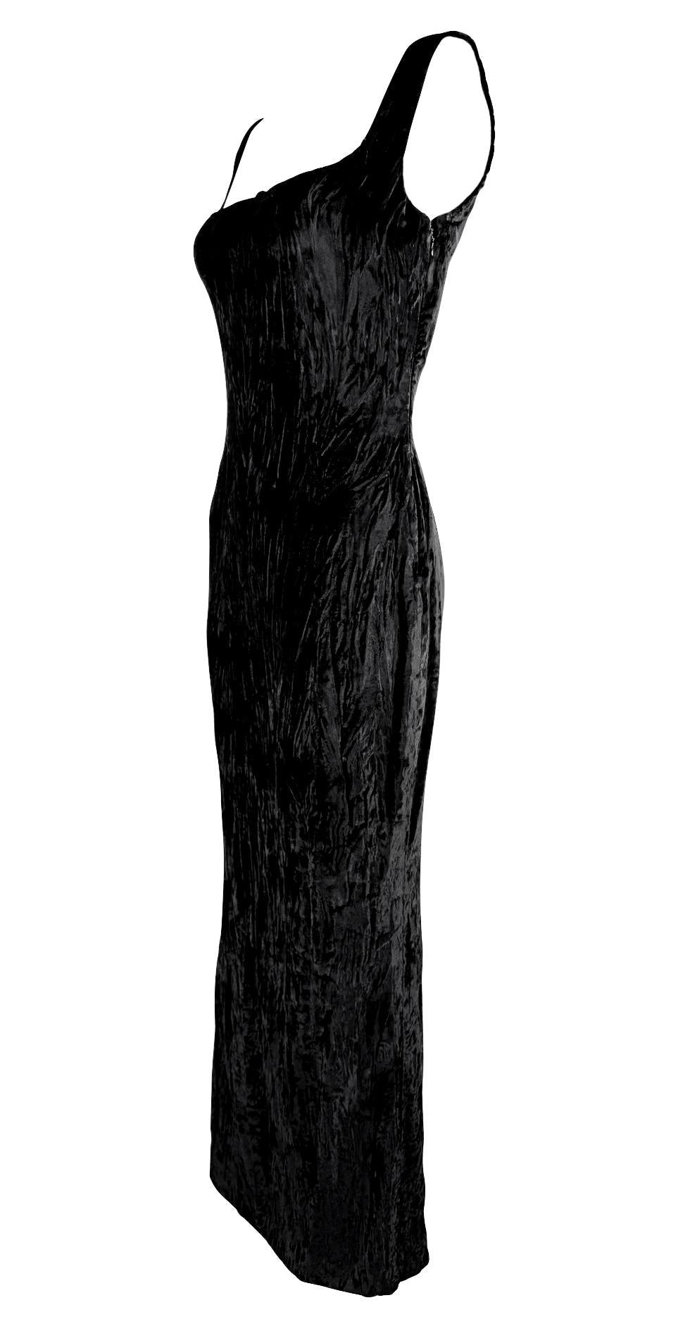 This Fall/Winter 1995 Gianni Versace evening gown is crafted from luxurious crushed black velvet, featuring a structured sweetheart neckline and a figure-hugging silhouette. Worn as look 59 on the runway by Eva Herzigova, the gown was also famously worn by Naomi Campbell to the Grand Opening of Seventh On Sale in New York. Additionally, it appeared in the August 1995 Vogue Italia "Vamp" editorial, modeled by Estella Warren and photographed by Ellen von Unwerth. This gown features a gorgeous intentionally wrinkled velvet for added textural depth.
