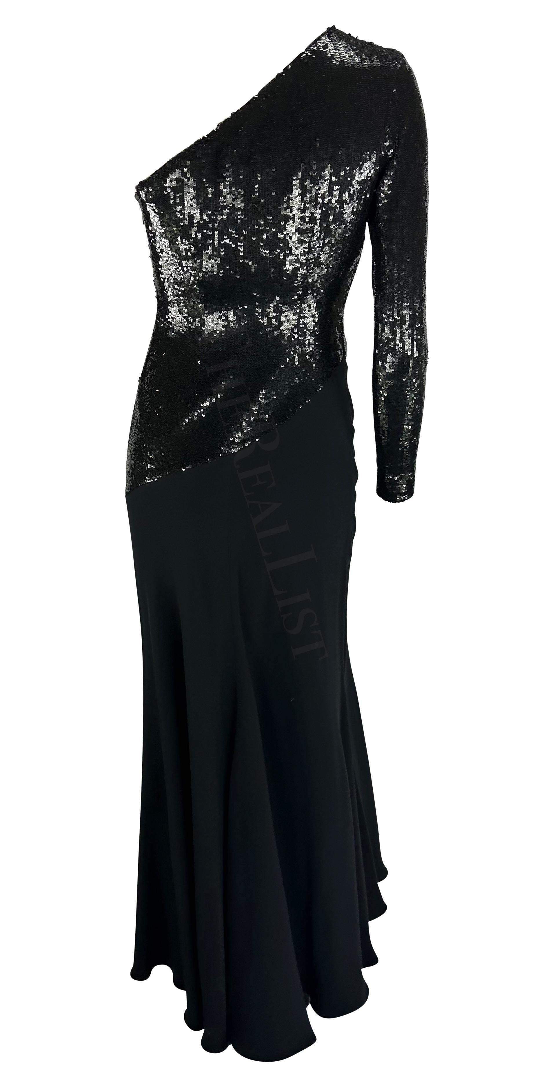 Presenting an elegant asymmetric evening gown designed by Ralph Lauren for his Fall/Winter 1995 collection. Small black sequins at the bodice form a single sleeve that beautifully captures light with each movement. The stretch fabric hugs the wearer for the perfect bodycon fit with a glamorous flared skirt. Check out our storefront for more classic vintage Ralph Lauren!