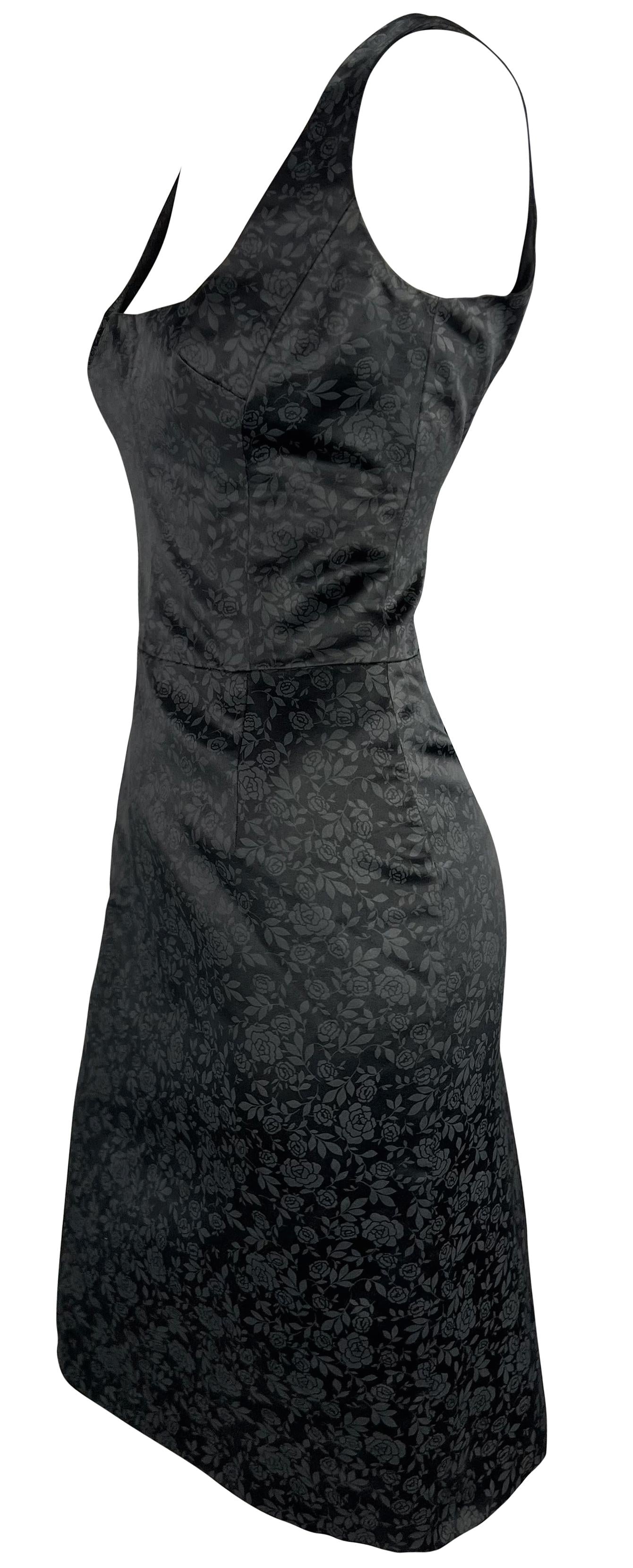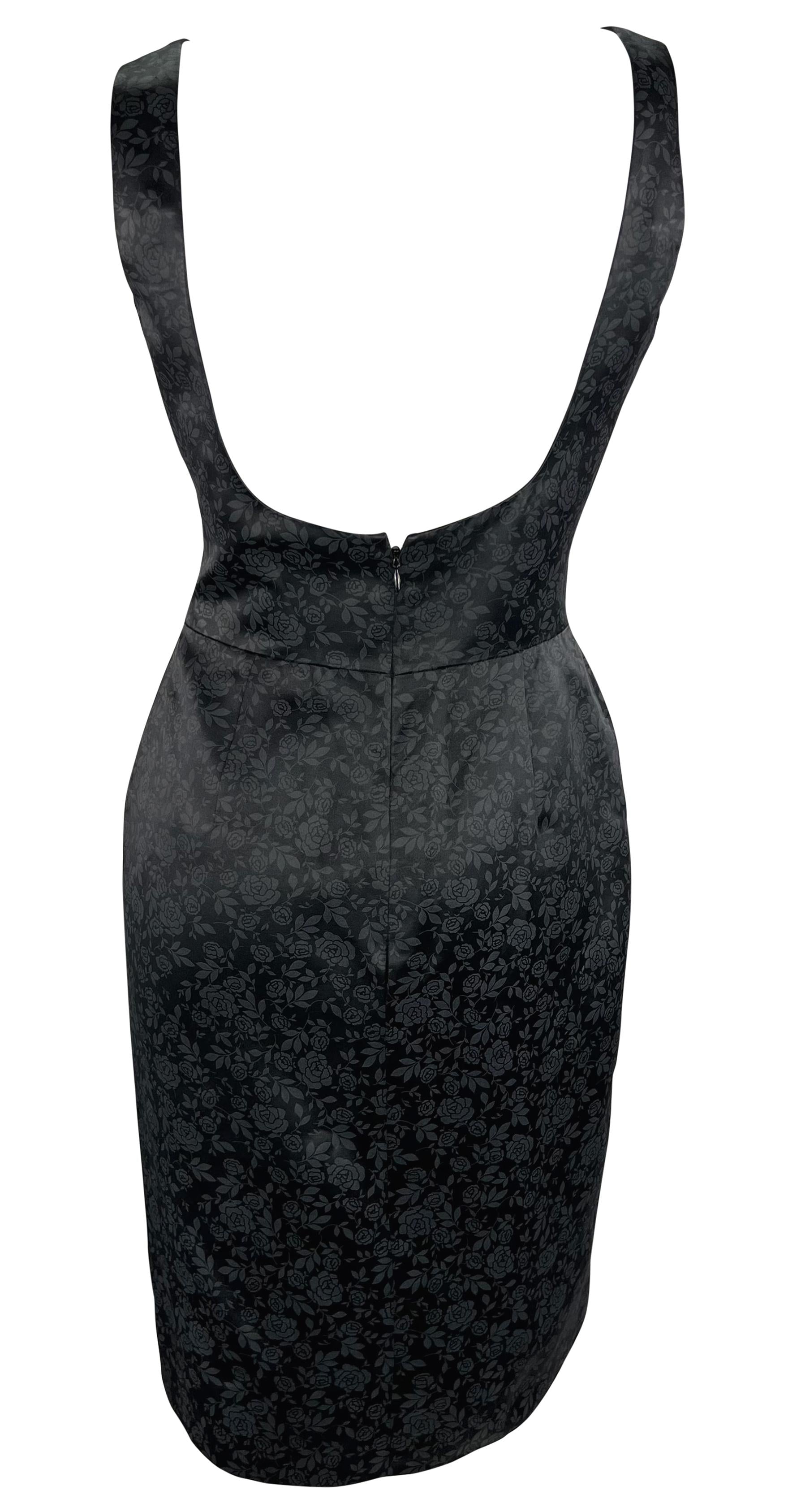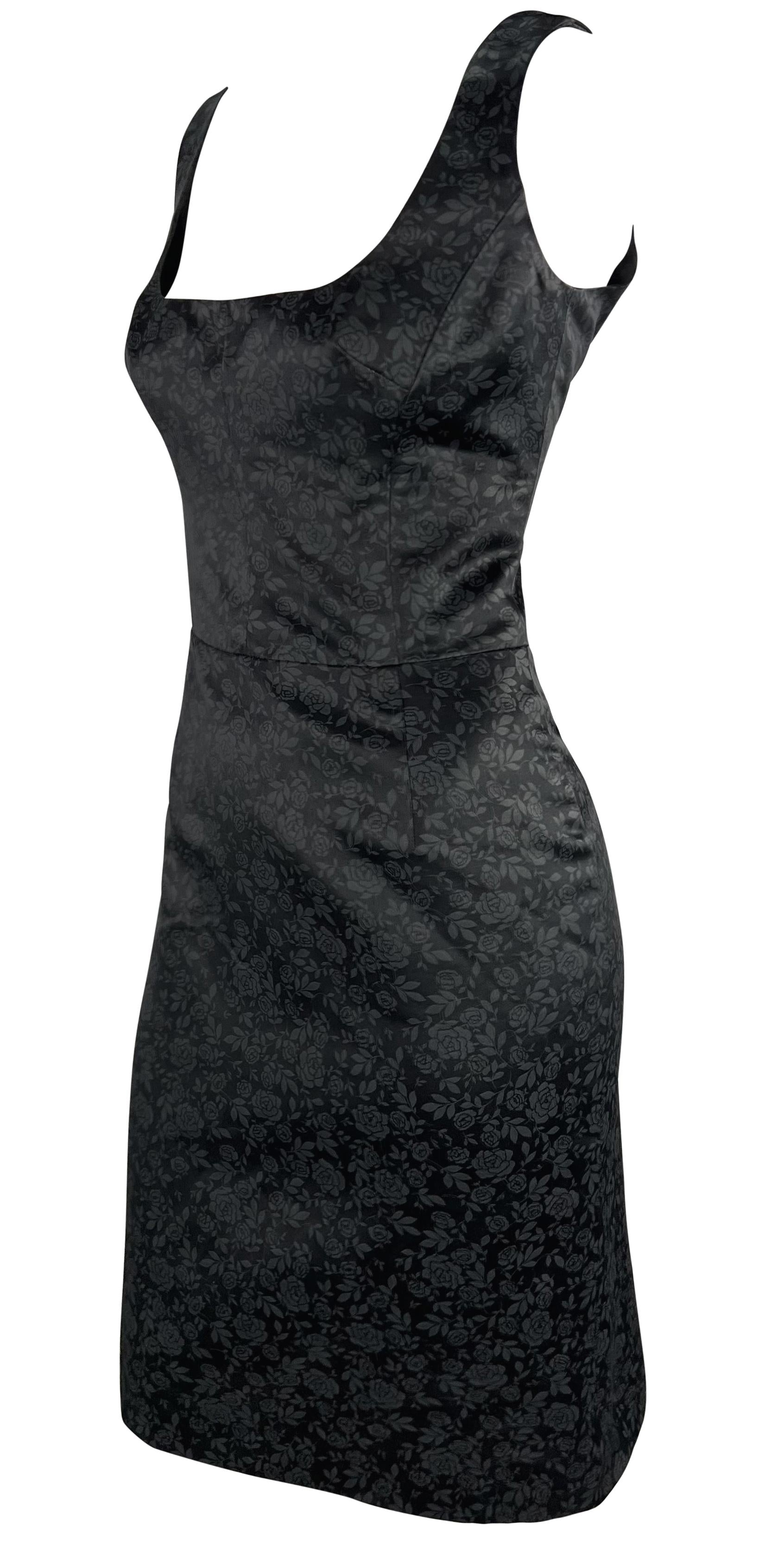 From the Fall/Winter 1996 collection, this sleeveless Dolce & Gabbana little black satin dress is covered in a monotone rose print. Featuring a square neckline and an exposed back, this sleek dress is an effortlessly chic addition to any wardrobe.