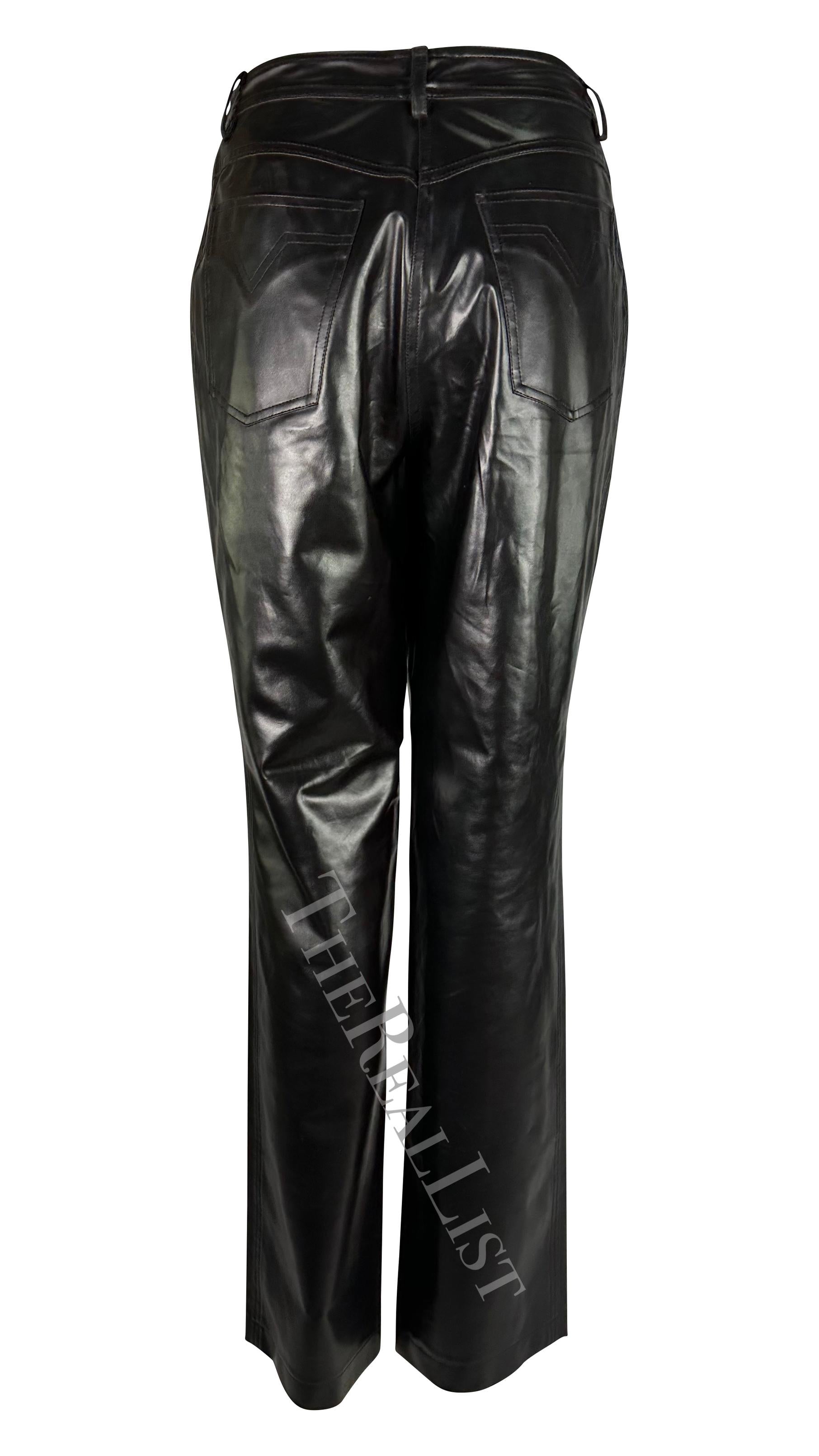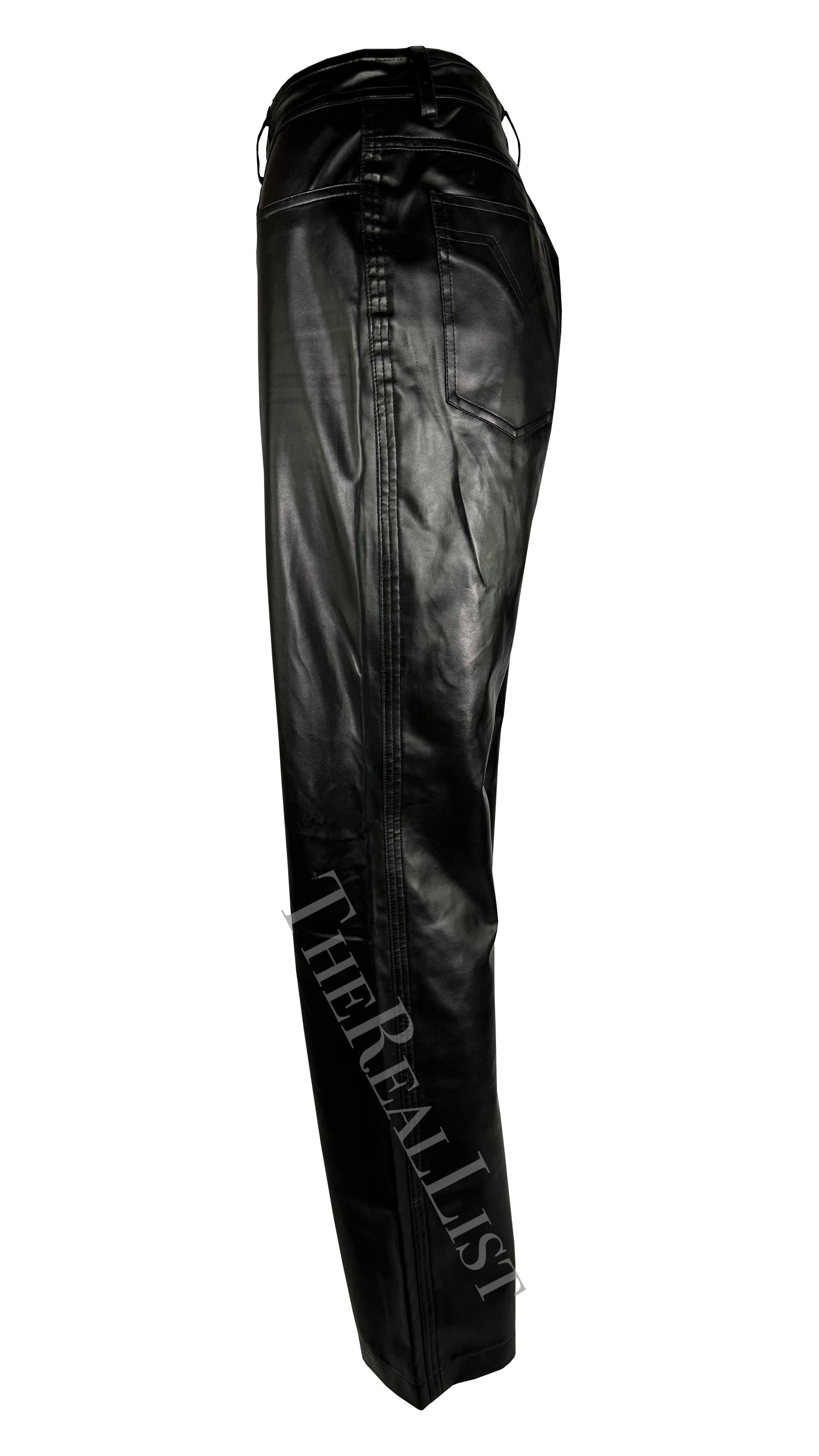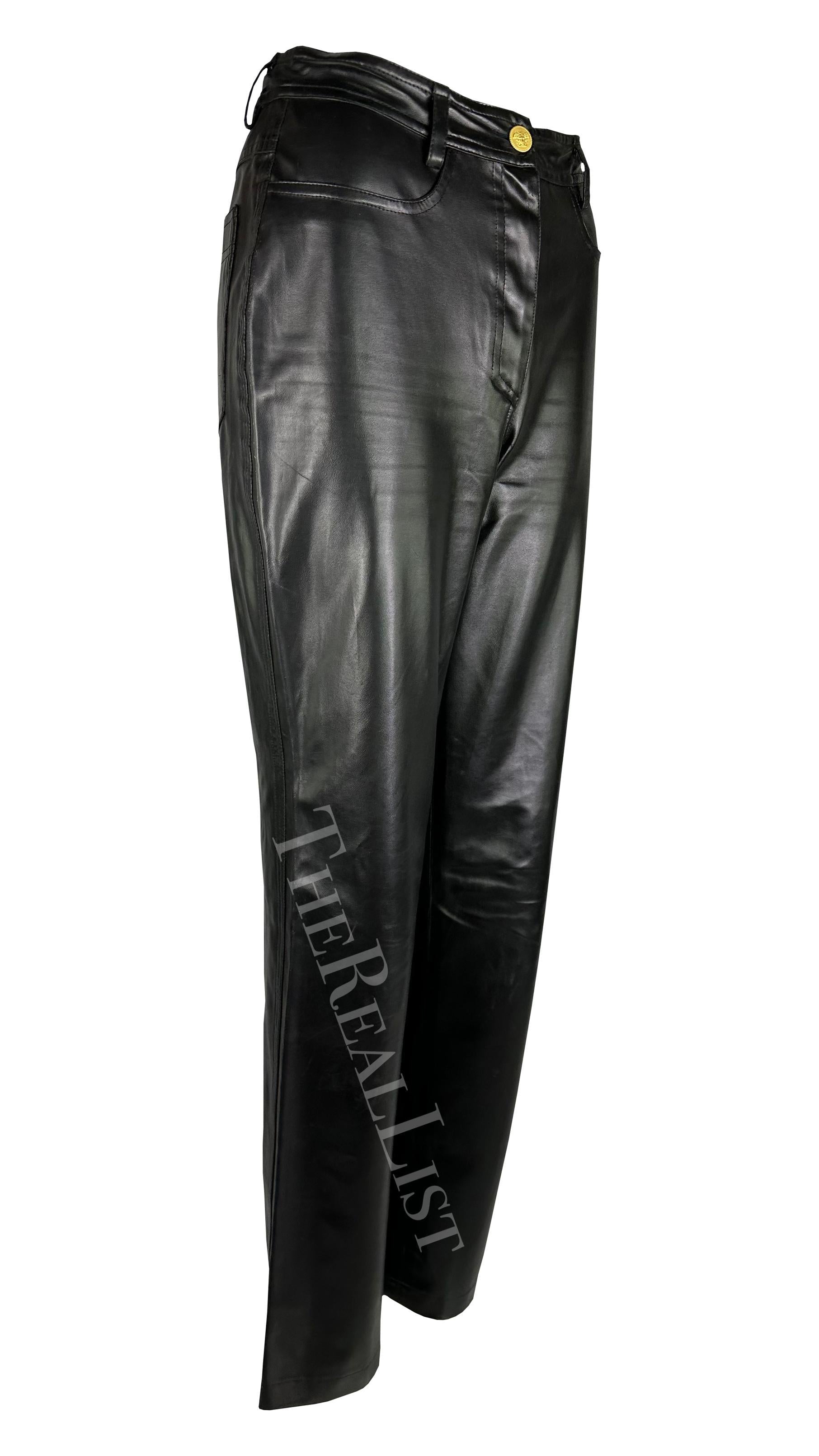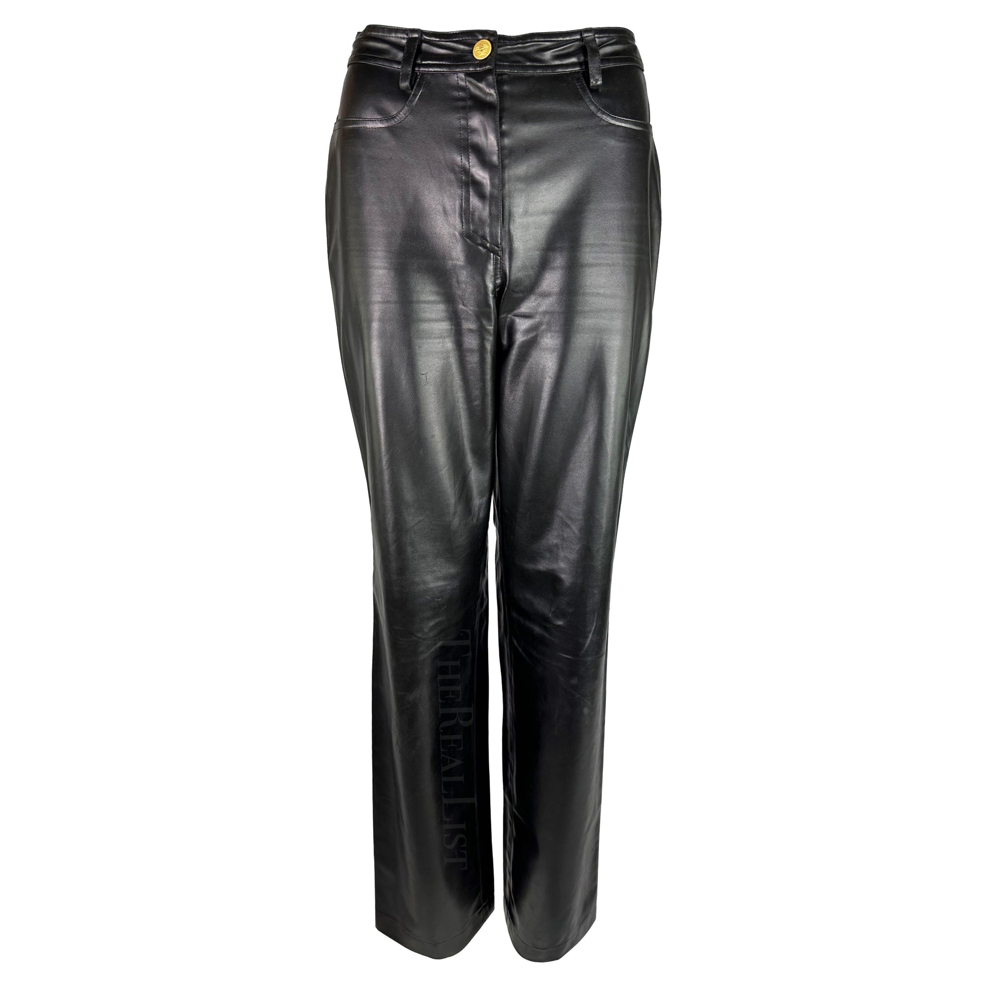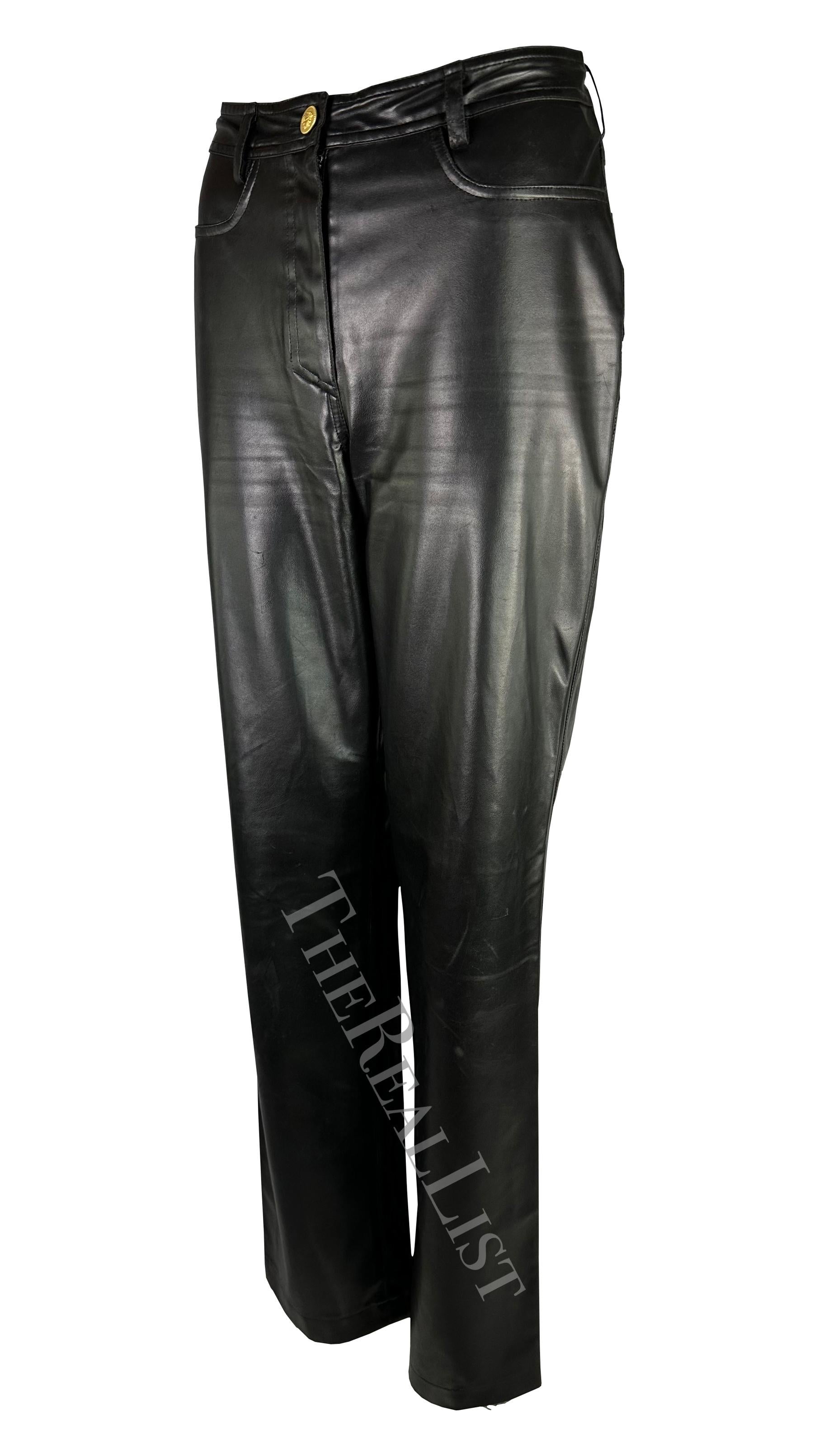 Presenting a pair of black faux leather Gianni Versace pants, designed by Gianni Versace. From the Fall/Winter 1996 collection, these pants are crafted from shiny vegan leather. Featuring a straight cut and a striking gold-tone Versace Medusa relief closure, these pieces make a bold statement, perfect for any discerning fashionista's wardrobe or luxury collection.