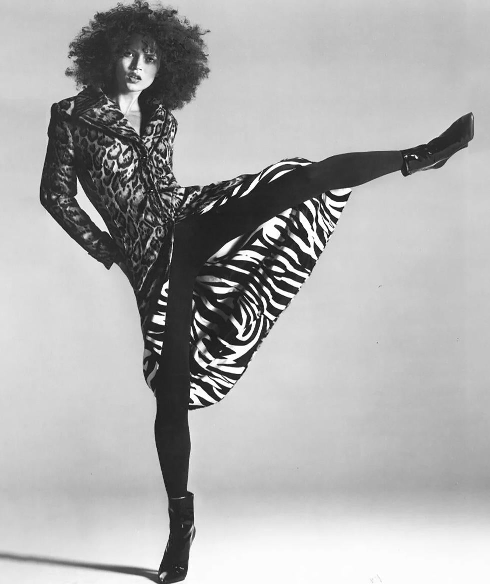 This black leopard-print faux fur trench coat from Gianni Versace is a rare prototype from the Fall/Winter 1996 collection. The double-breasted design features a dark leopard motif and a plush fold-over collar in solid black. A similar version in another colorway was modeled by Kate Moss in the season’s ad campaign, photographed by Richard Avedon. Bold and luxurious, this archival Versace coat is a striking example of the house’s glamorous late-1990s aesthetic.