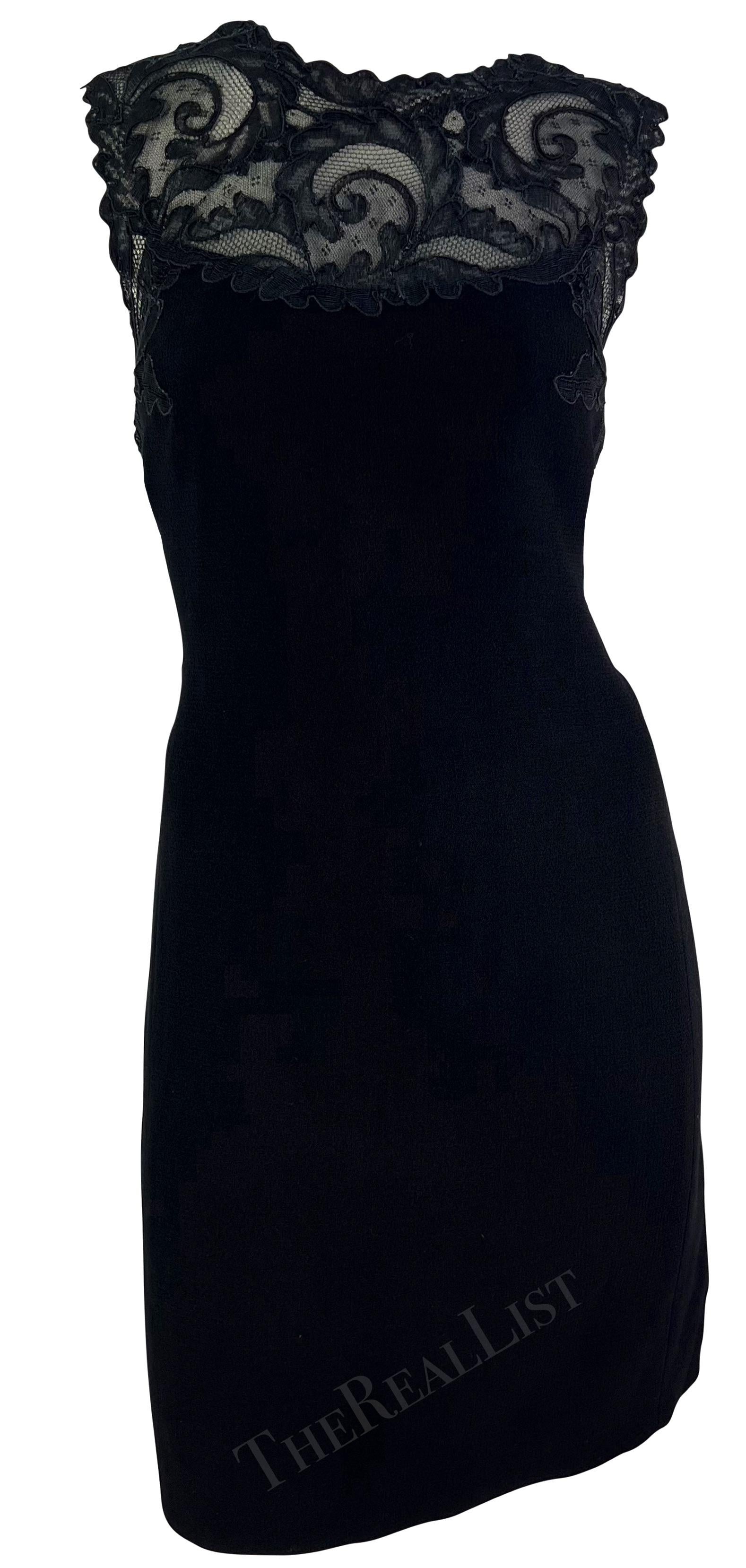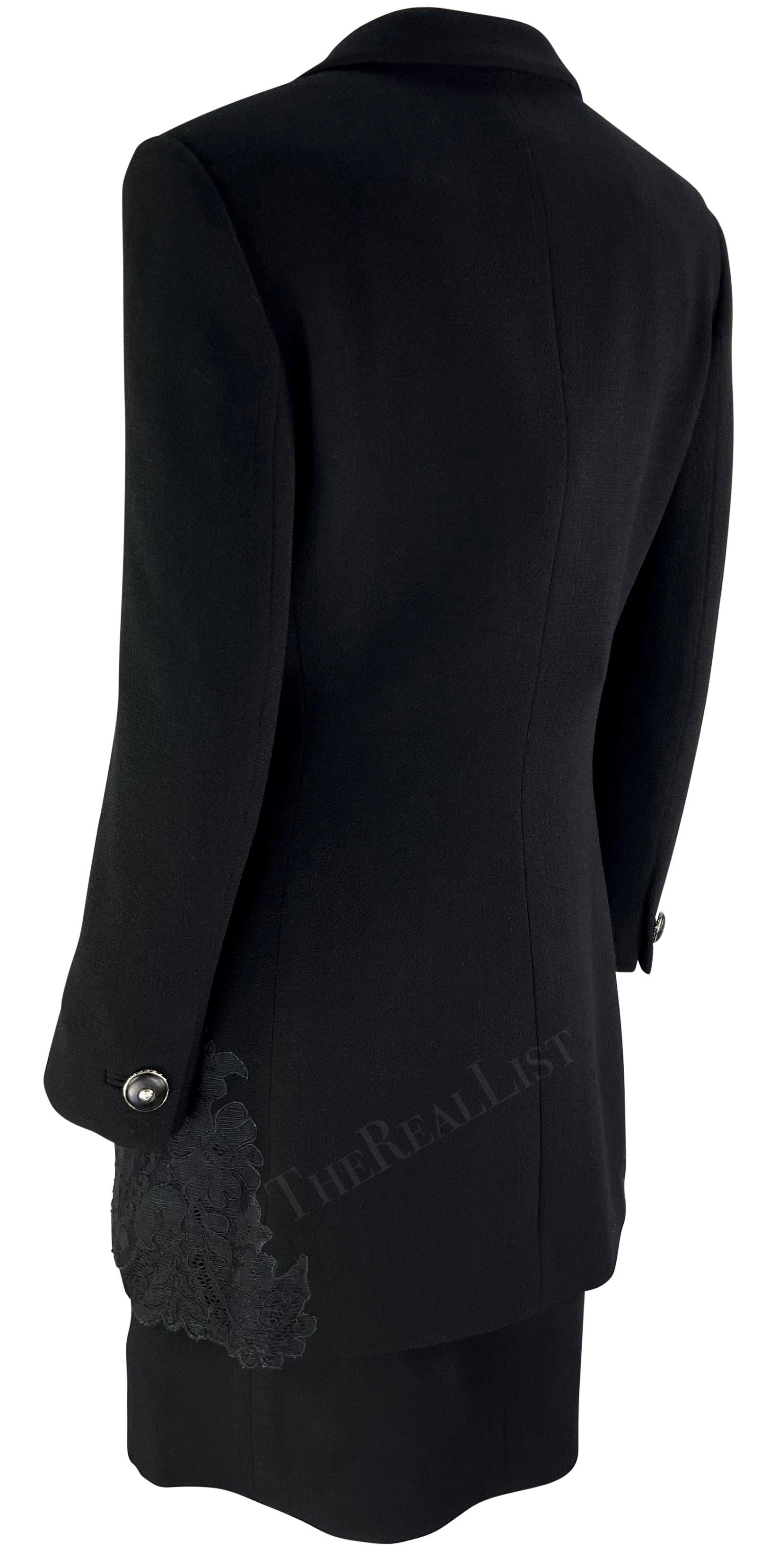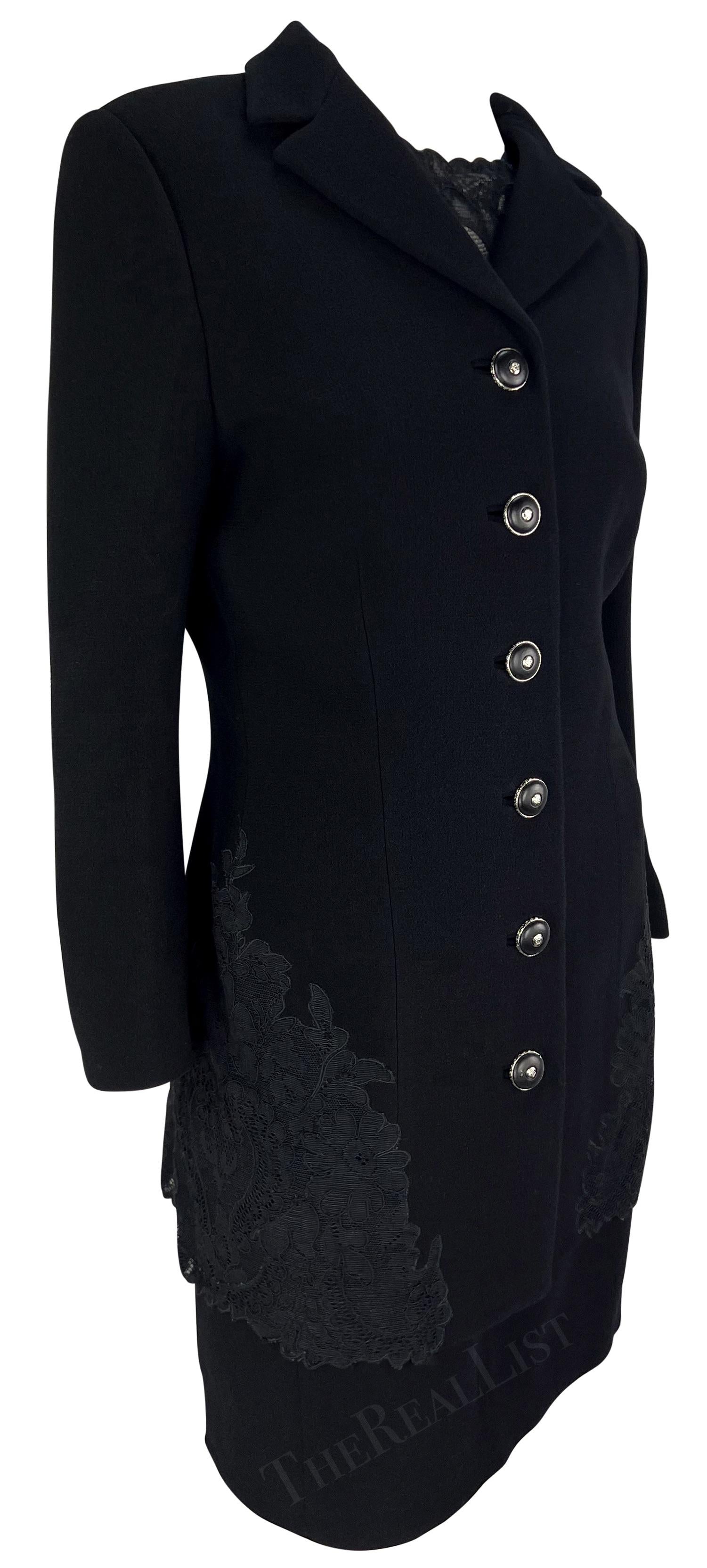 This is a striking black wool blend Gianni Versace dress set from the Fall/Winter 1996 collection is comprised of a sleeveless mini dress with lace detailing above the bust, accompanied by a matching coat. The coat mirrors the sheer lace accents seen on the dress, positioned at each side. The long jacket falls elegantly just above the dress's hemline. It boasts a lapel and front Versace Medusa button closures, along with matching buttons at the cuffs. Whether worn together or separately, this vintage Gianni Versace set adds a touch of refinement to any wardrobe.