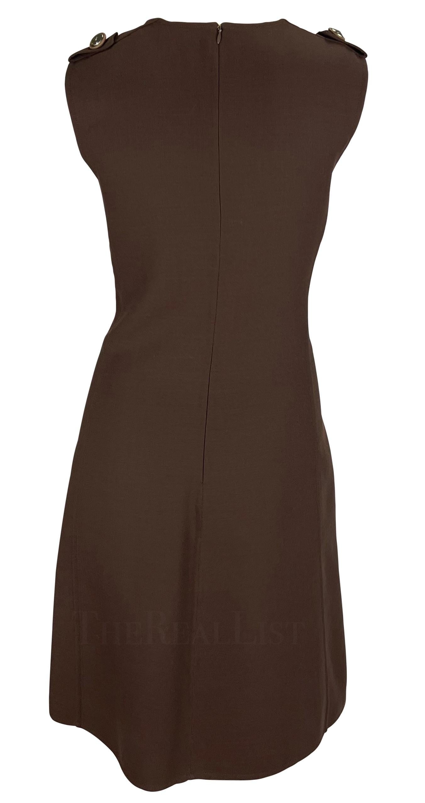 Presenting a fabulous brown Gianni Versace shift dress, designed by Gianni Versace. From the Fall/Winter 1996 collection, this dress features a high neckline and is made complete with epaulets at either shoulder with a silver-tone Versace Medusa relief button.