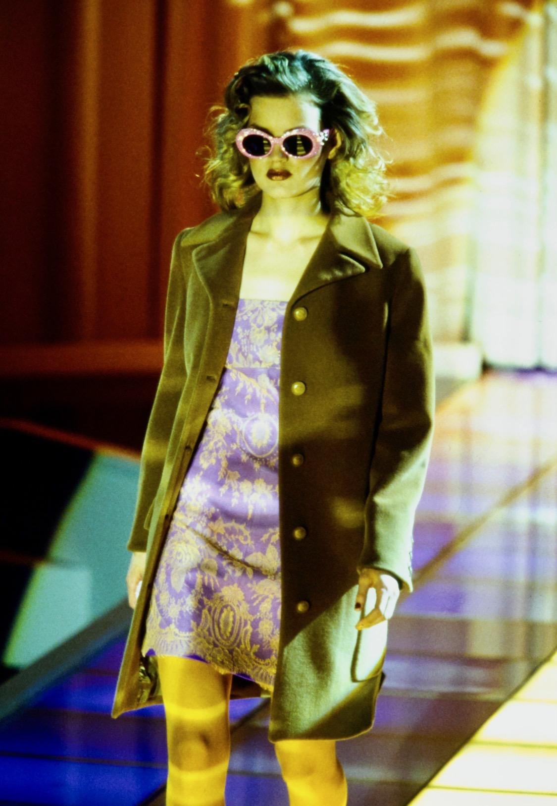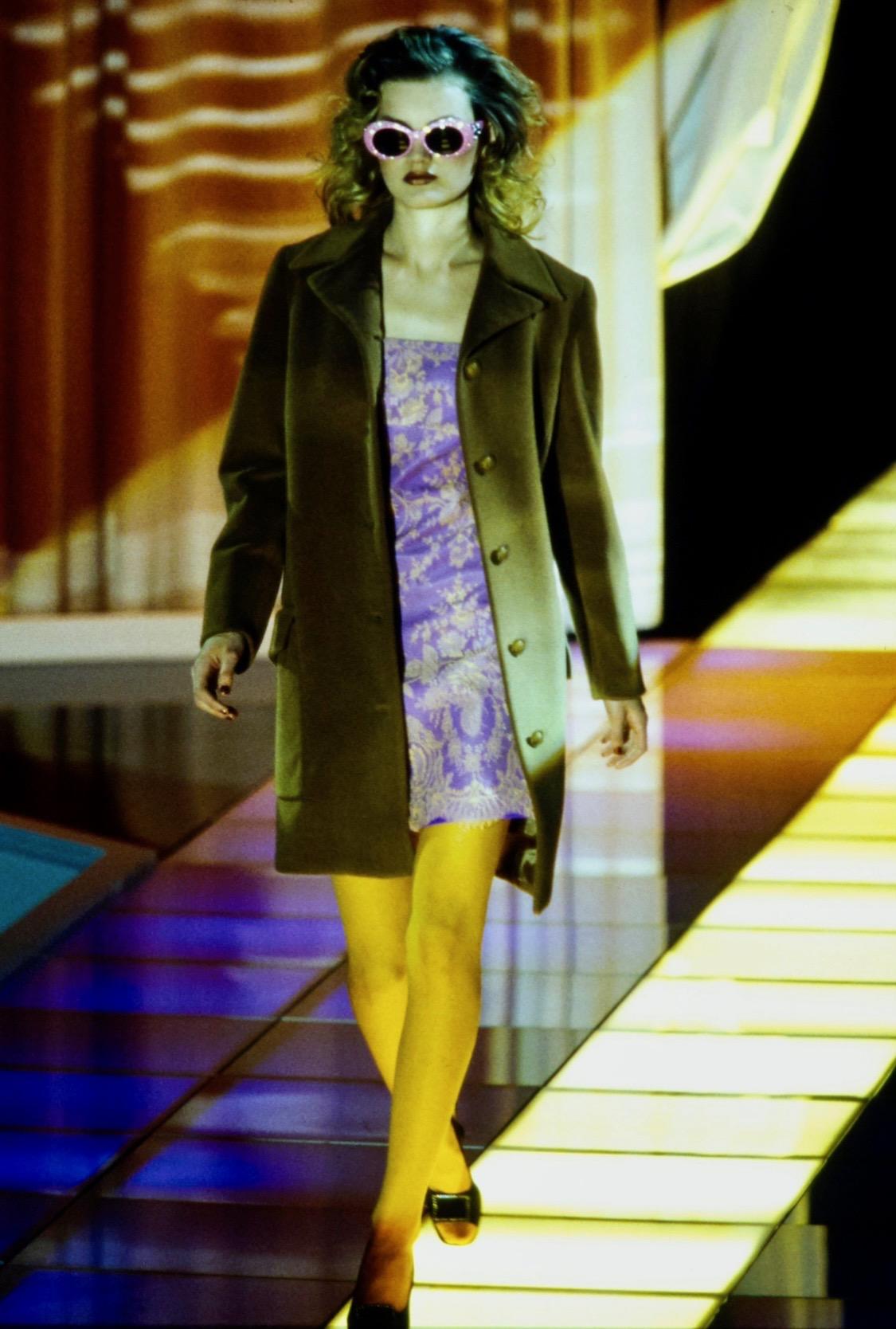 Presenting a contrasting purple and pink lace overlay mini dress designed by Gianni Versace for his Fall/Winter 1996 collection. This piece debuted in the collection's runway presentation as look number 11 on Guinevere van Seenus. The focus of this dress is the exquisite floral lacework inspired by Alençon lace from the 17th century, which contrasts beautifully with its modern cut.
