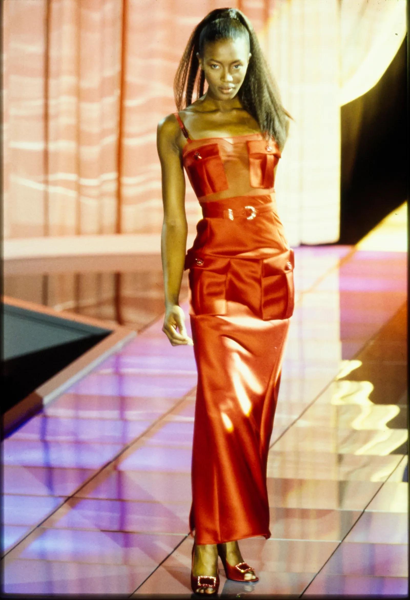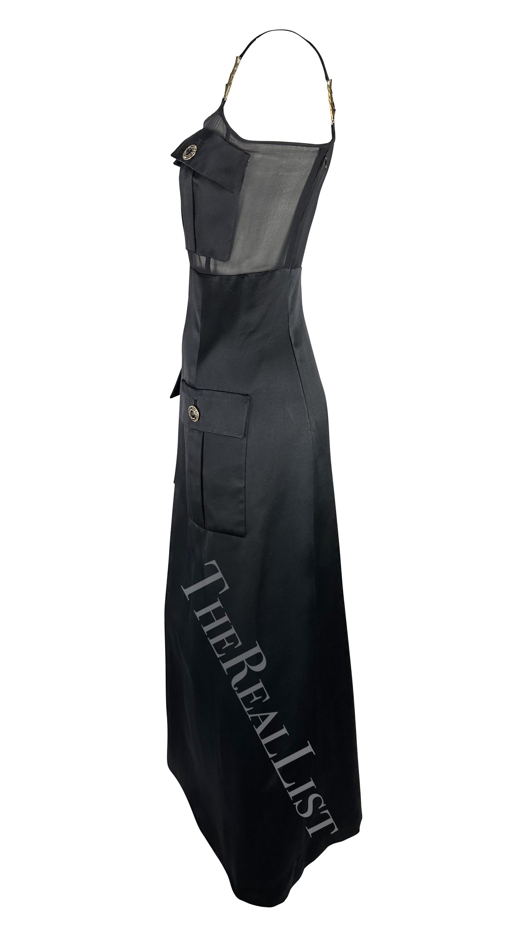 Presenting an incredible black satin Gianni Versace gown, designed by Gianni Versace. From the Fall/Winter 1996 collection, a belted version of this dress debuted in red on the season's runway modeled by Naomi Campbell. This fabulous gown is constructed of silk satin a features a mesh panel around the bust. The dress is made complete with rhinestone accented 'V' straps and Medusa Versace relief buttons at the pockets on the hips and bust. This ultra-sexy runway gown is a must-have addition to any Versace lover's wardrobe or collection!
