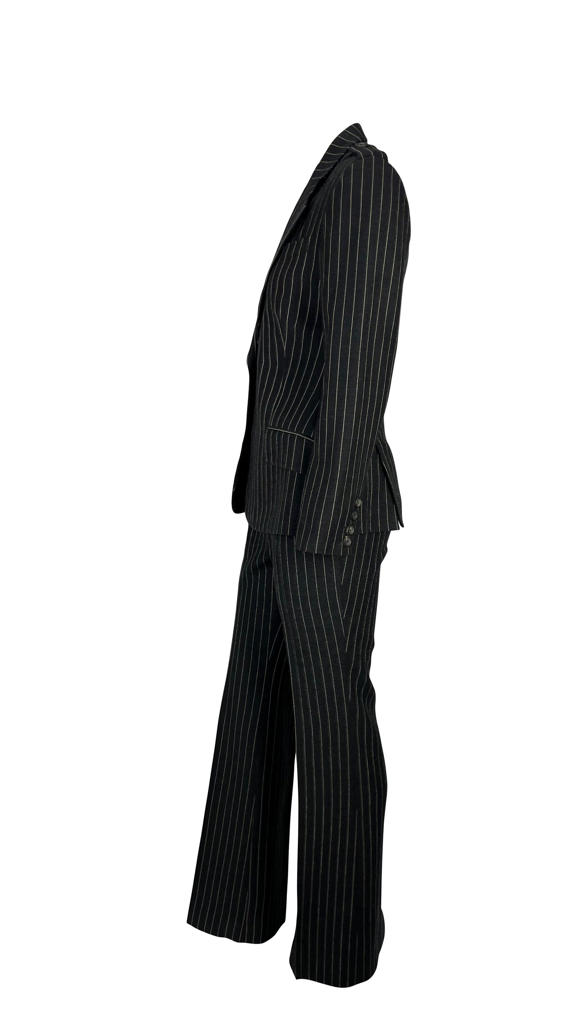 This black pinstripe suit from Gucci’s Fall/Winter 1996 collection, designed by Tom Ford, debuted on the runway as Look 16, modeled by Kylie Bax. Georgina Grenville also wore the set in the July 1996 issue of Vogue, photographed by Mario Testino, while the pants appeared in the season’s ad campaign styled with the matching coat. The ensemble consists of a military-inspired blazer paired with flare-cut trousers, showcasing Ford’s sharp tailoring and signature sensual minimalism. An iconic piece of 1990s Gucci history, this suit remains a standout addition to any collection.