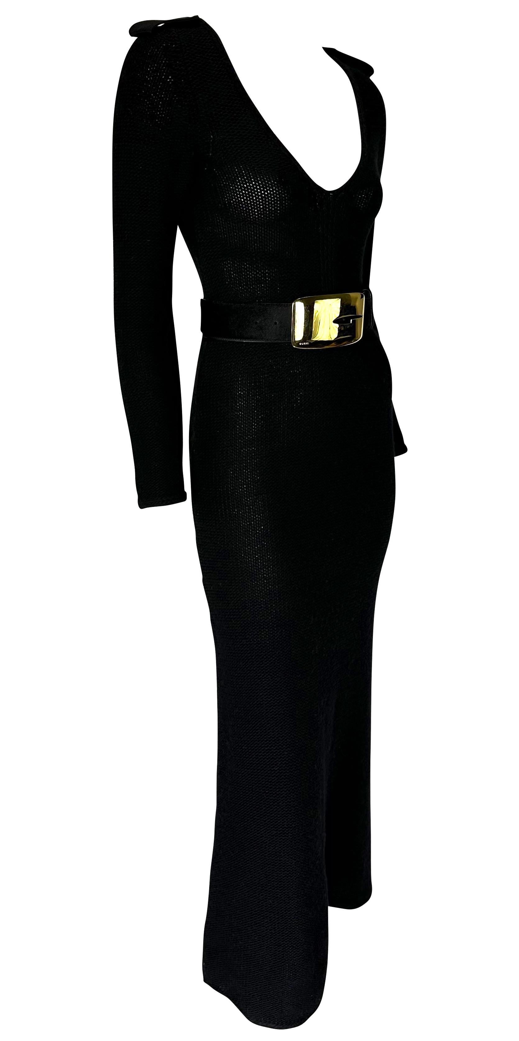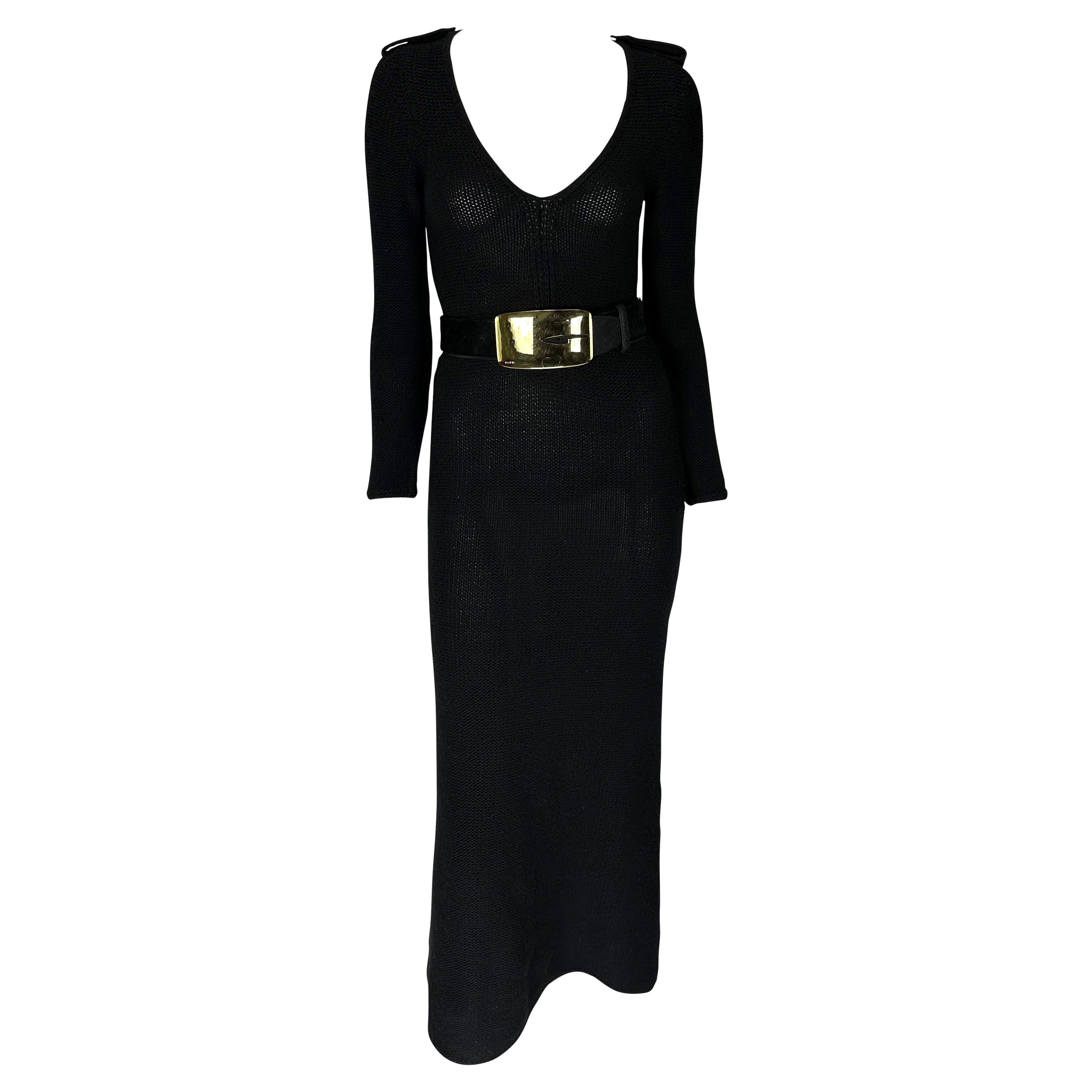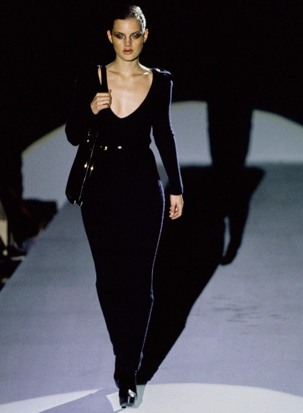 This black knit cashmere gown with matching belt from Gucci’s Fall/Winter 1996 collection was designed by Tom Ford. The ensemble debuted on the runway as Look 19, modeled by Guinevere Van Seenus, and was later featured in the season’s ad campaign on Georgina Grenville, photographed by Mario Testino. Crafted entirely from knit cashmere, the full-length gown is defined by a plunging neckline, long sleeves, and structured epaulets. The coordinating belt, finished with a black pony hair strap and oversized abstract gold-tone buckle, completes the look. A documented and iconic design, it exemplifies Ford’s sensual and daring vision for Gucci in the 1990s.