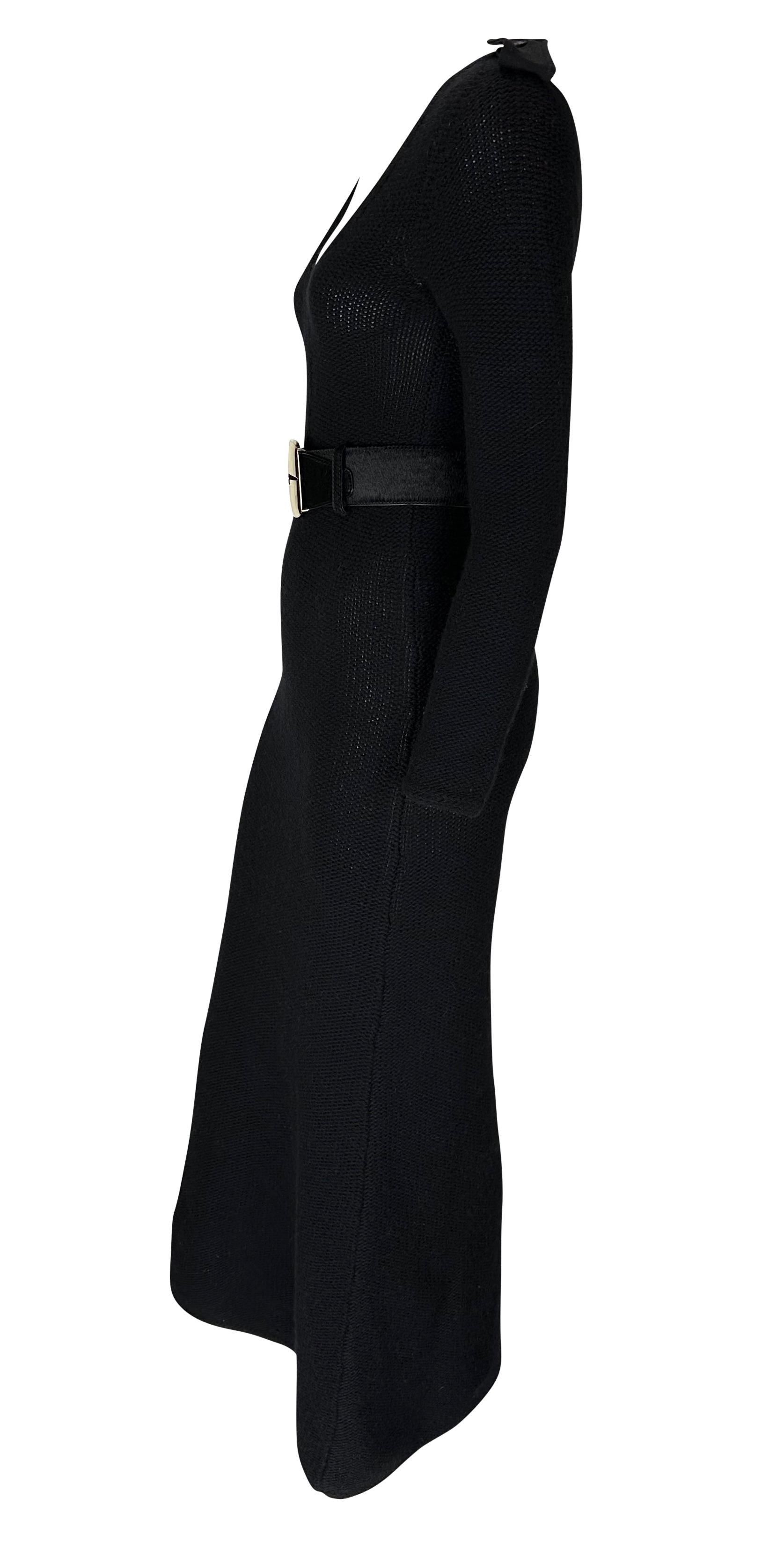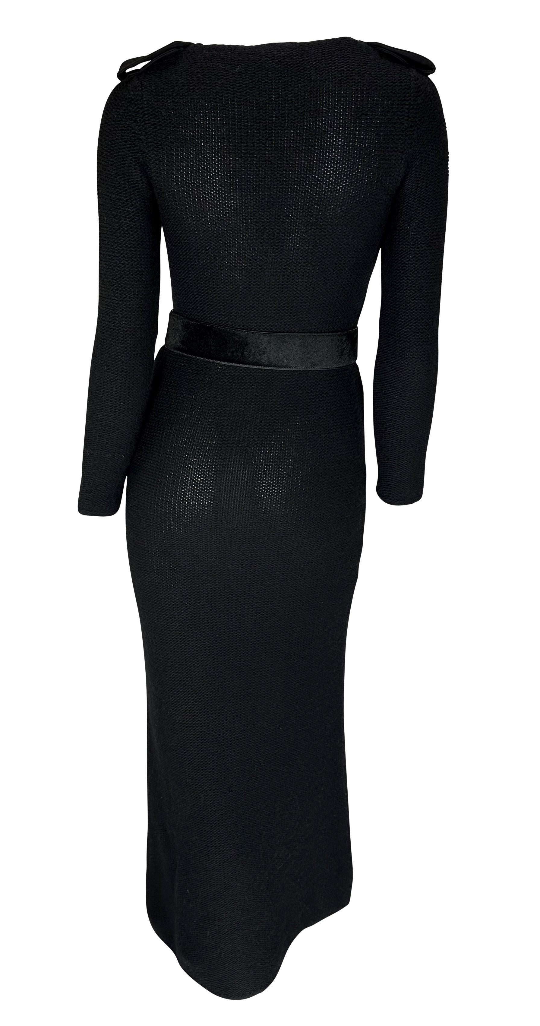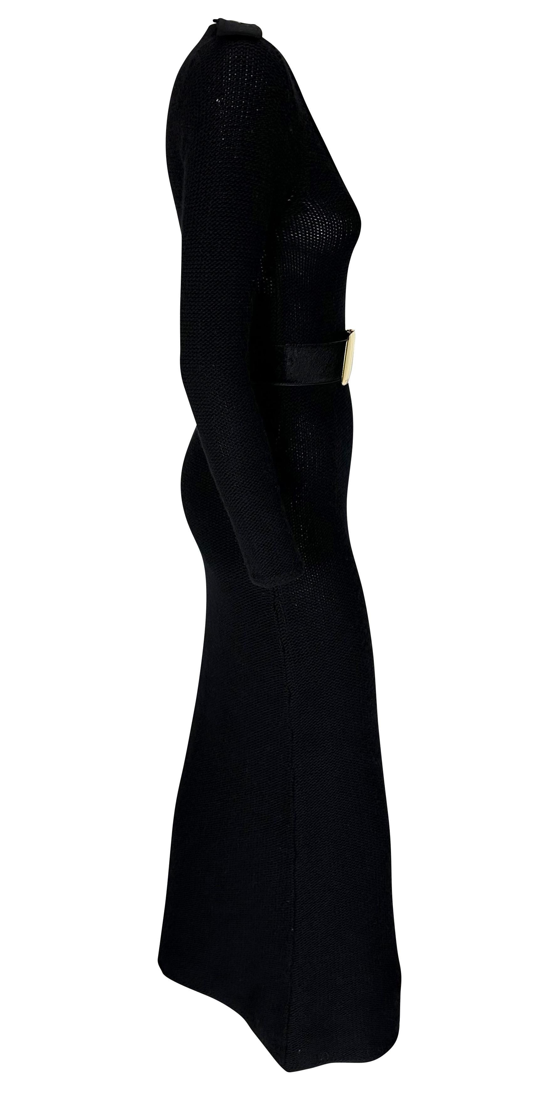 This black knit cashmere gown with matching belt from Gucci’s Fall/Winter 1996 collection was designed by Tom Ford. The ensemble debuted on the runway as Look 19, modeled by Guinevere Van Seenus, and was later featured in the season’s ad campaign on Georgina Grenville, photographed by Mario Testino. Crafted entirely from knit cashmere, the full-length gown is defined by a plunging neckline, long sleeves, and structured epaulets. The coordinating belt, finished with a black pony hair strap and oversized abstract gold-tone buckle, completes the look. A documented and iconic design, it exemplifies Ford’s sensual and daring vision for Gucci in the 1990s.