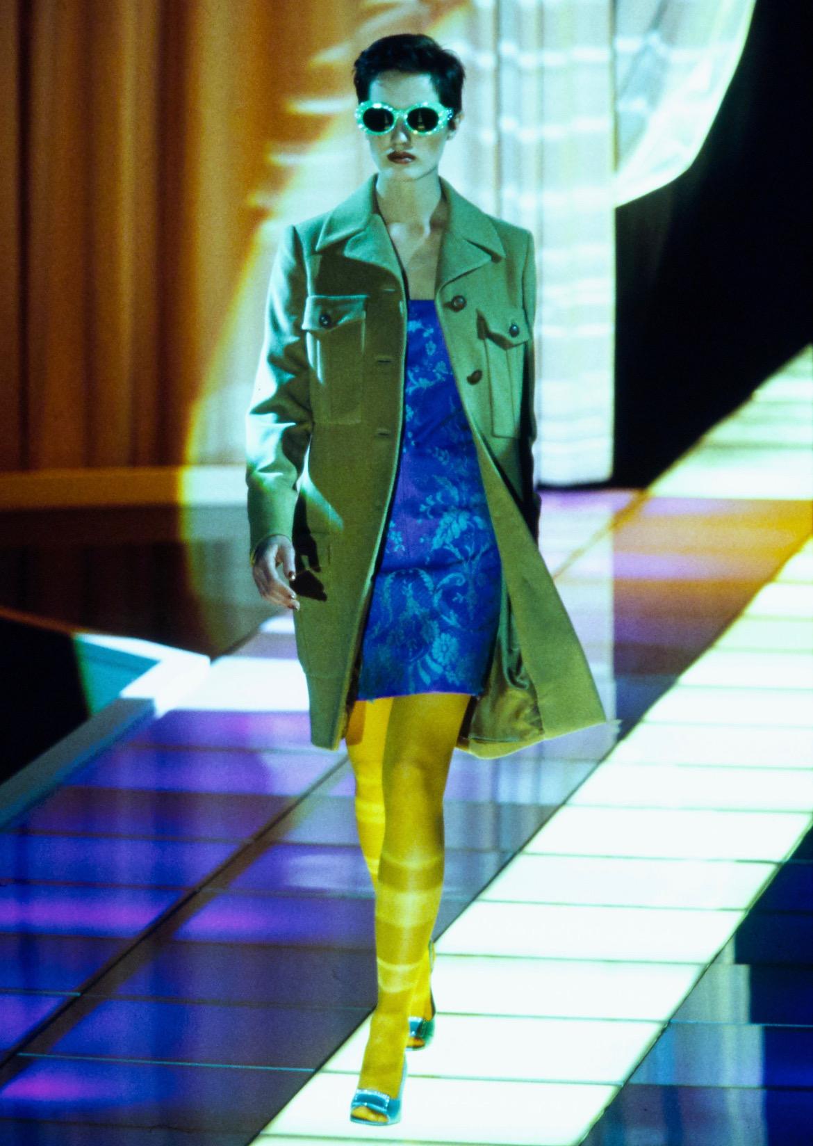 Presenting a pair of baby blue open-toe Gianni Versace heels, designed by Gianni Versace. From the Fall/Winter 1996 collection, these heels debuted as part of look 9 on the season's runway modeled by Trish Goff and were also part of looks 10, 43, 45, 49, and 74. These stunning shoes are 'new old stock' and have never been worn. The heels are made complete with a rectangular rhinestone applique. Grab these brand-new heels from Gianni's runway collection!