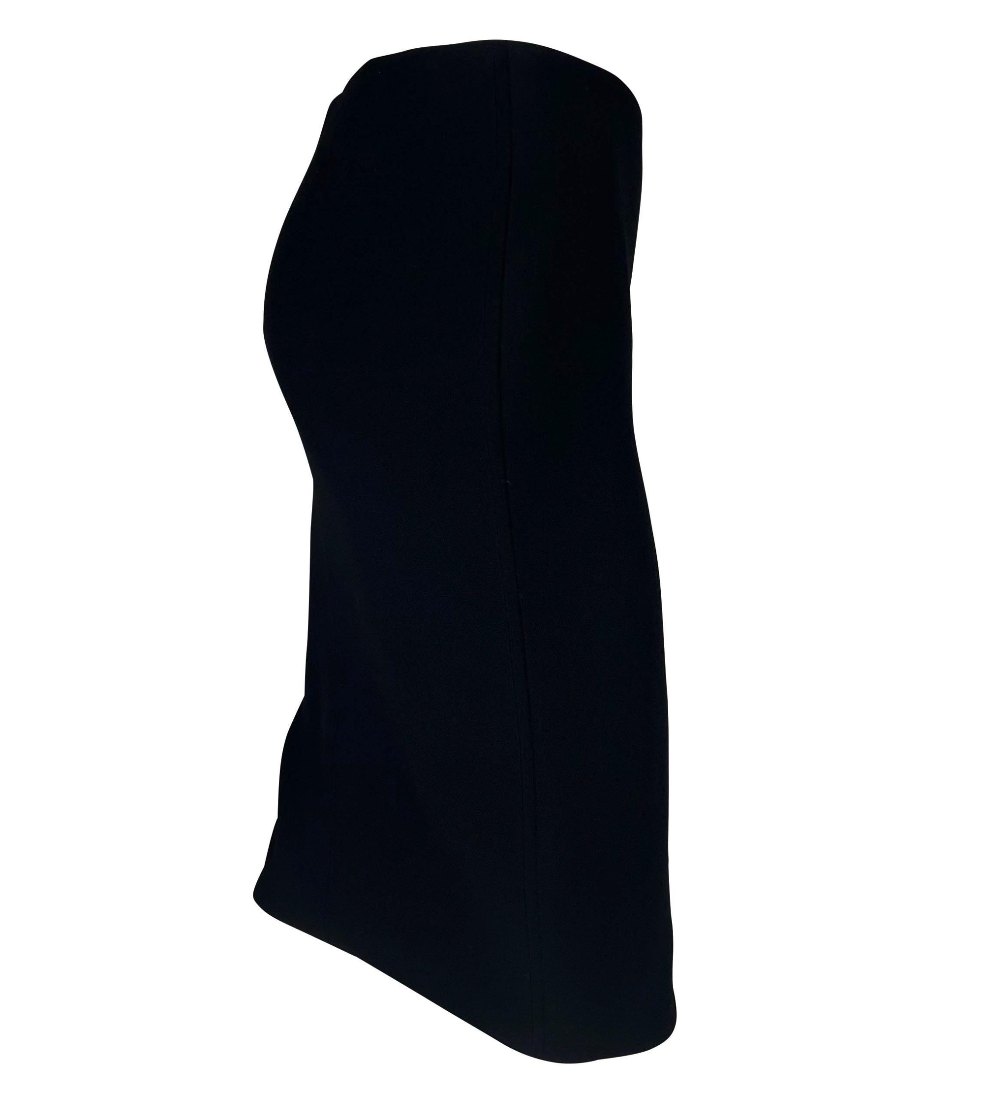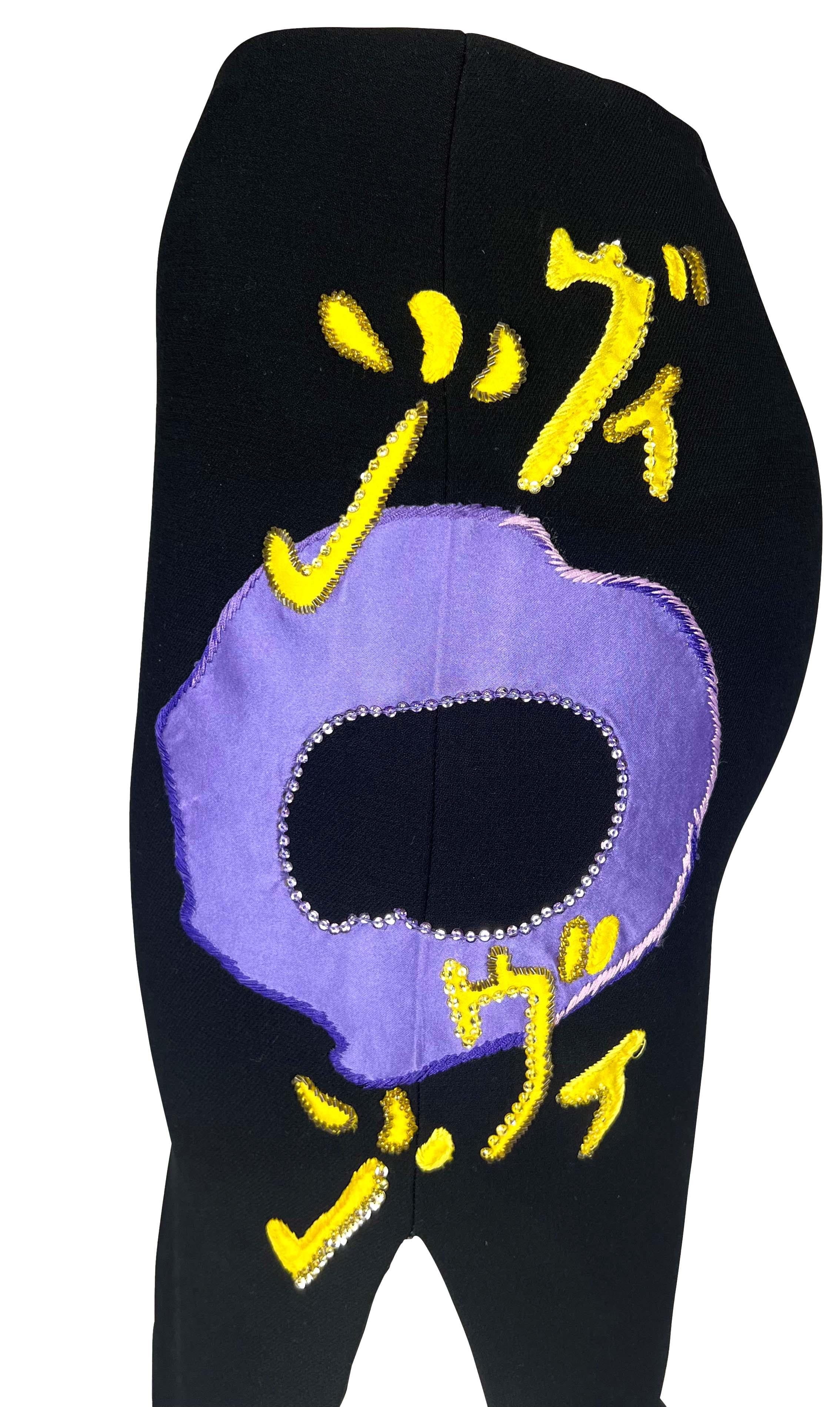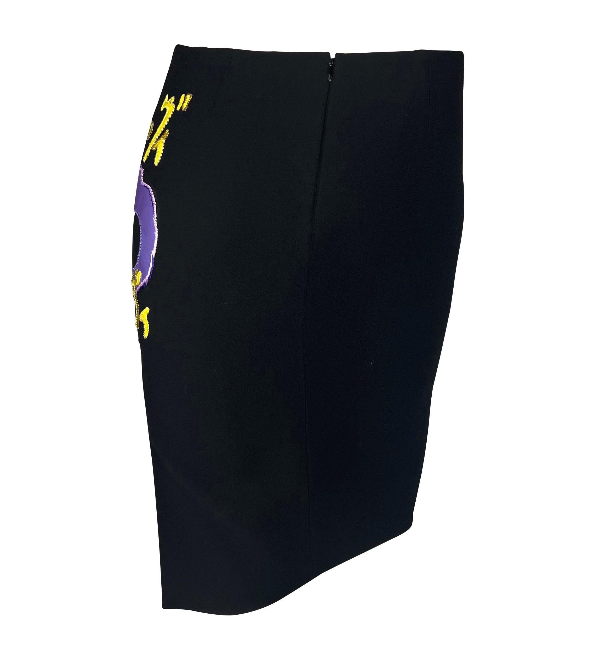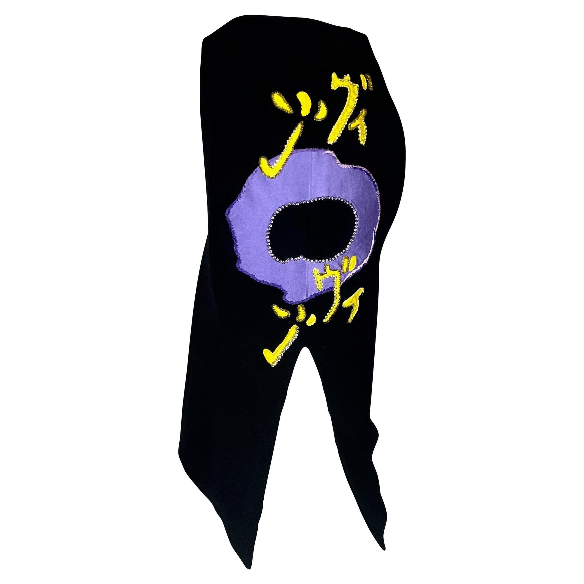 Presenting a rare beaded satin appliqué skirt designed by Gianni Versace for his Fall/Winter 1997 Atelier Versace Haute Couture collection. Part of his last ever couture collection, this piece features the Japanese influences that were prominently featured in the runway presentation. Pieces of yellow silk satin were applied with a rhinestone beaded trim to create a "GV" monogram in Japanese characters. A skirt with similar appliqués debuted as part of look 29 on Elsa Benitez. Check out our storefront for more vintage Atelier Versace!