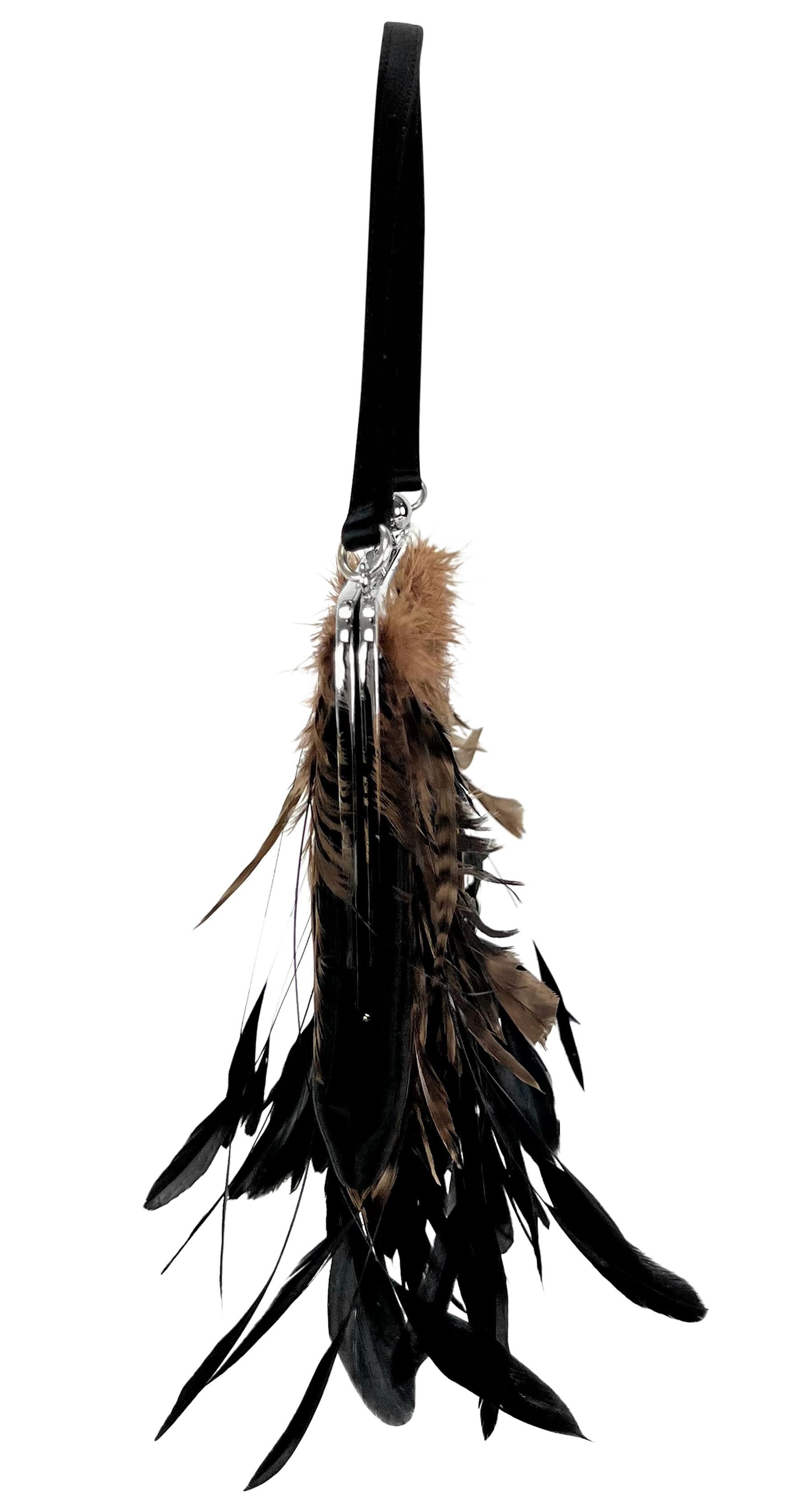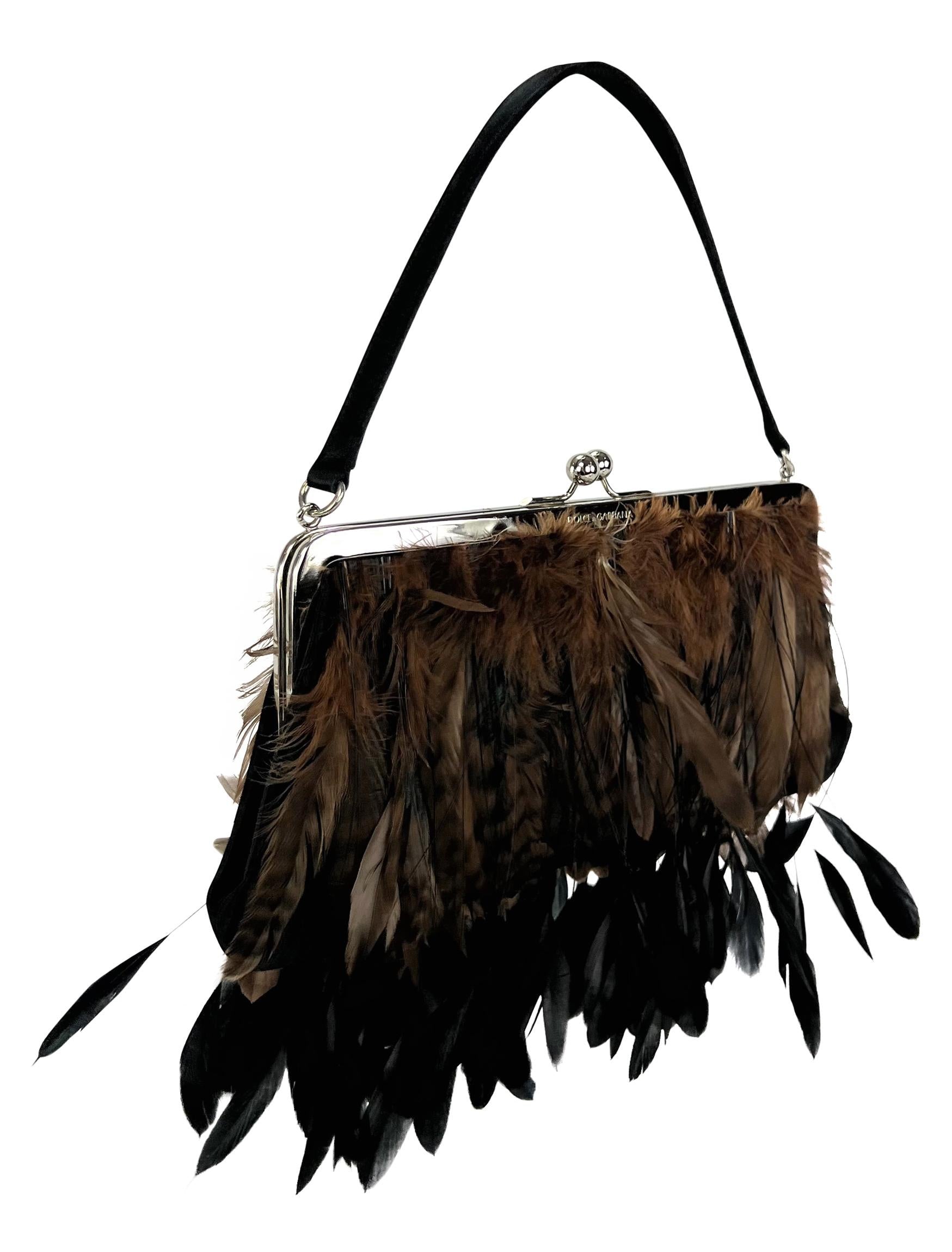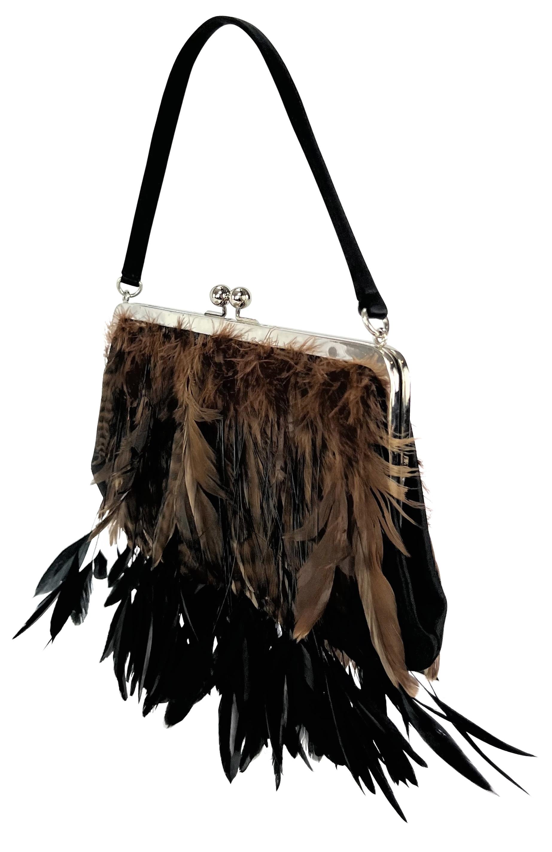 This black satin and brown feather evening bag from Dolce & Gabbana's Fall/Winter 1997 "Vatican" collection debuted on the runway. The bag features a silver-tone kiss lock closure, a black satin handle, and a body adorned with a striking mix of long and short feathers. A perfect accessory for special events, this piece embodies Dolce & Gabbana's timeless elegance.