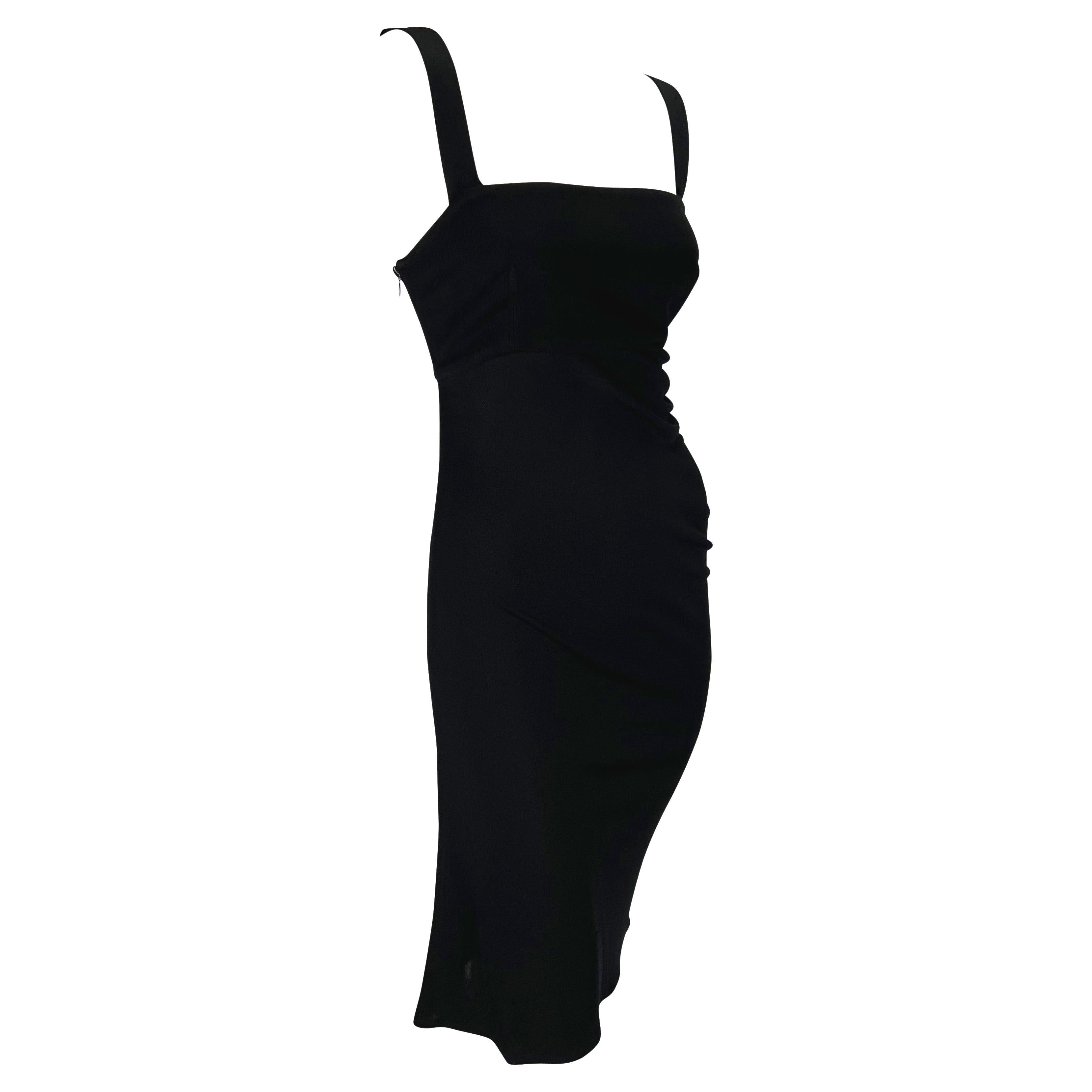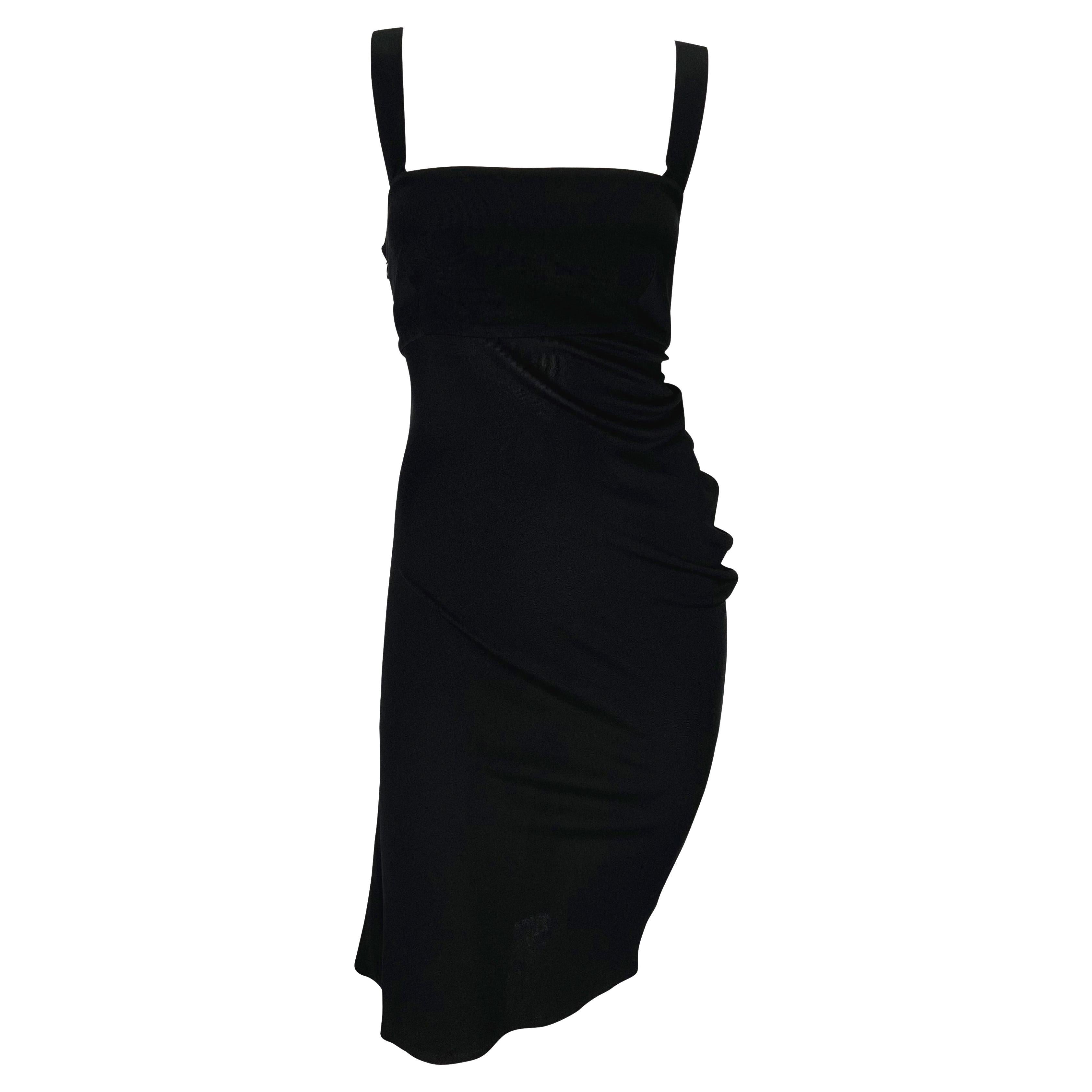 This black cocktail dress from Gianni Versace’s Fall/Winter 1997 collection was designed by Gianni Versace. The minimalist design features wide straps, a square neckline, and an asymmetrical cut that drapes elegantly to one side. A sleek interpretation of the little black dress, it reflects the pared-back sensibility of Versace’s final collection.
