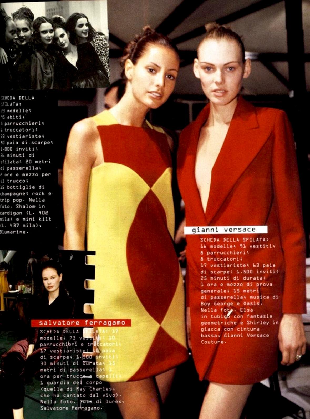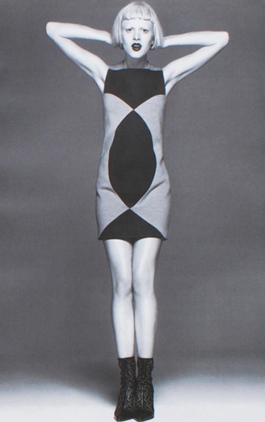 This Gianni Versace dress, designed by Gianni Versace for his final ready-to-wear collection. The dress debuted as runway look 17, modeled by Elsa Benitez and appeared in the season's ad campaign on Karen Elson, captured by Richard Avedon. This 60's mod style dress showcases a bold geometric pattern in red and mustard yellow with a sleeveless silhouette and a square neckline.