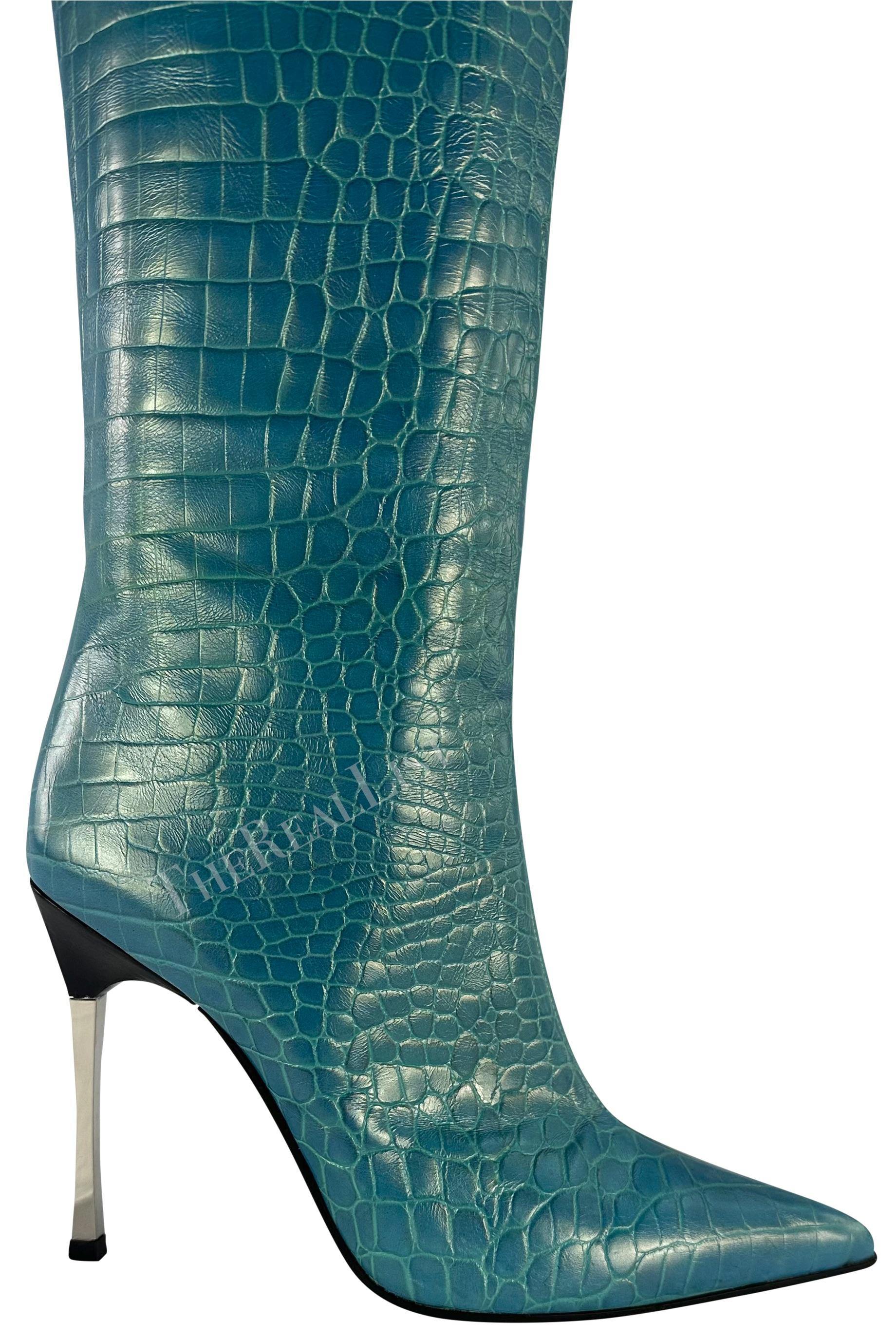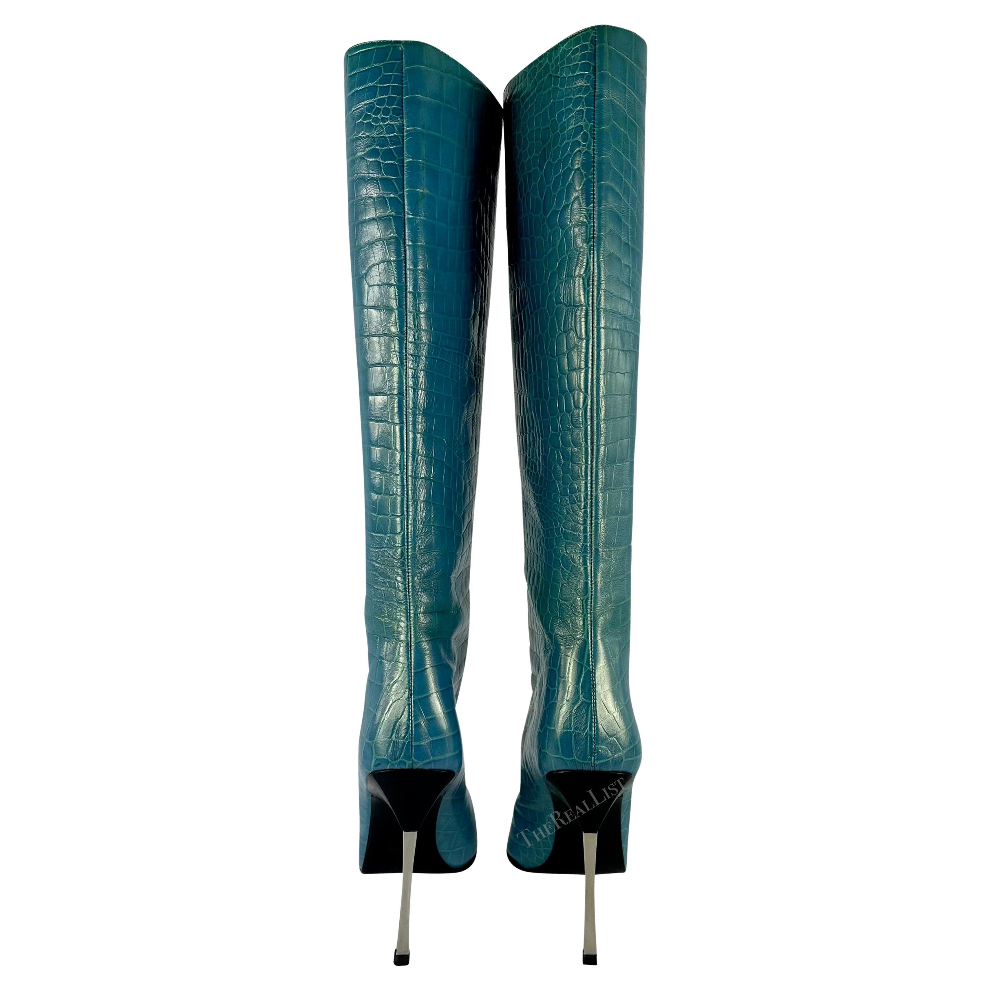 Tom Ford designed these divine metallic blue crocodile embossed leather boots for his Fall/Winter 1997 Gucci collection. The more common variations of these tall boots were highlighted in the season's ad campaign. These barely worn heels feature a pointed toe and silver metal heel peg. A rare find, these boots are a must-have addition to any Gucci lover's collection or wardrobe.
