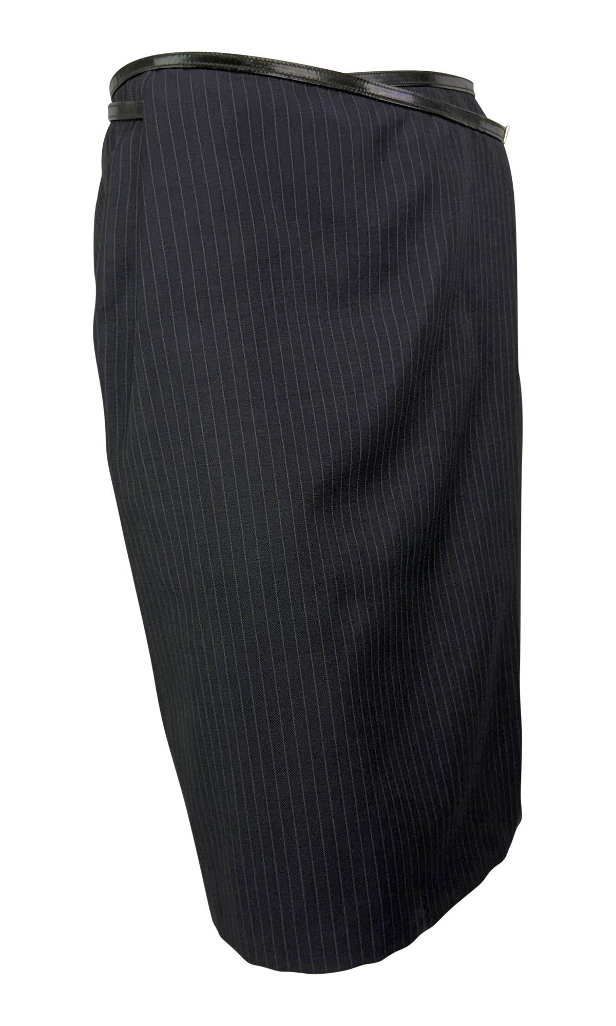 From Gucci’s Fall/Winter 1997 collection under Tom Ford, this navy pinstripe wrap skirt features an asymmetrical waistline and glossy patent leather trim. Finished with a silver-tone “G” buckle, the design debuted on the season's runway.