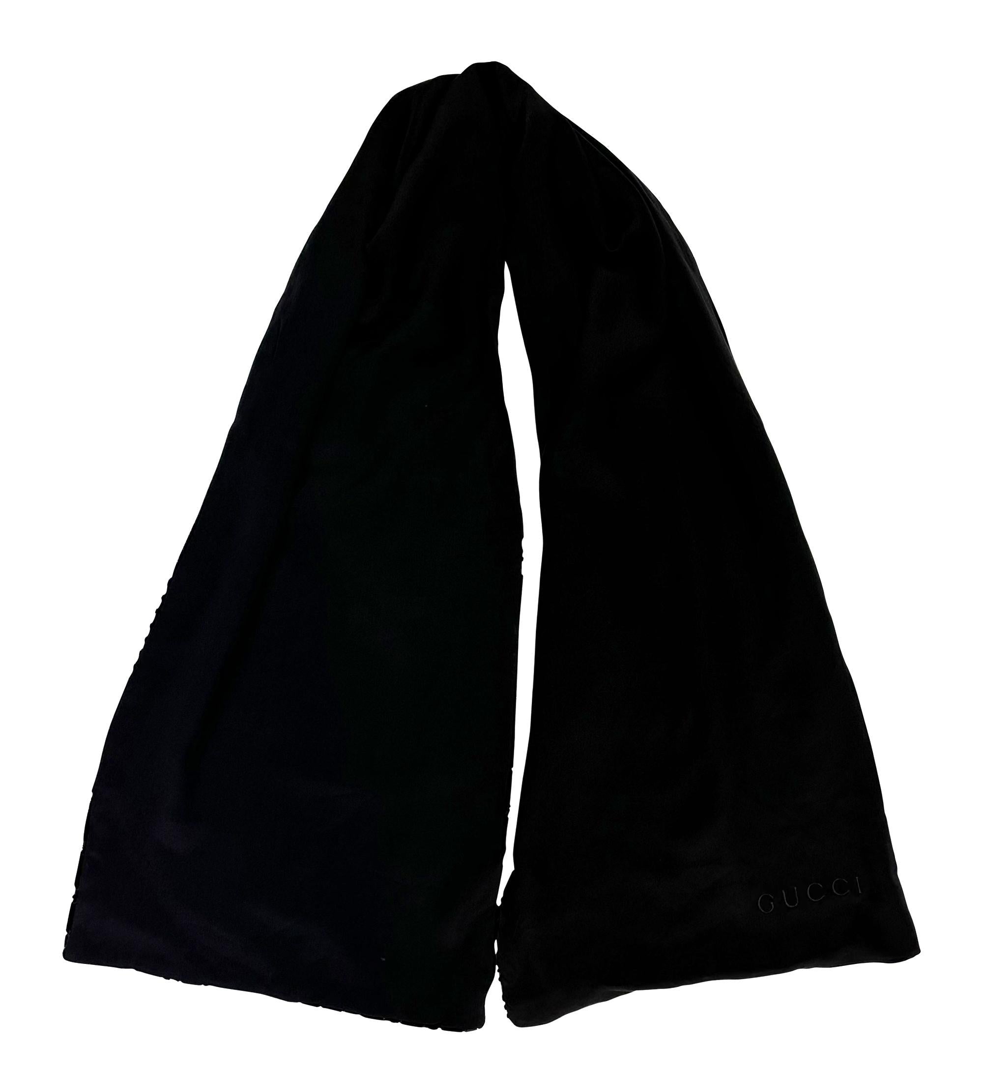 This Gucci scarf by Tom Ford from the Fall/Winter 1997 collection features patchwork velvet in navy blue panels, including the classic 'GG' monogram. A similar pattern was seen on the season's runway. Check out our storefront for the matching patchwork pants!
