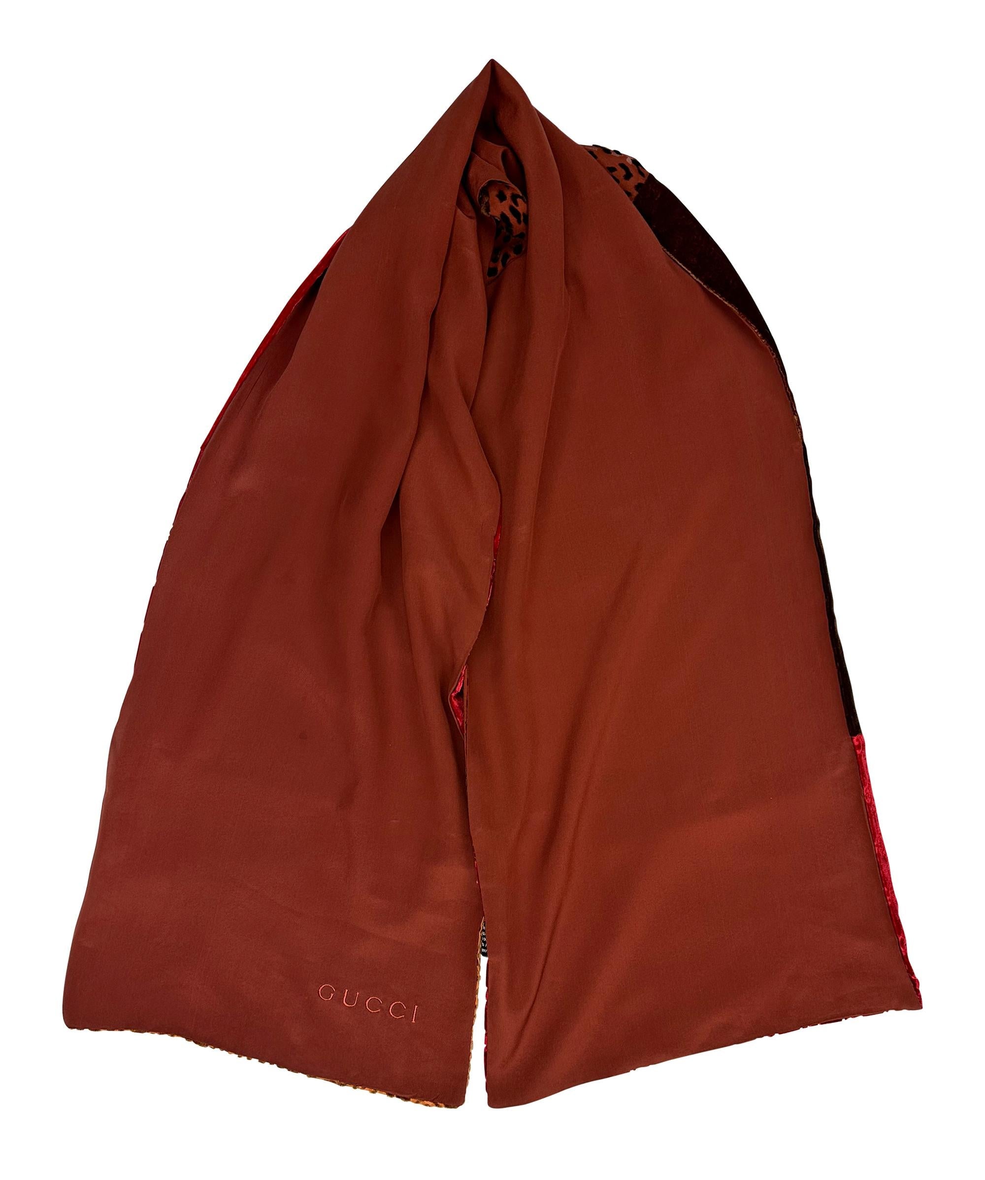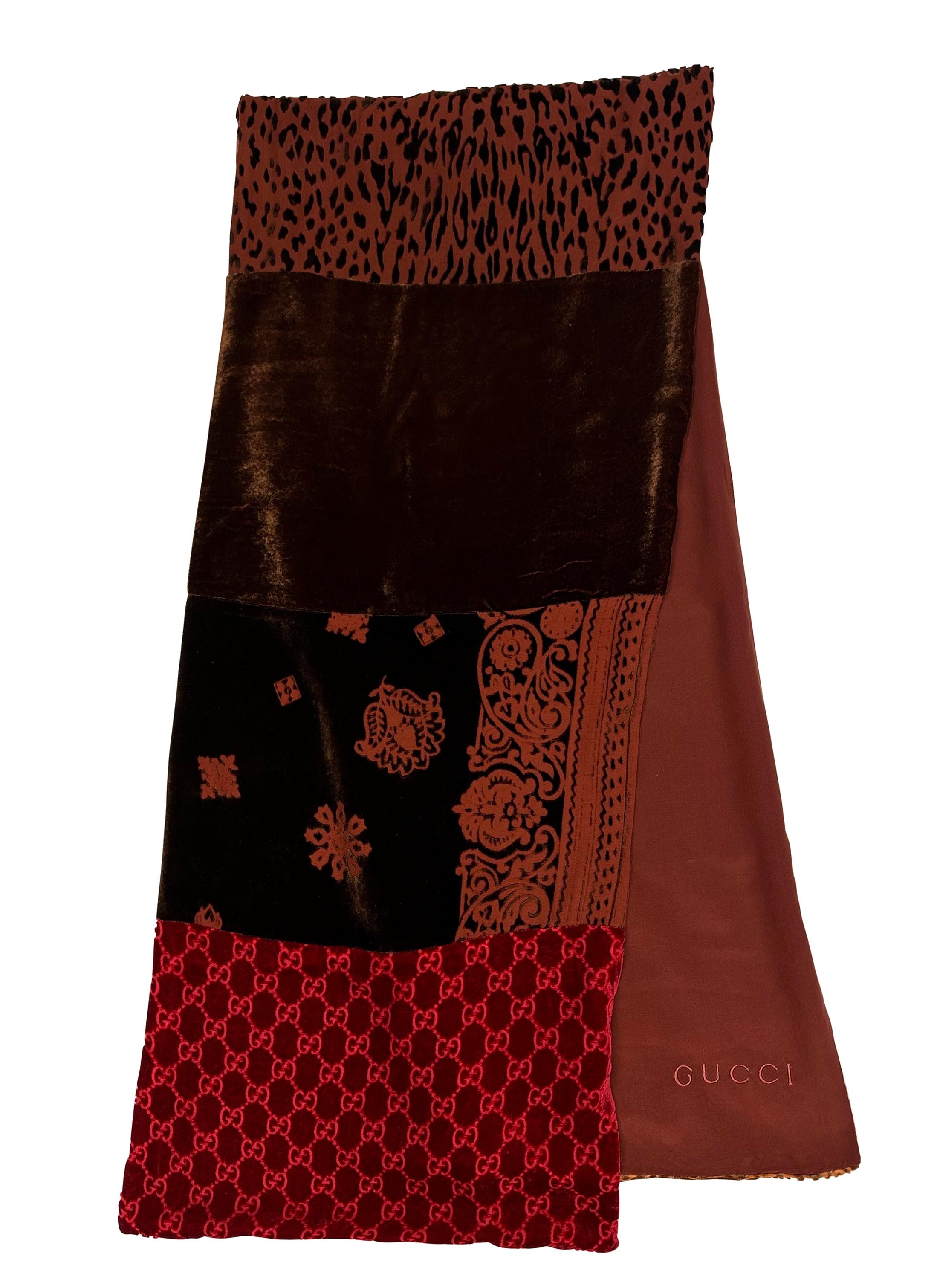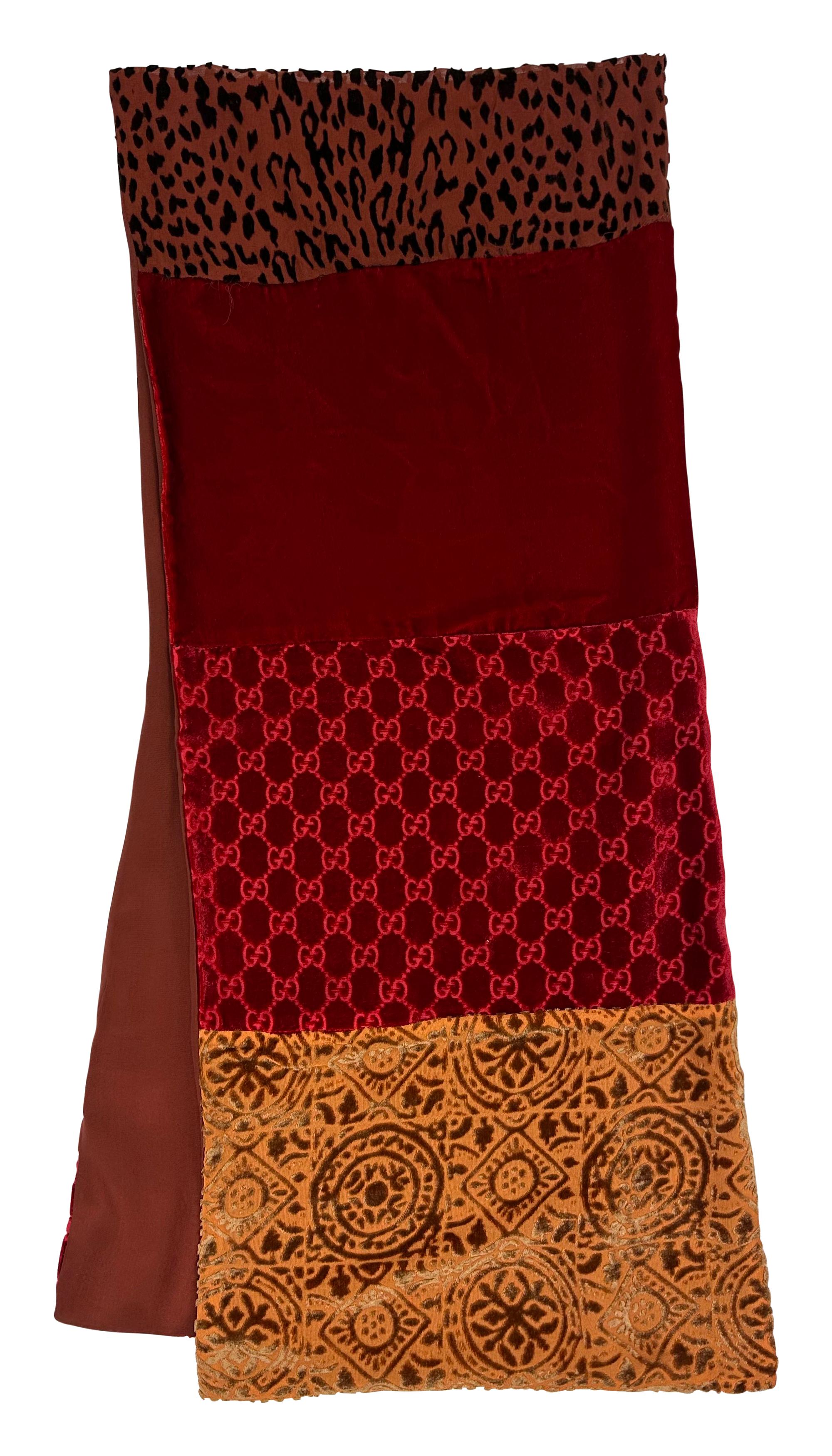 This stunning red velvet scarf featuring a patchwork of rich burgundy, red, and orange panels, including Gucci's iconic 'GG' monogram, designed by Tom Ford for the Fall/Winter 1997 collection.