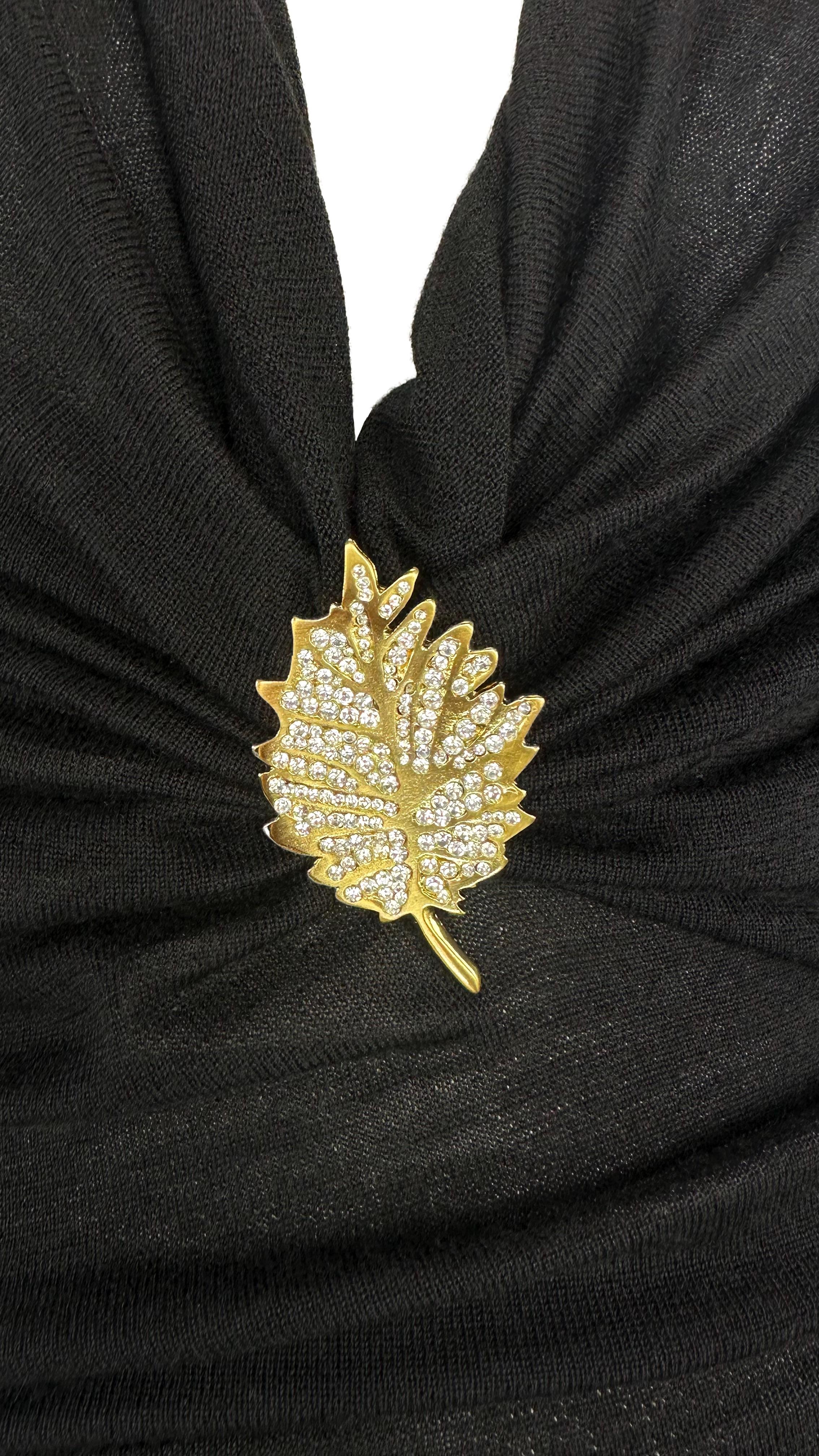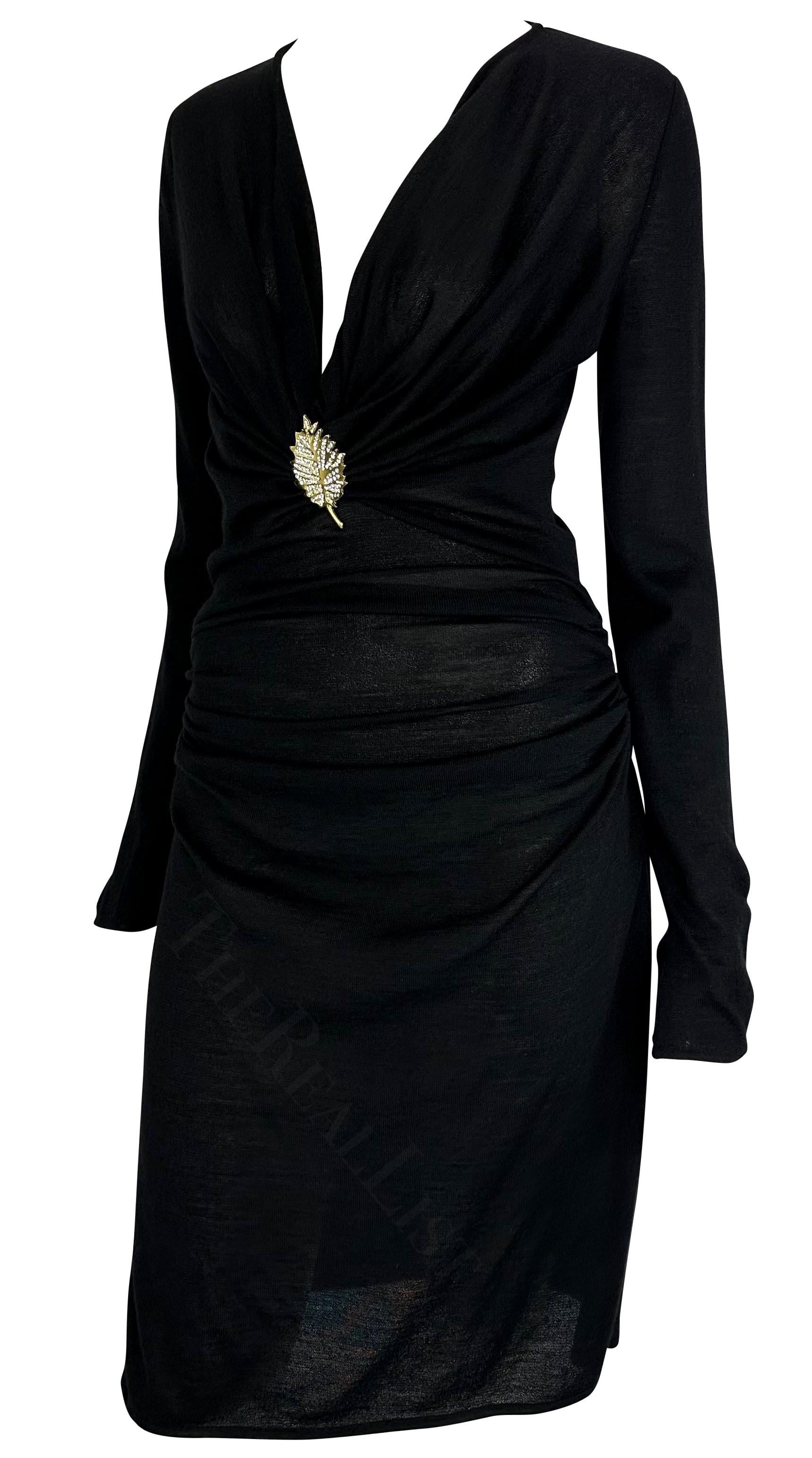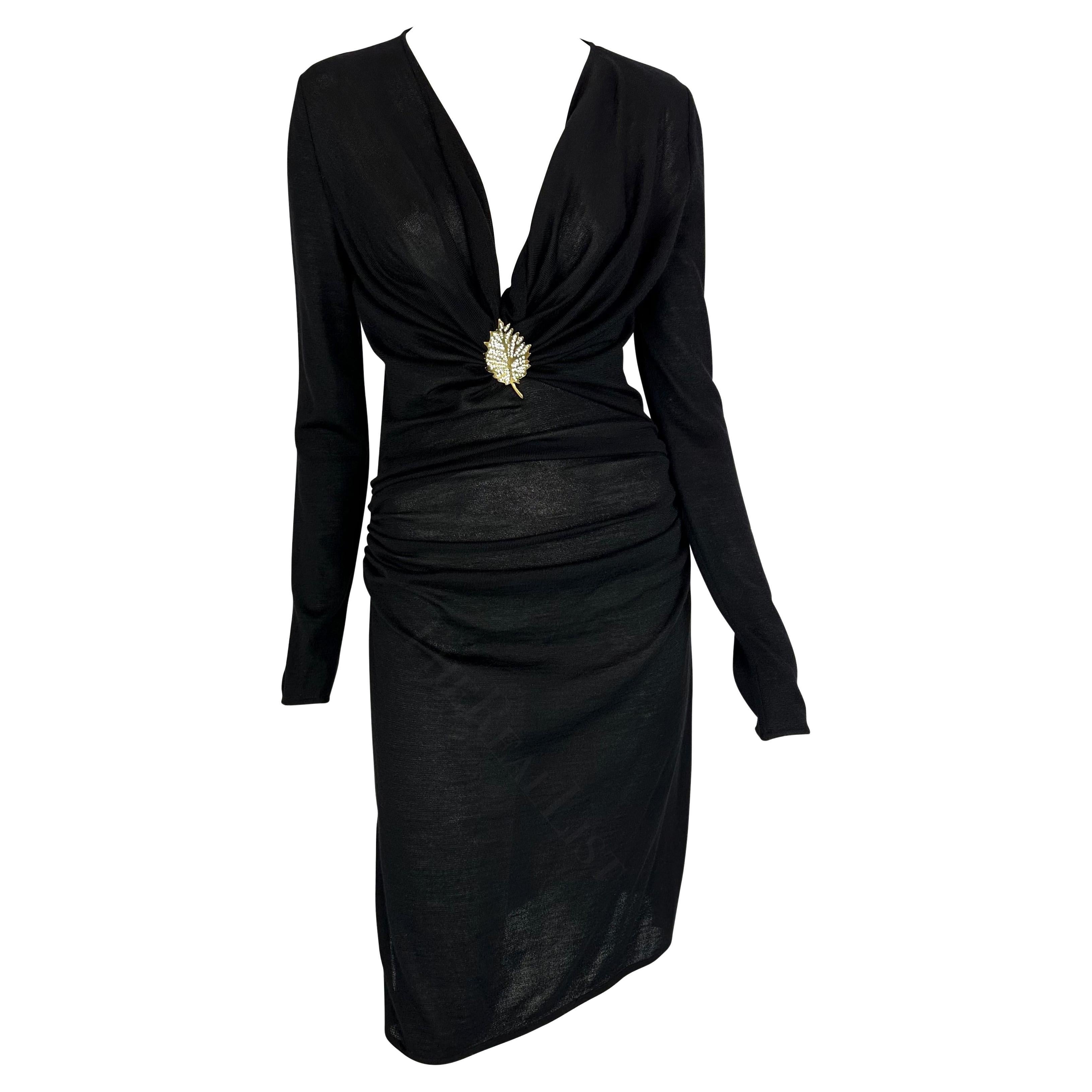 This Valentino midi dress from the Fall/Winter 1997 collection is crafted from a luxurious blend of silk, cashmere, and wool. The design features a deep V-neckline, body ruching, and a rhinestone-encrusted gold-tone leaf brooch. A mini version of the style debuted on the season’s runway, underscoring its place within the collection. An elegant example of late 1990s Valentino with a distinctly sensual edge.