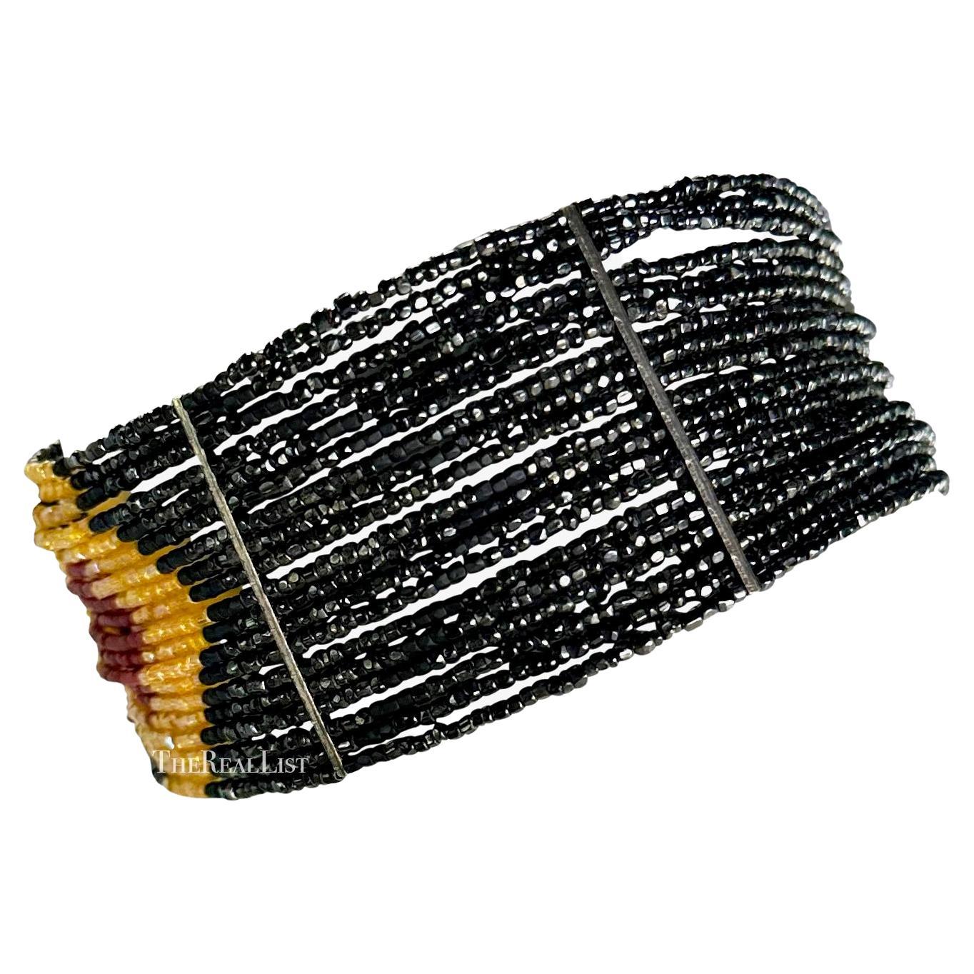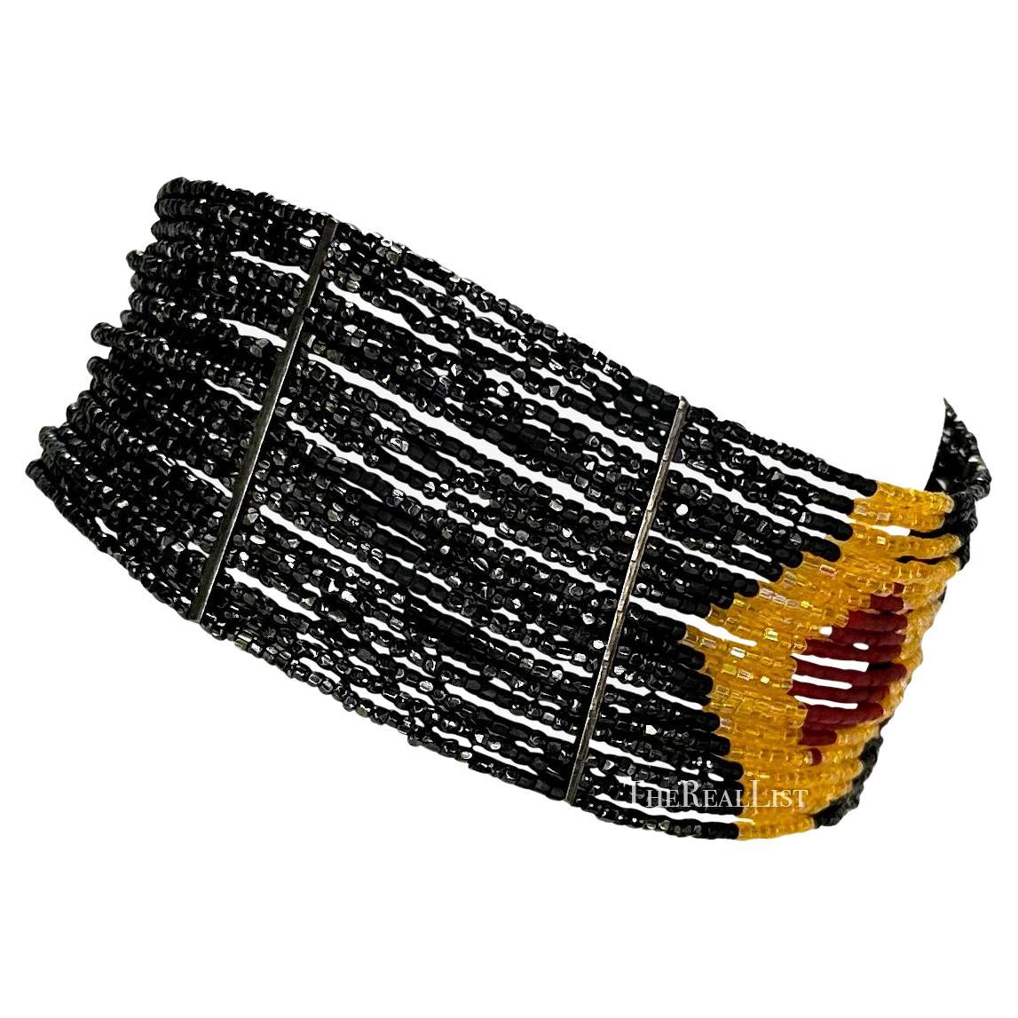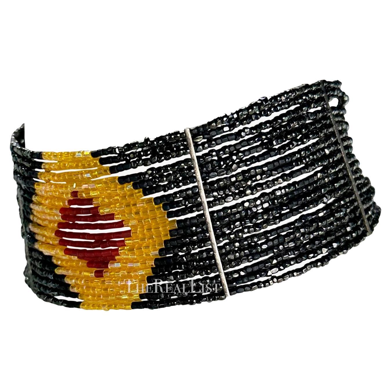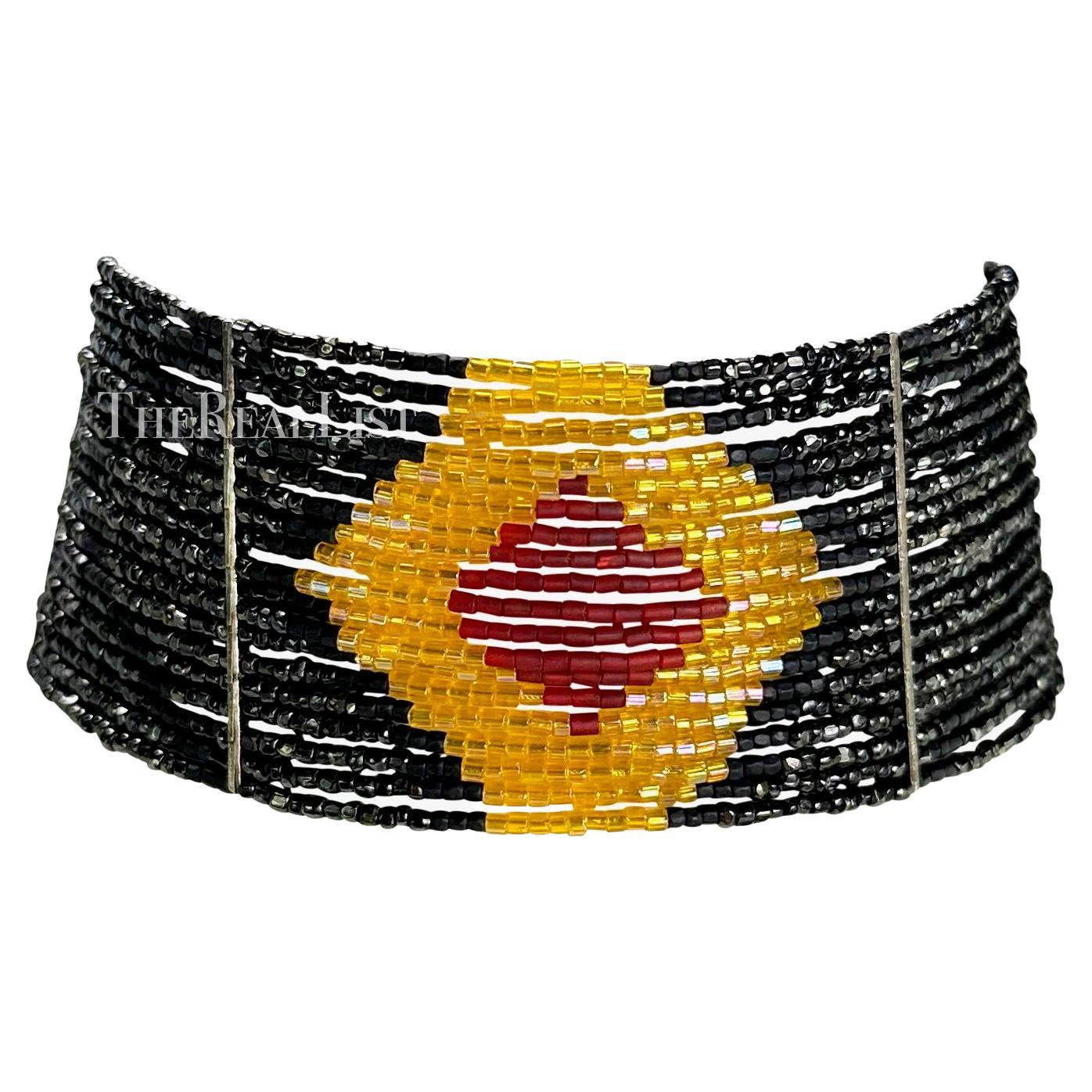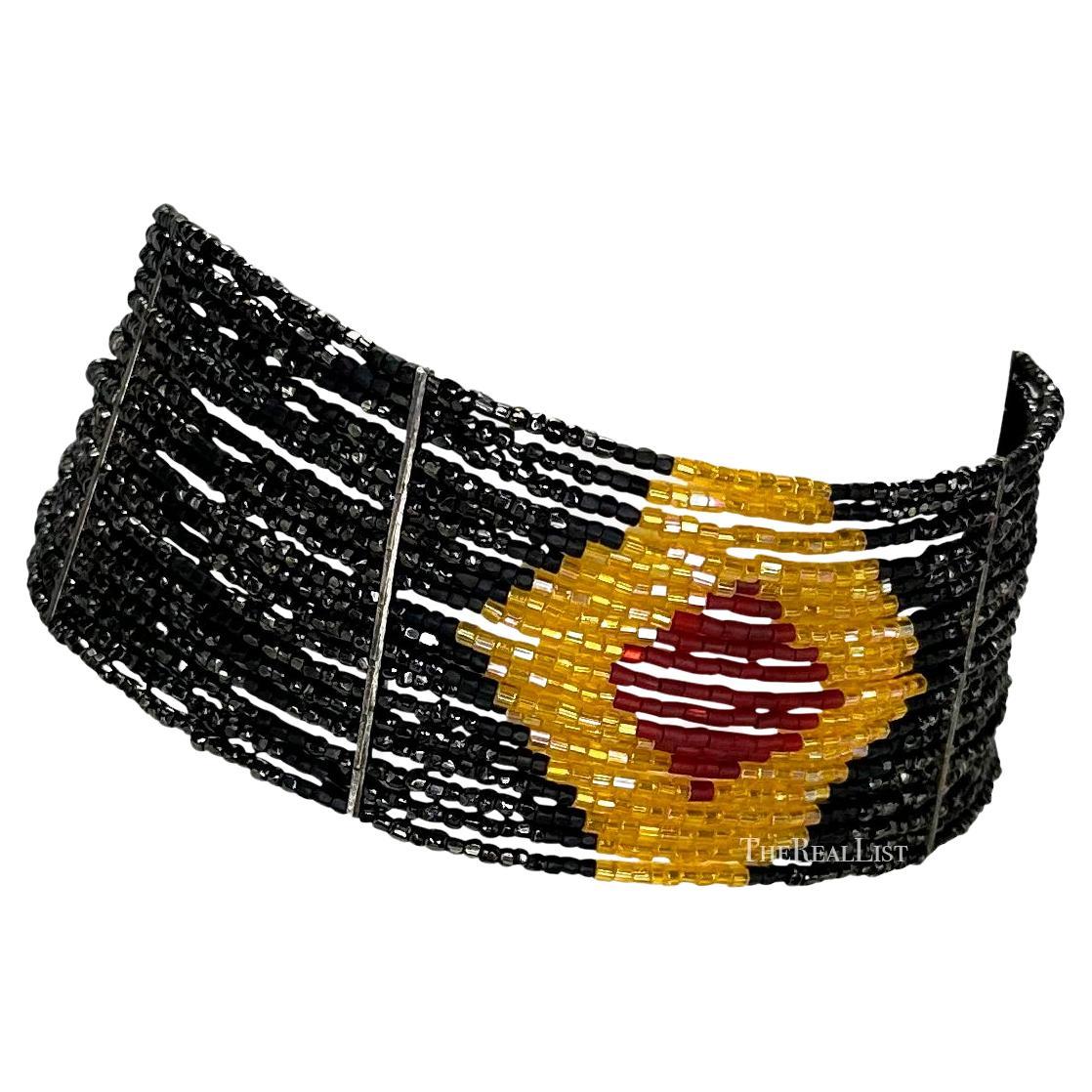 Presenting a beautiful beaded Christian Dior Masai choker, designed by John Galliano. From the Fall/Winter 1998 collection, this amazing choker features a red and yellow diamond pattern and is made complete with a gunmetal hook closure. This pattern appeared in multiple variations on the season's runway. The matching bracelet is also available.