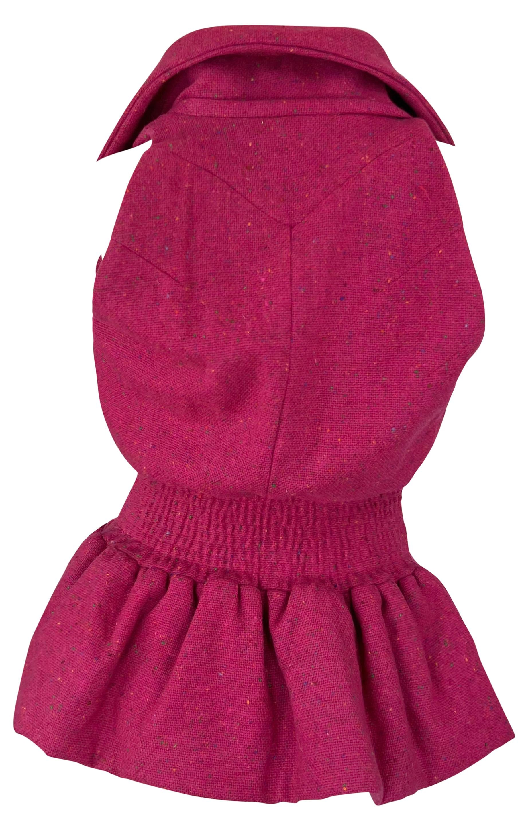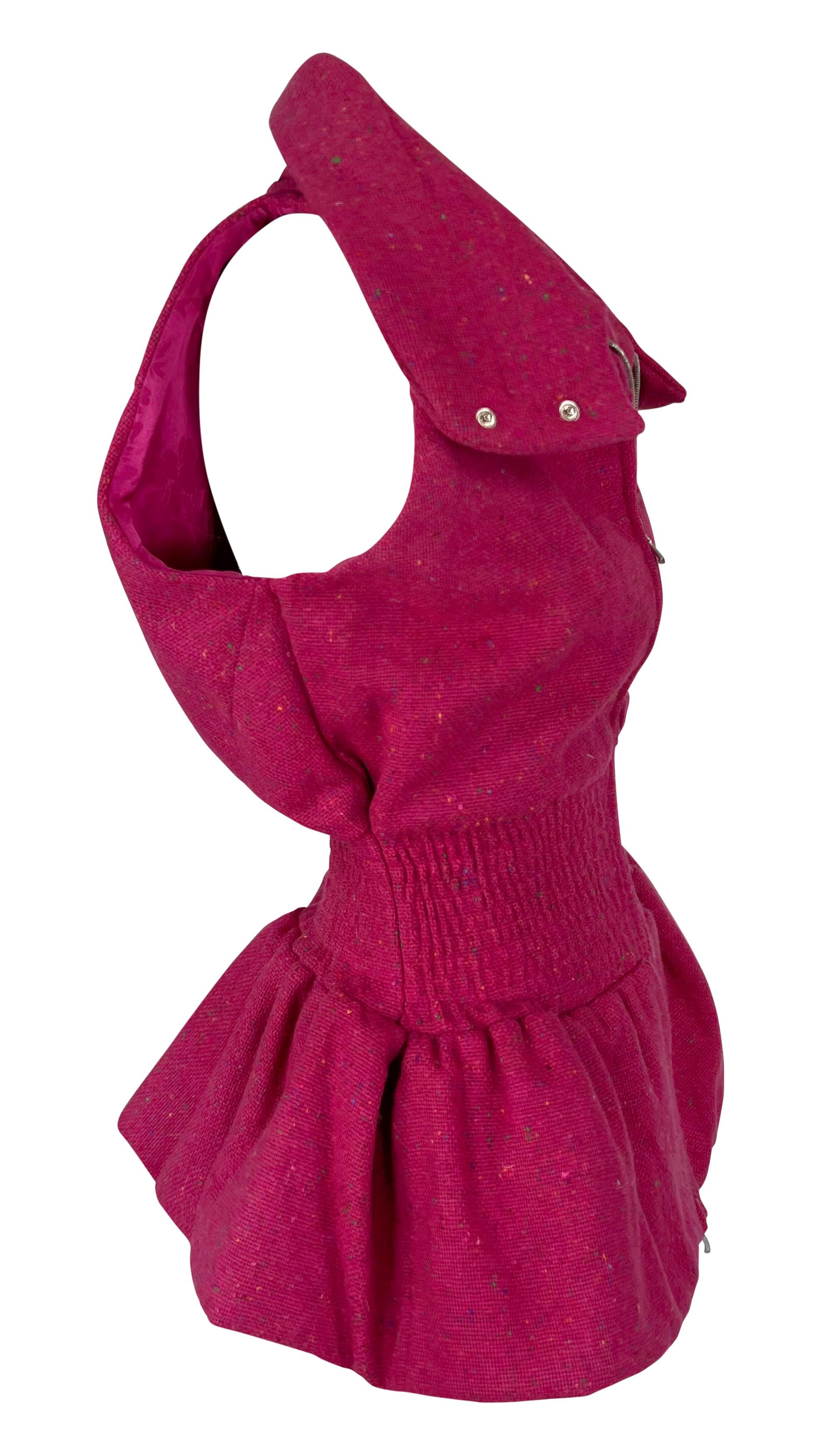 This Christian Dior by John Galliano gilet from the Fall/Winter 1998 collection is crafted from vibrant pink tweed with subtle multicolor flecks. The vest design features a high funnel neck with silver-tone button closures, a full front zip, and a cinched waist for a fitted silhouette. A peplum hem adds a structured, feminine flair to this fabulous Galliano for Dior piece.