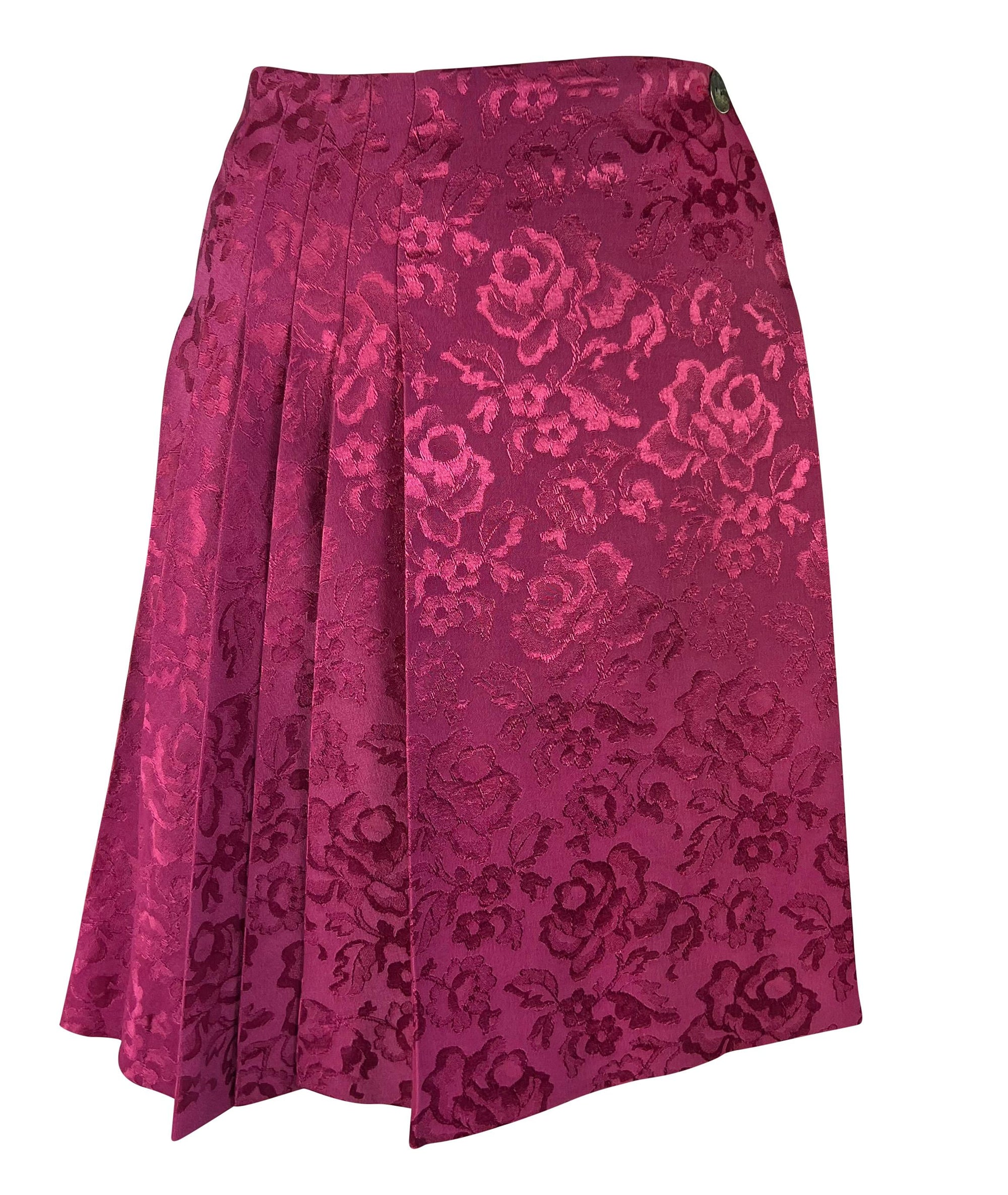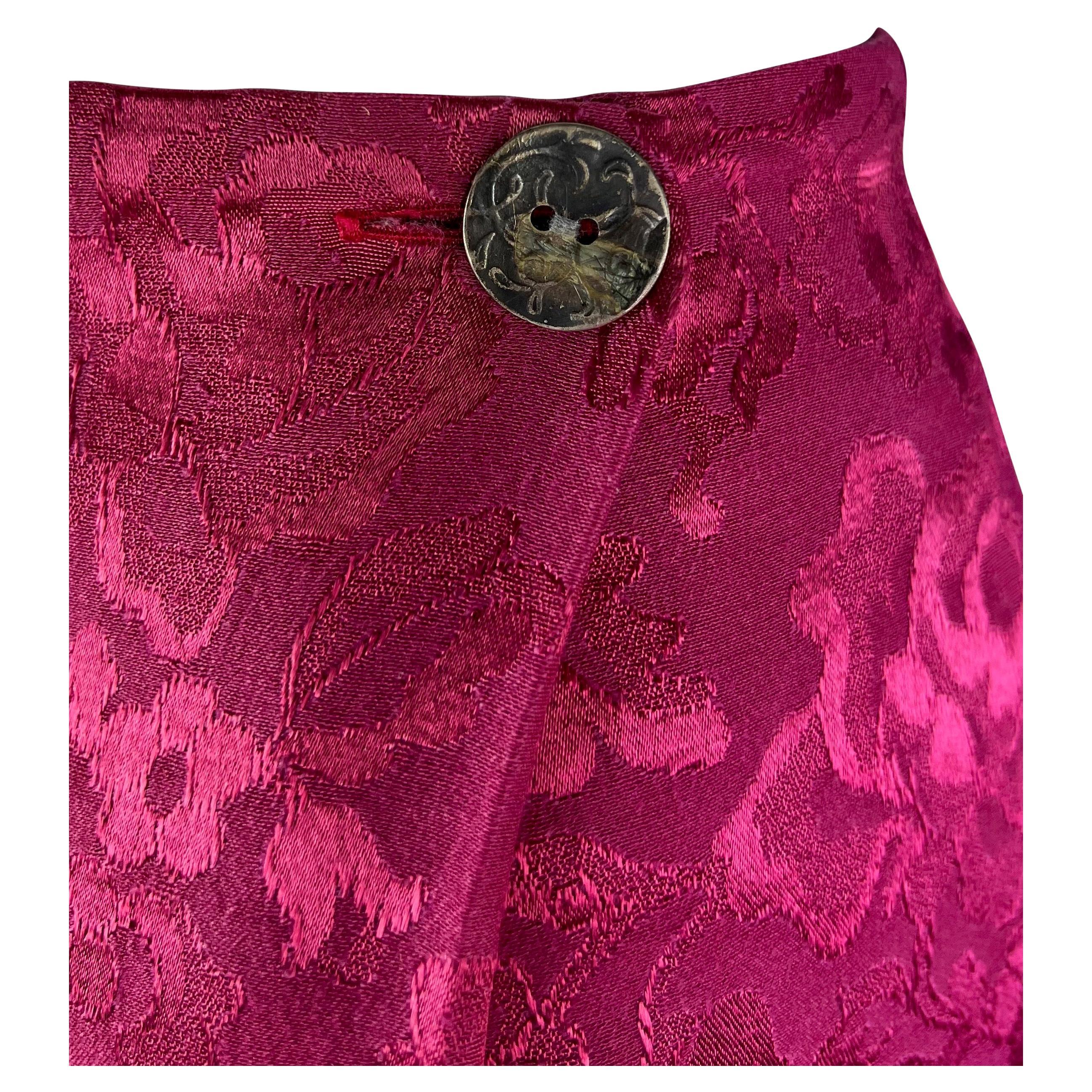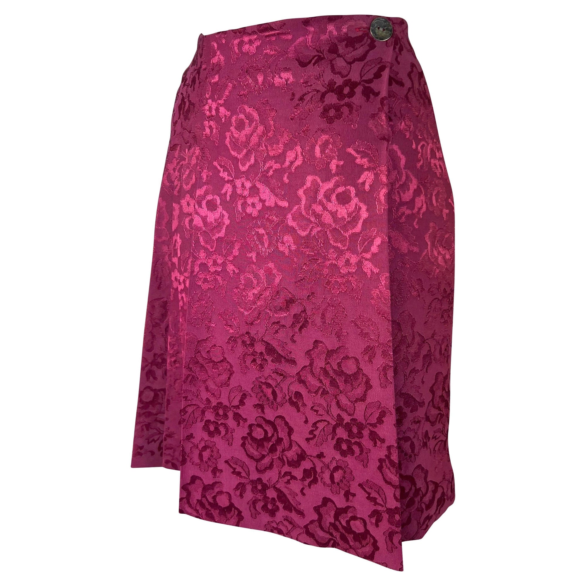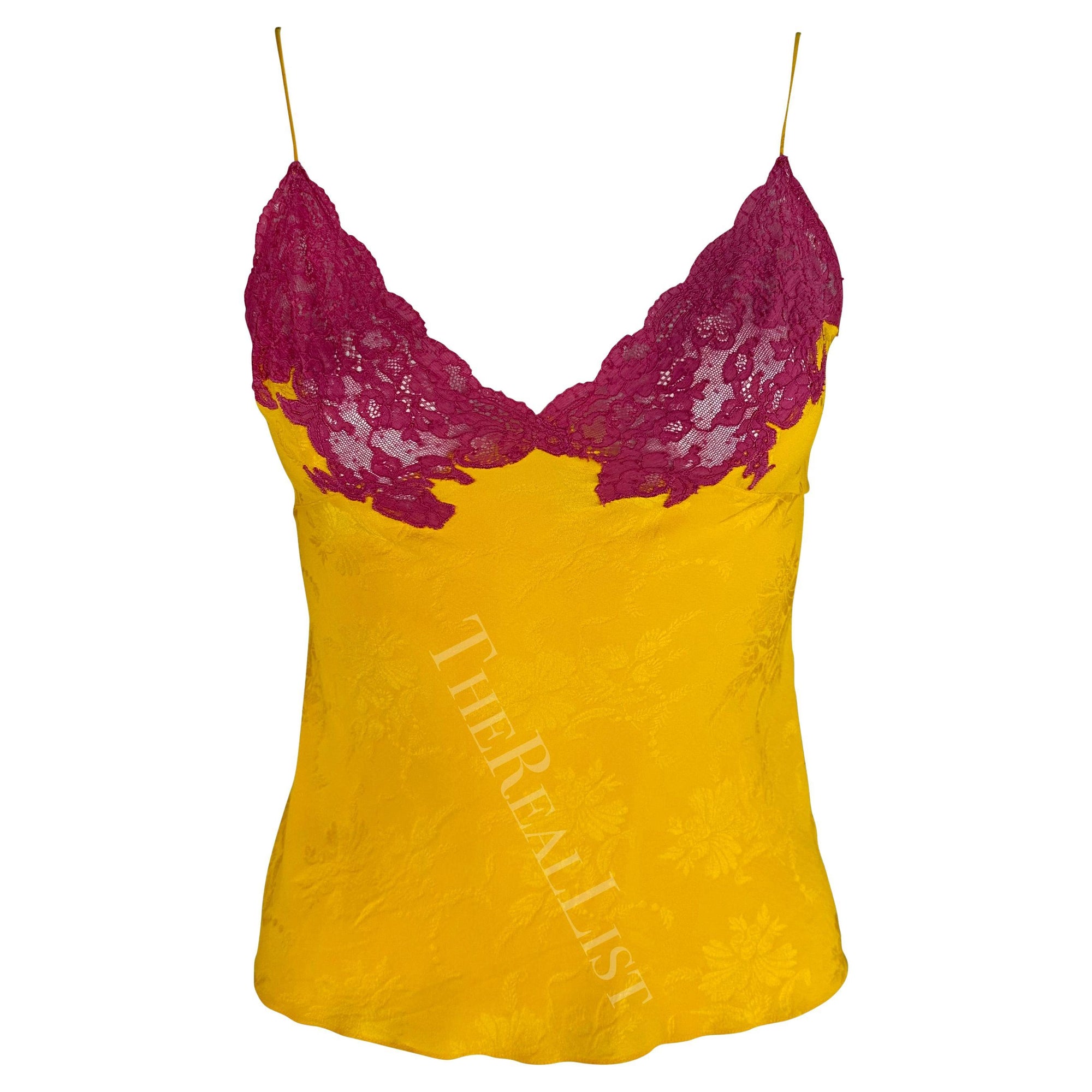 Presenting a fabulous pink and yellow Christian Dior three-piece set, designed by John Galliano. From the Fall/Winter 1998 collection, several similar looks debuted on the season's runway and were also highlighted in the season's ad campaign. This set is comprised of a spaghetti strap slip tank top, a pleated wrap skirt, and a matching jacket with an attached shawl. The slip-style top is constructed of a floral jacquard yellow body with a pink lace bust. The skirt features a bold floral woven pattern, single button closure, and wrap style. The set is made complete with a matching jacket/sweater which is constructed of the same pink floral fabric as the skirt. The jacket is made complete with stretch knit arms and a large yellow lace-trimmed shawl that can be fashioned in several ways. Whether worn together or separately, this chic and bright set is the perfect addition to any Dior by Galliano lover's wardrobe!