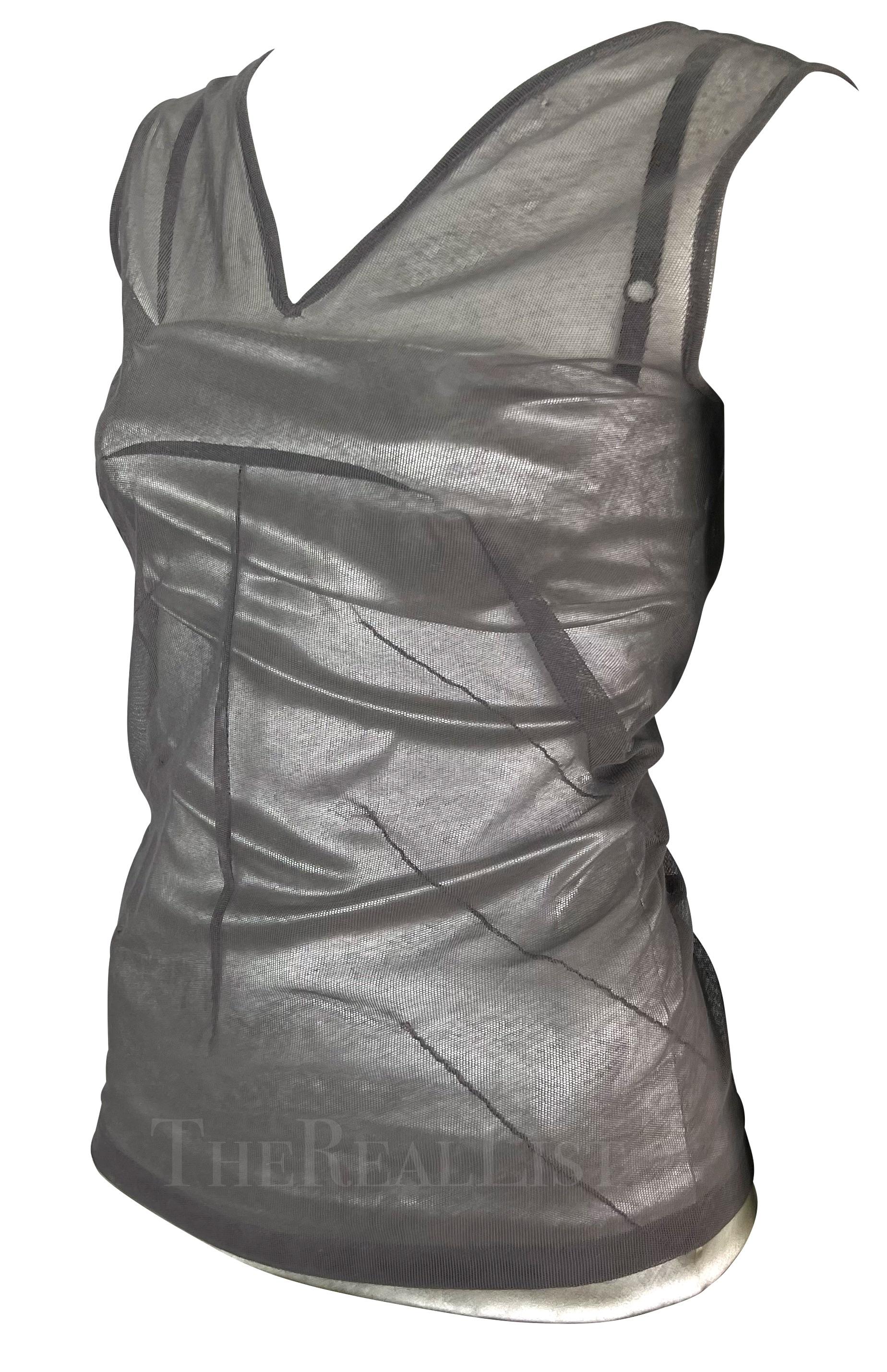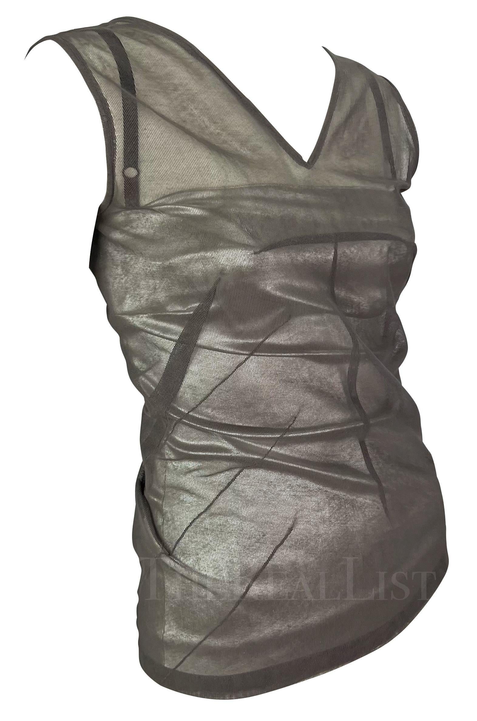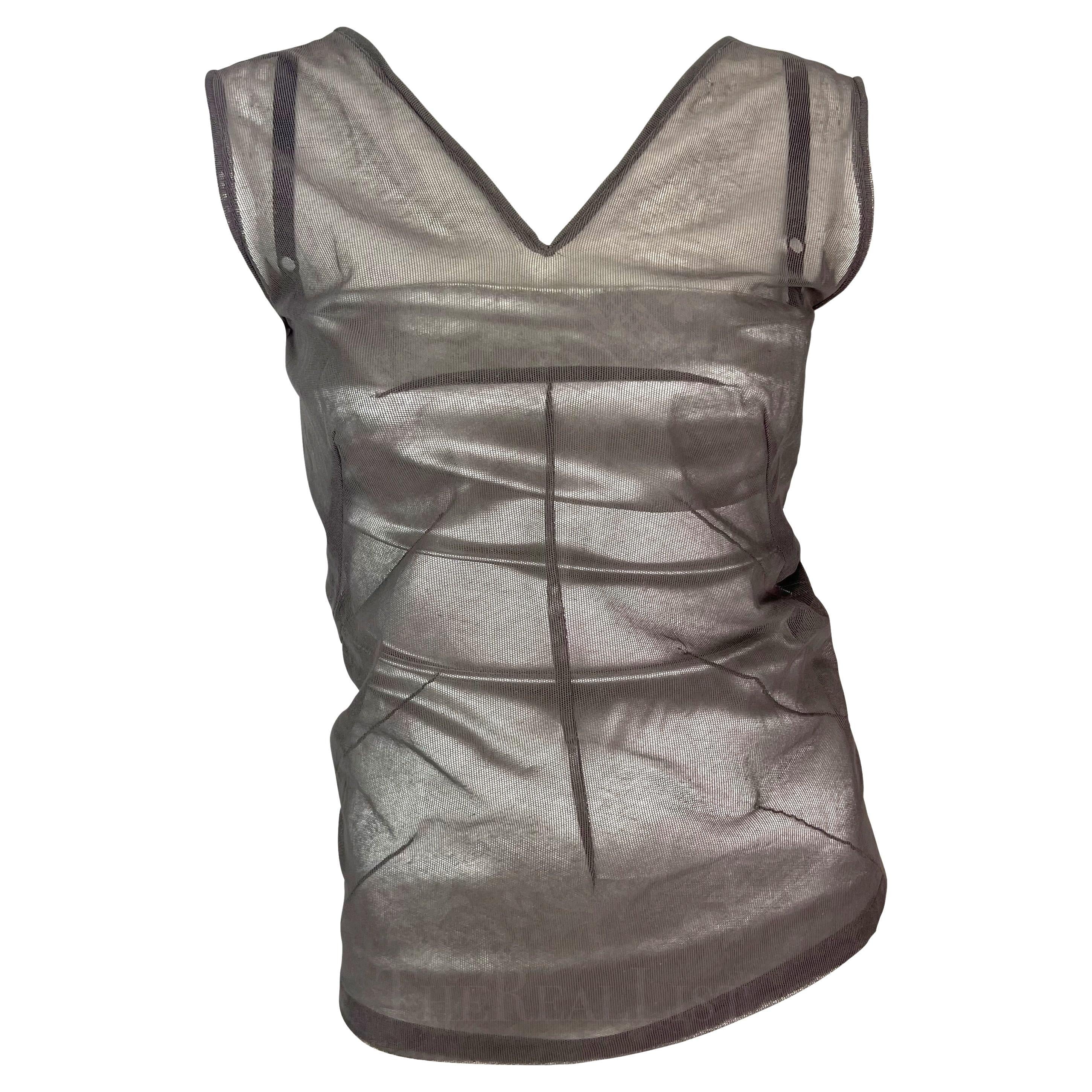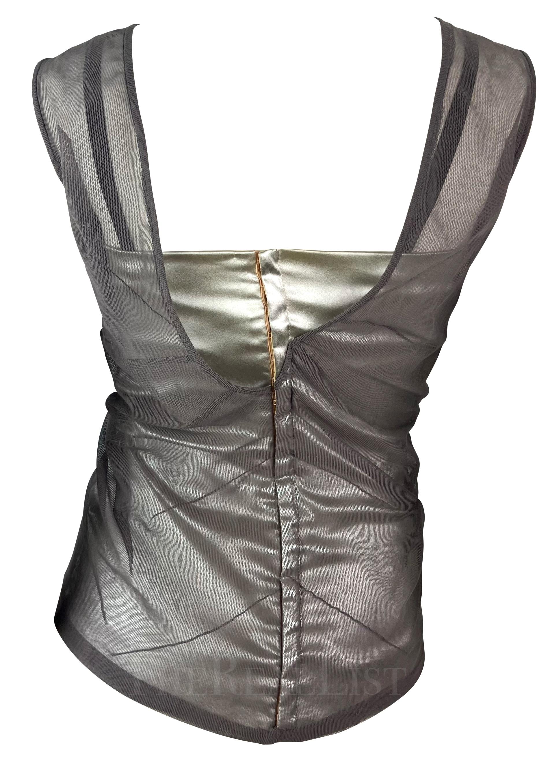 Presenting a metallic grey Dolce & Gabbana mesh top. From the Fall/Winter 1998 collection, this top is constructed of two layers, a silver metallic tank top, and a grey mesh outer layer. The exterior layer features a v-neckline, intentional darting, and is made complete with a v-shape cutout at the back that slily exposes the metallic silver tank top below.
