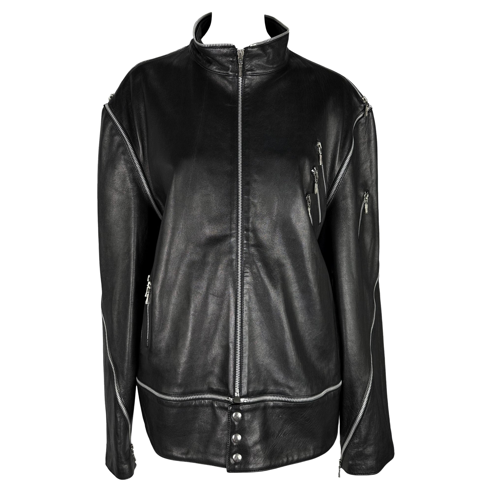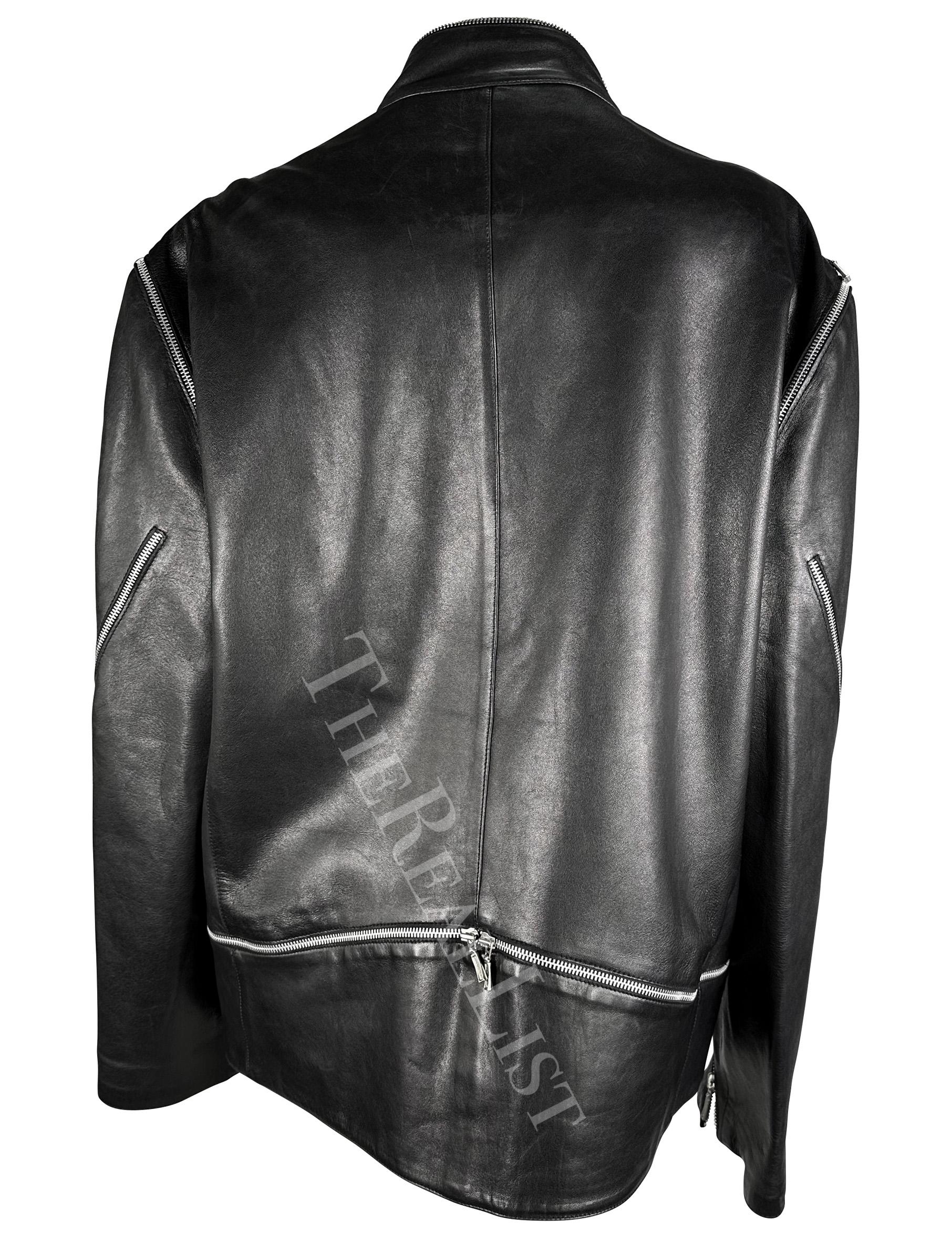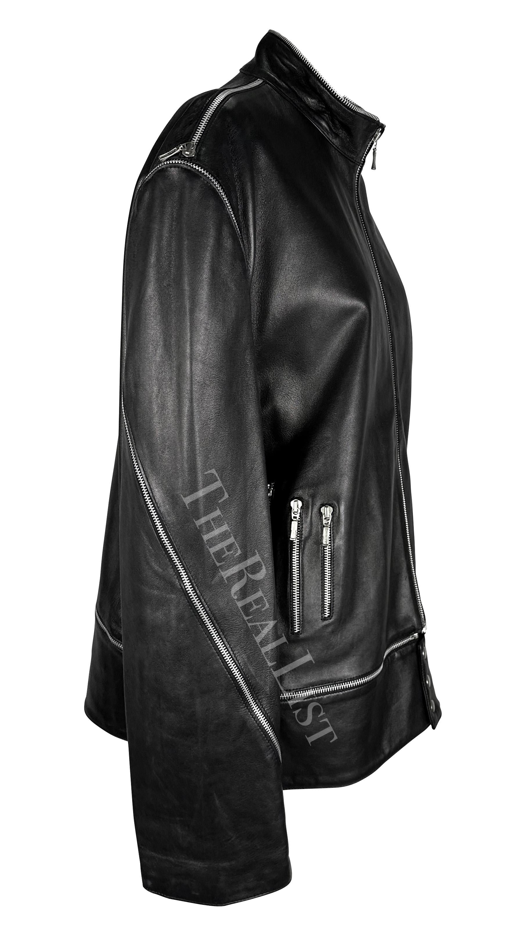 This chic, oversized black leather moto jacket by Gianni Versace, designed by Donatella Versace, debuted in light tan on the Fall/Winter 1998 men's runway. This stunning jacket features a standing collar and is crafted entirely from leather, adorned with numerous silver-tone zippers throughout.