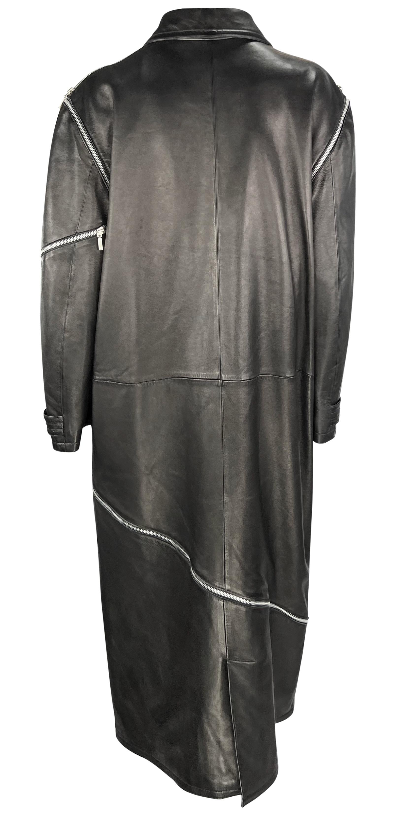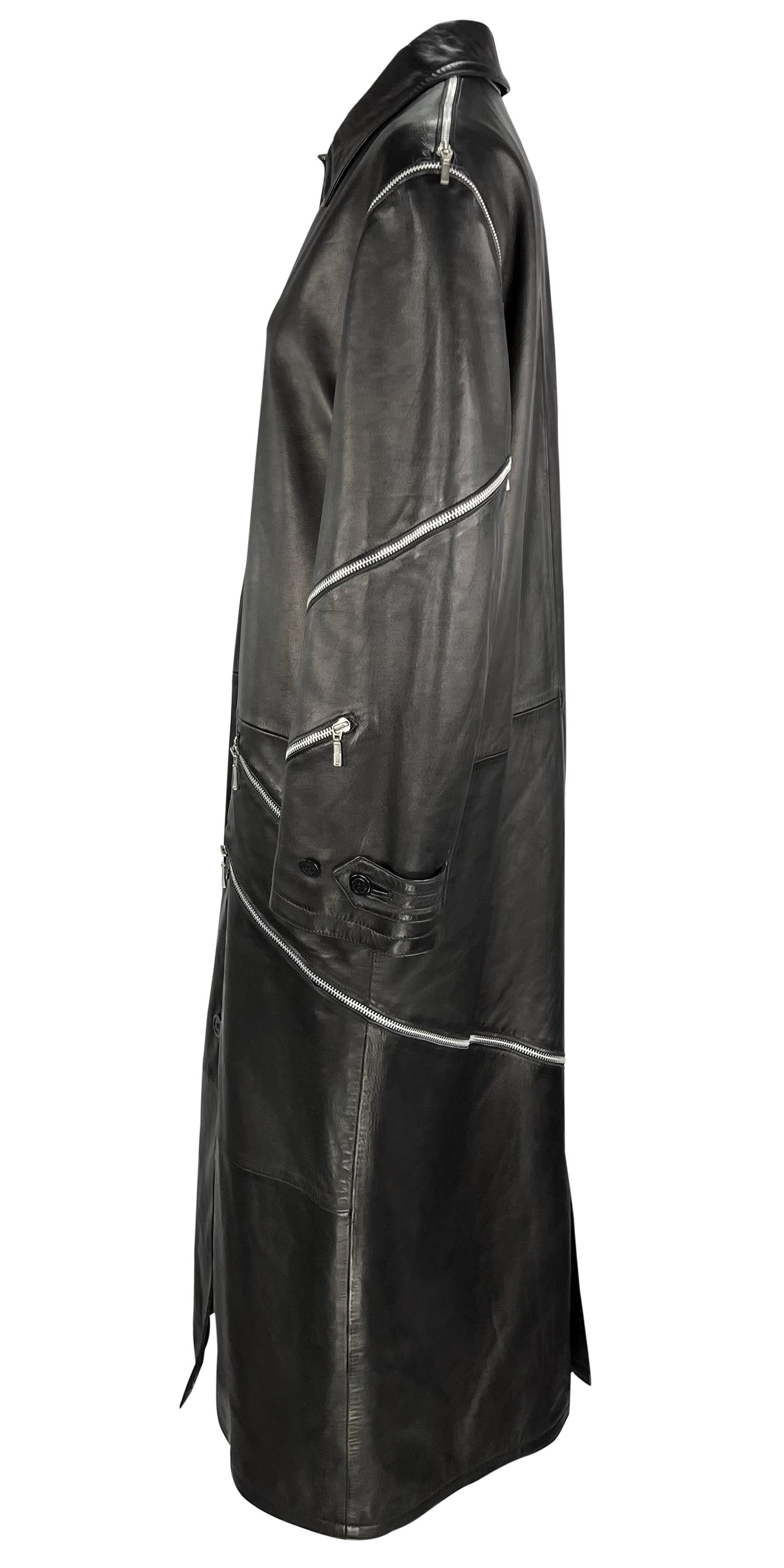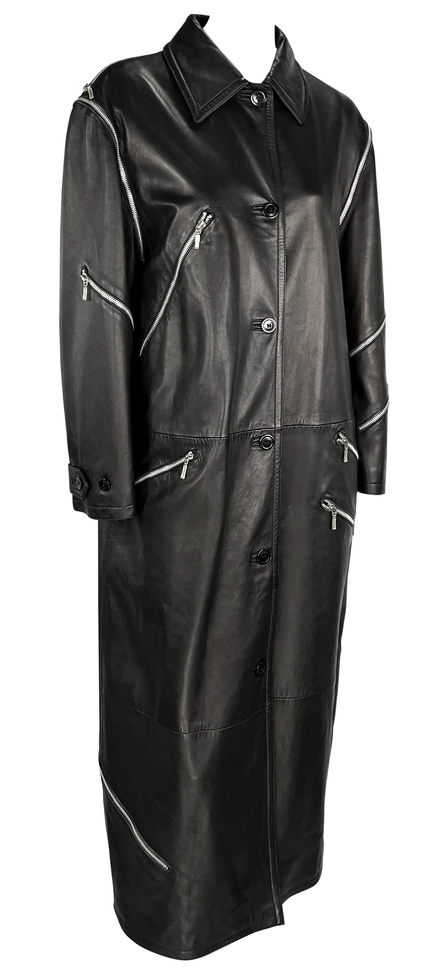 From the Fall/Winter 1998 collection, a variation of this full-length coat debuted on the season's menswear runway in light tan. Designed by Donatella Versace, this entirely black leather full-length coat features a fold-over collar and button closures. The coat is amped up with functioning silver zippers placed throughout, allowing this coat to be styled in different ways. A rare Versace runway find, this black leather coat is the perfect statement piece.