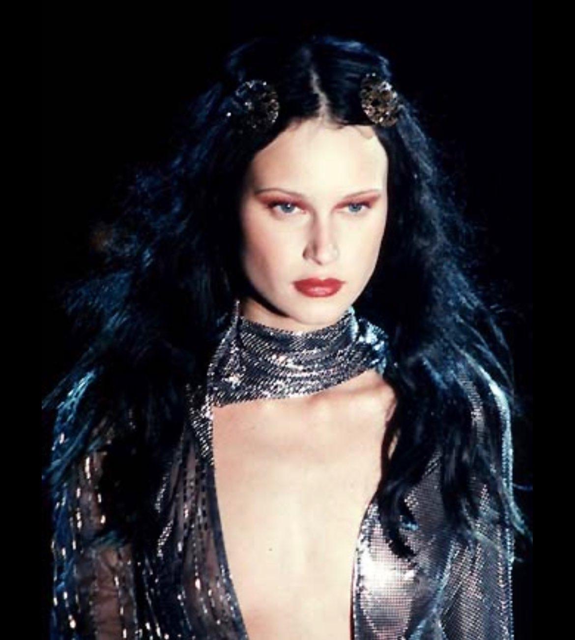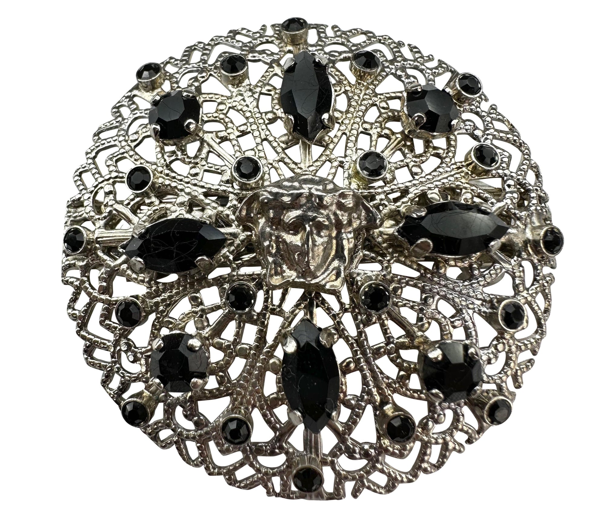 Presenting a fabulous silver-tone and black rhinestone Gianni Versace hair clip designed by Donatella Versace. From the Fall/Winter 1998 collection, these clips debuted on the season's runway. This incredible round hair clip is constructed of intricately woven metal, complete with black rhinestones and a Versace Medusa in the middle.