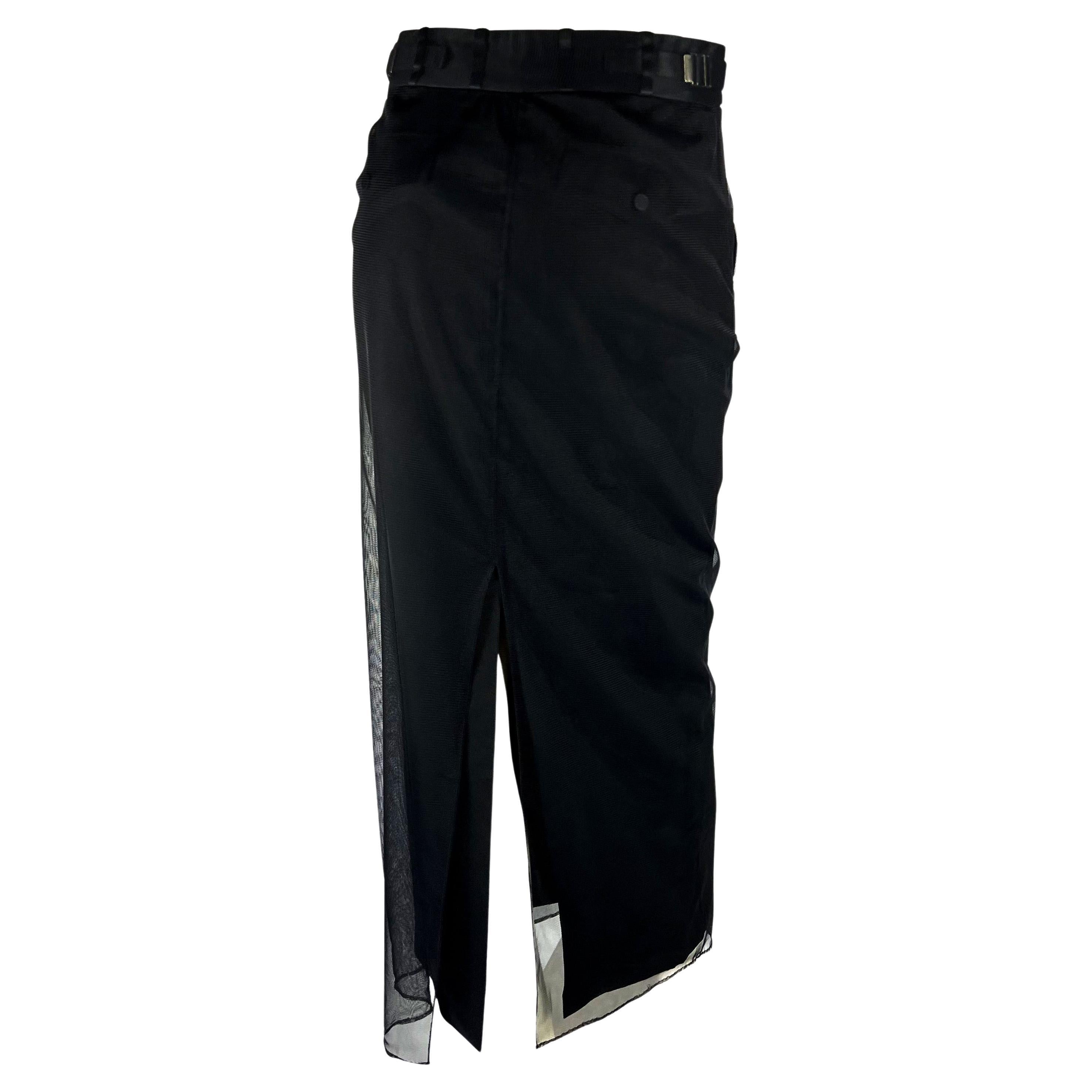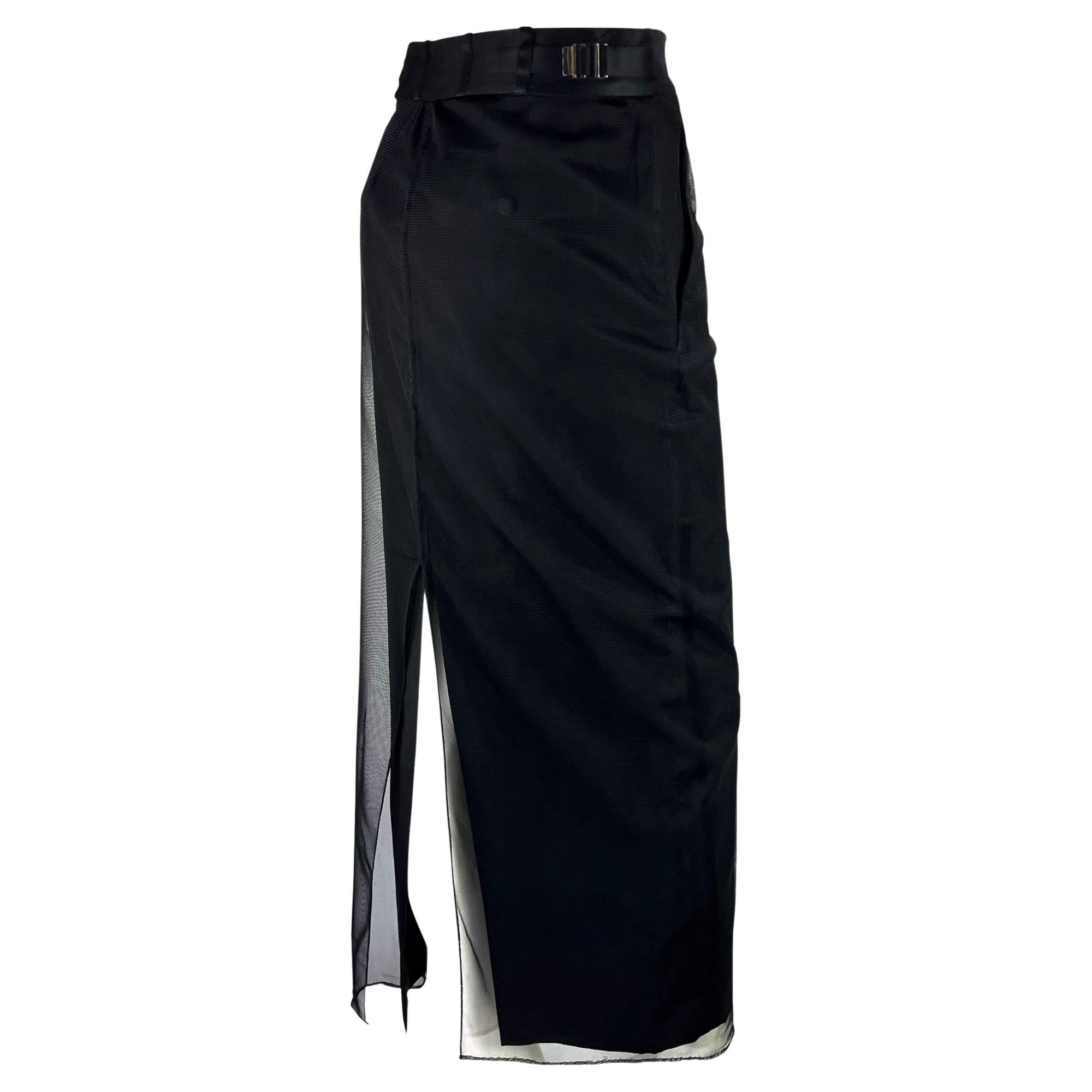 Presenting a full-length Gucci skirt designed by Tom Ford. From the Fall/Winter 1998 collection, this skirt features a button closure, belt loops, and buckles at the waist, all covered by a layer of tulle. Debuting on the runway, this ultra-chic black skirt is made complete with a slit at the back. This modern skirt will stand out from the heydays of Gucci by Tom Ford.