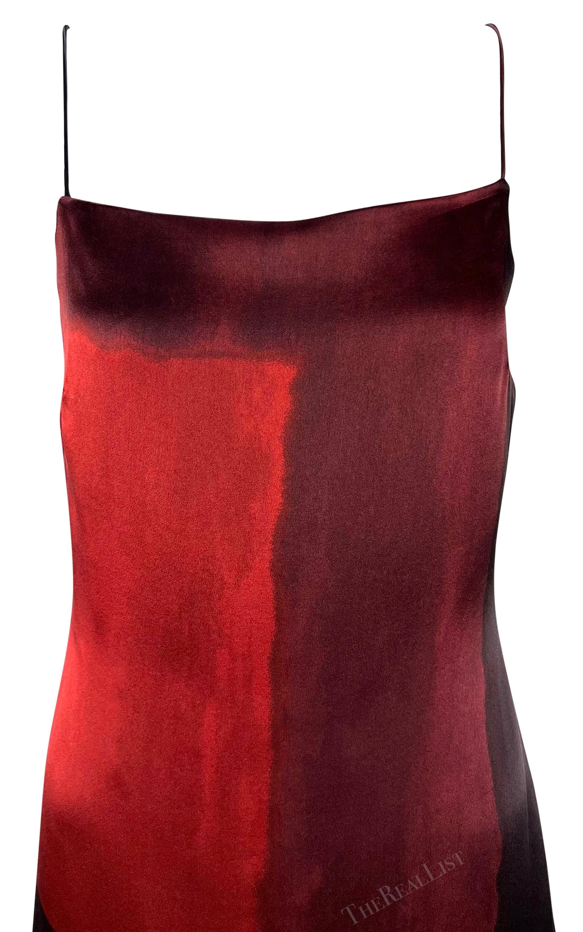 This red abstract slip gown from Guy Laroche’s Fall/Winter 1998 collection was designed by Alber Elbaz. While a velvet variation appeared on the runway, this version is rendered in soft silk. The floor-length gown features a square neckline, delicate spaghetti straps, and an angular abstract print in shades of red and burgundy. A rare example of Elbaz’s early work at Guy Laroche, it highlights his refined approach to modern eveningwear.