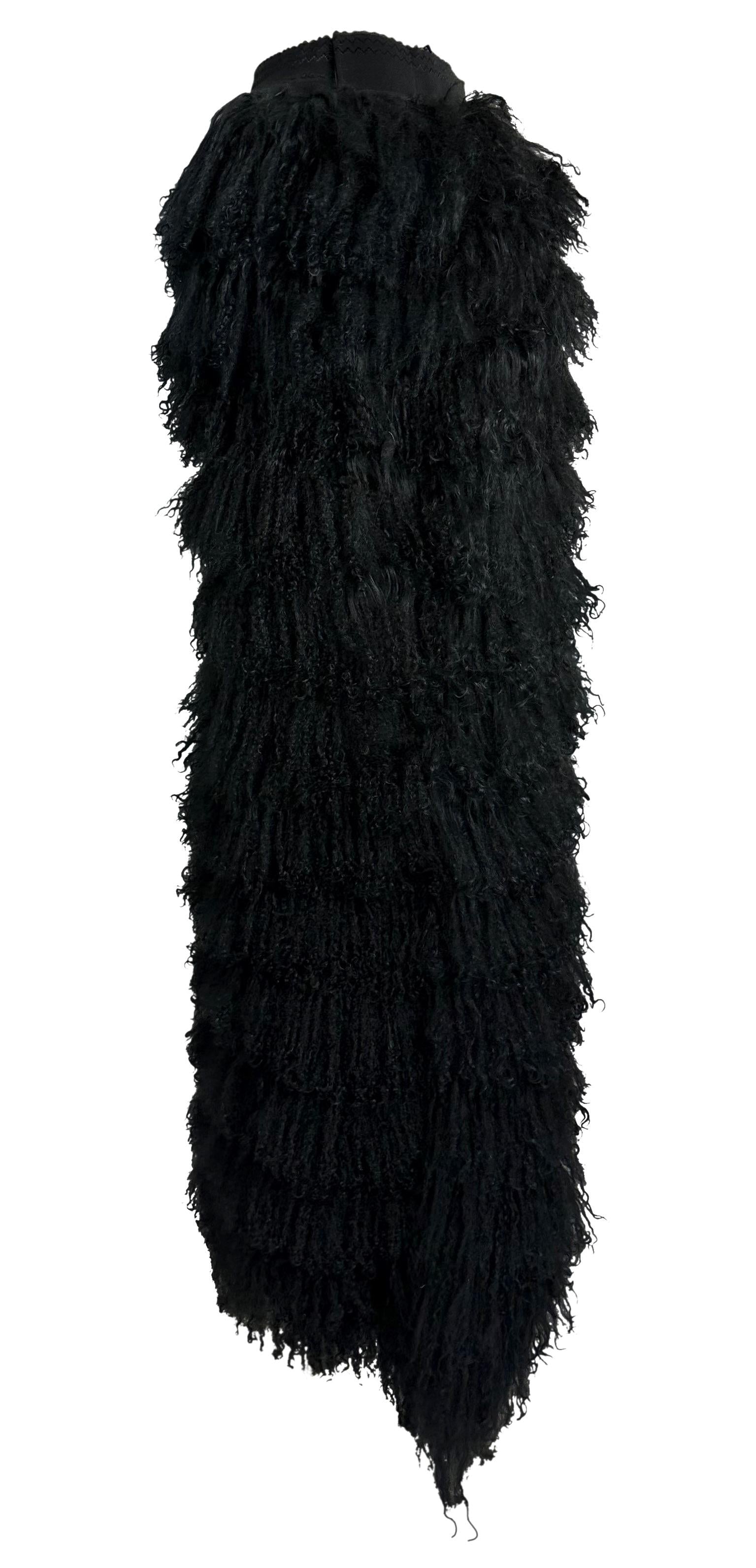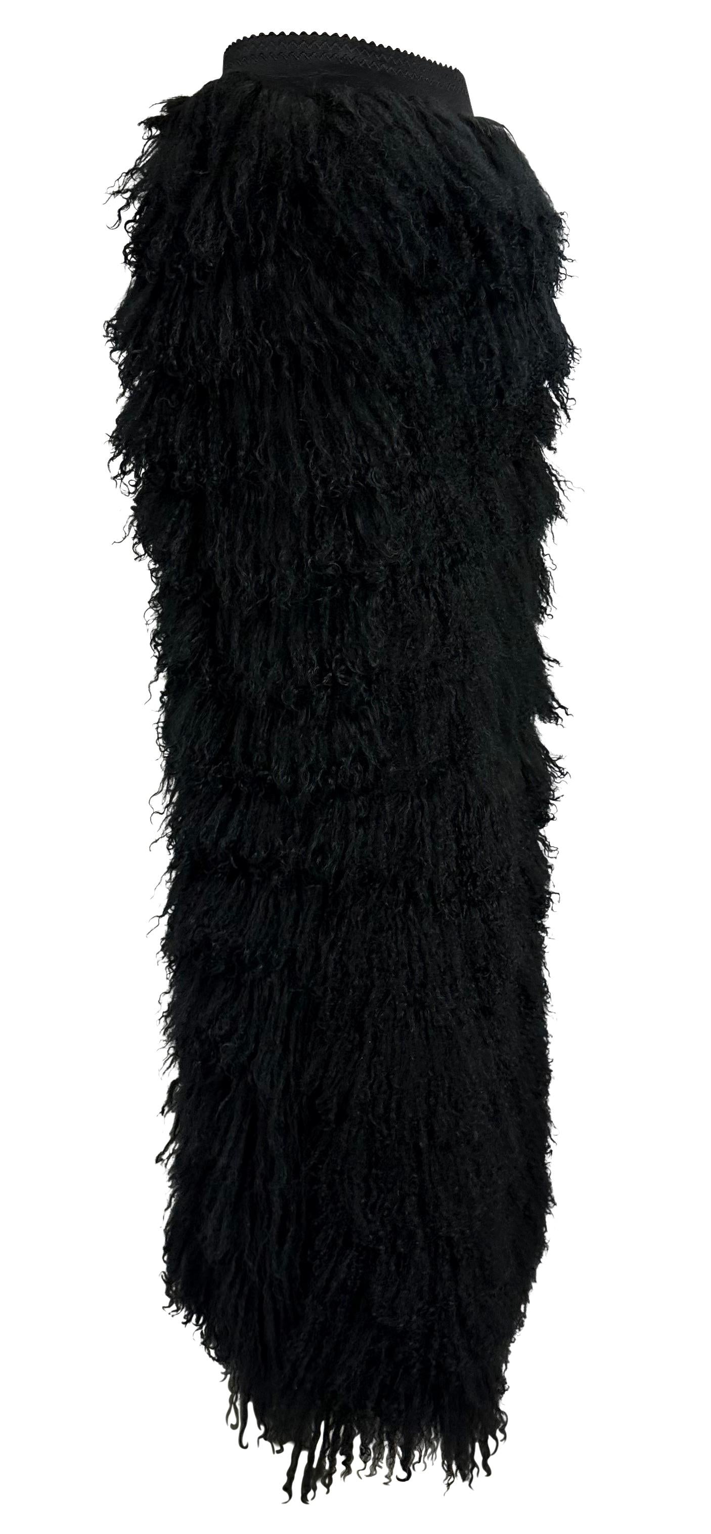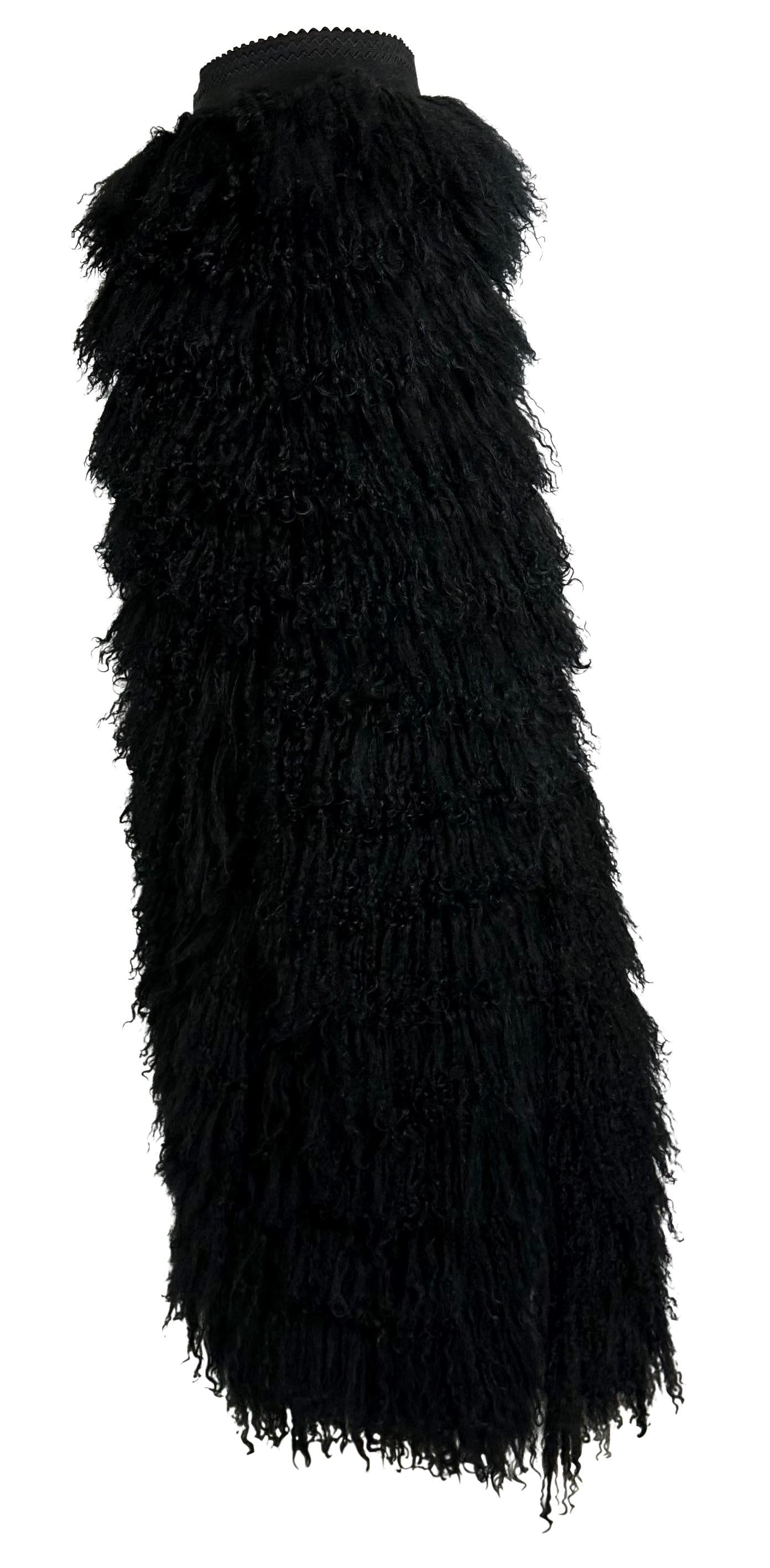 Presenting a black Mongolian lamb Dolce and Gabbana maxi skirt. This fabulous skirt debuted from the Fall/Winter 1999 collection on the season's runway, modeled by Gisele Bündchen. This rare and unique skirt is constructed of layers of curly lamb fur, the perfect addition to any winter wardrobe.