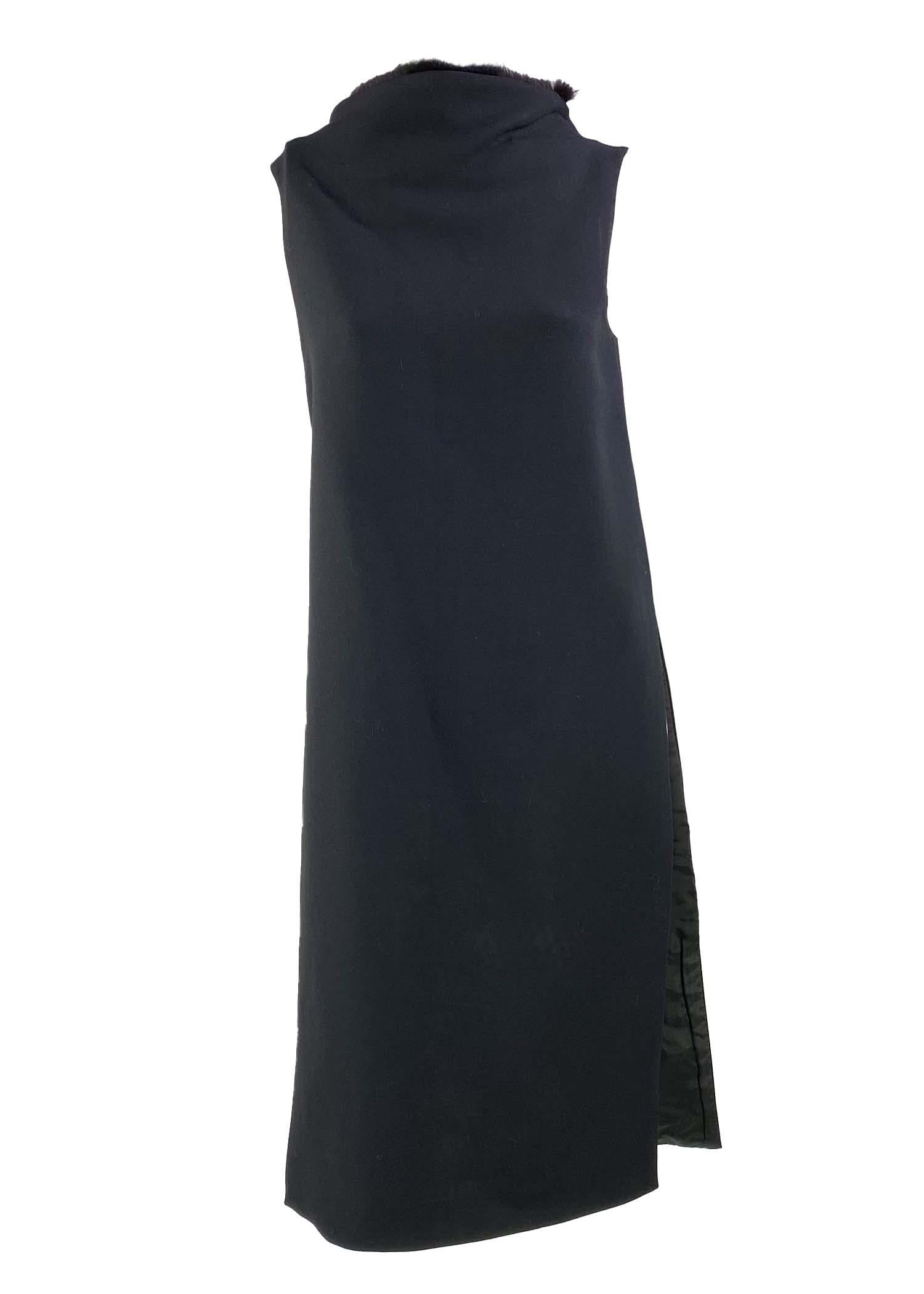 A mink-trimmed Gianni Versace tunic tent dress designed by Donatella Versace for the Fall/Winter 1999 collection. This versatile slip-over piece features a mock neck finished with mink fur and slits at the underarms. It can be styled as a poncho layered over an ensemble or worn alone as a daring dress. The design reflects Donatella’s bold and provocative vision for the house during the late 1990s.