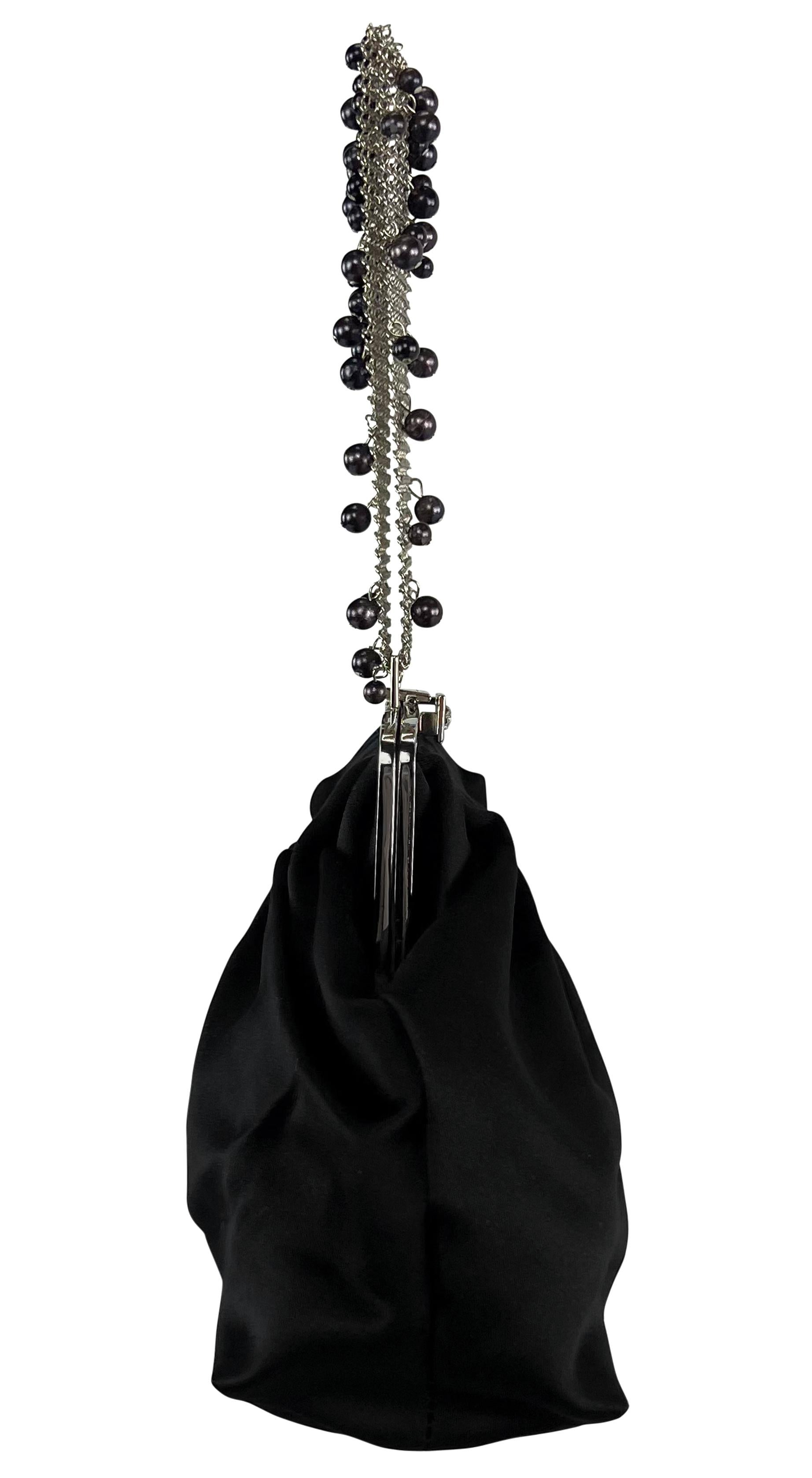 Donatella Versace designed this elegant black satin evening bag for the Gianni Versace Fall/Winter 1999 collection. This chic bag is constructed of black satin and features a silver-tone clamshell design. The bag is elevated with black faux pearls scattered throughout the chainmail strap.