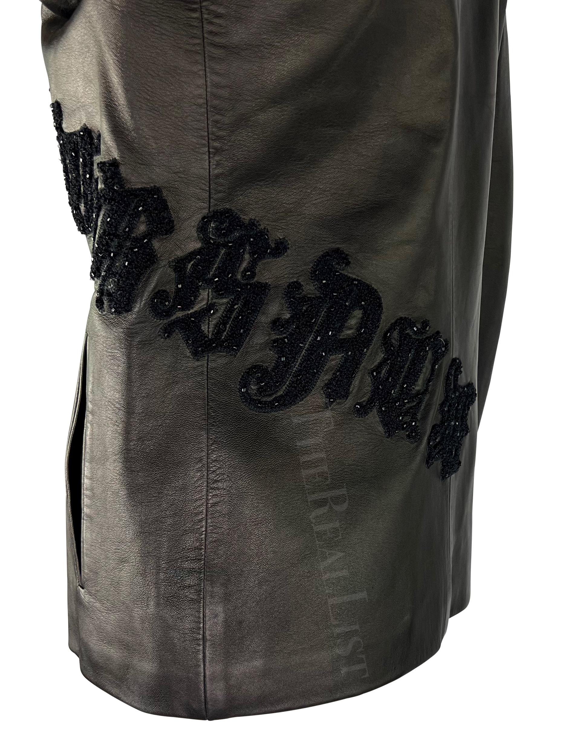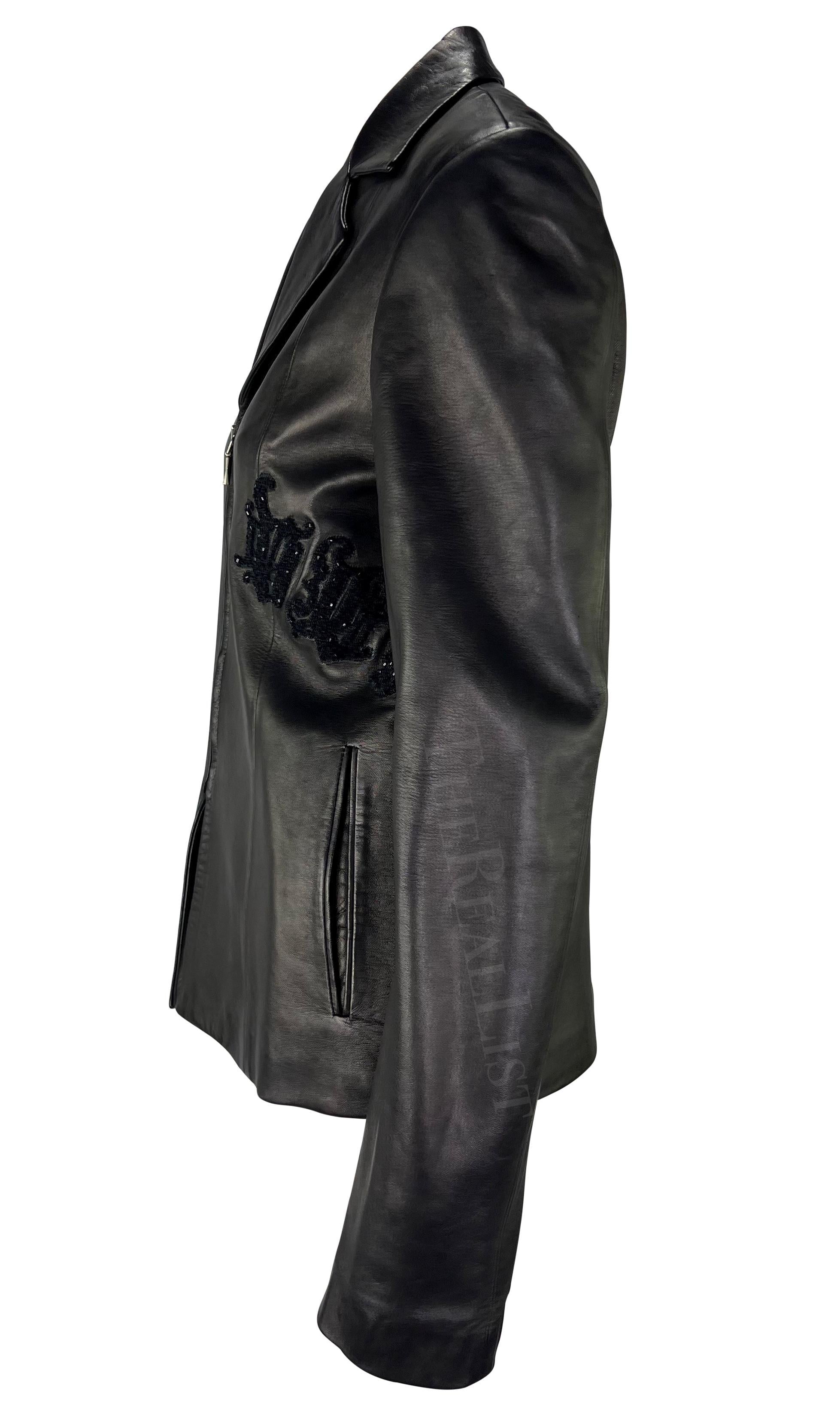 Presenting a black Gianni Versace leather jacket, designed by Donatella Versace. From the Fall/Winter 1999 collection, this jacket is constructed entirely of leather and features a fold-over collar and zip closure. The jacket is amped up with beaded varsity-style appliqués on one side that spell out 'Versace'. The perfect chic addition to any wardrobe, this vintage Gianni Versace by Donatella jacket is a must-have addition to any wardrobe.