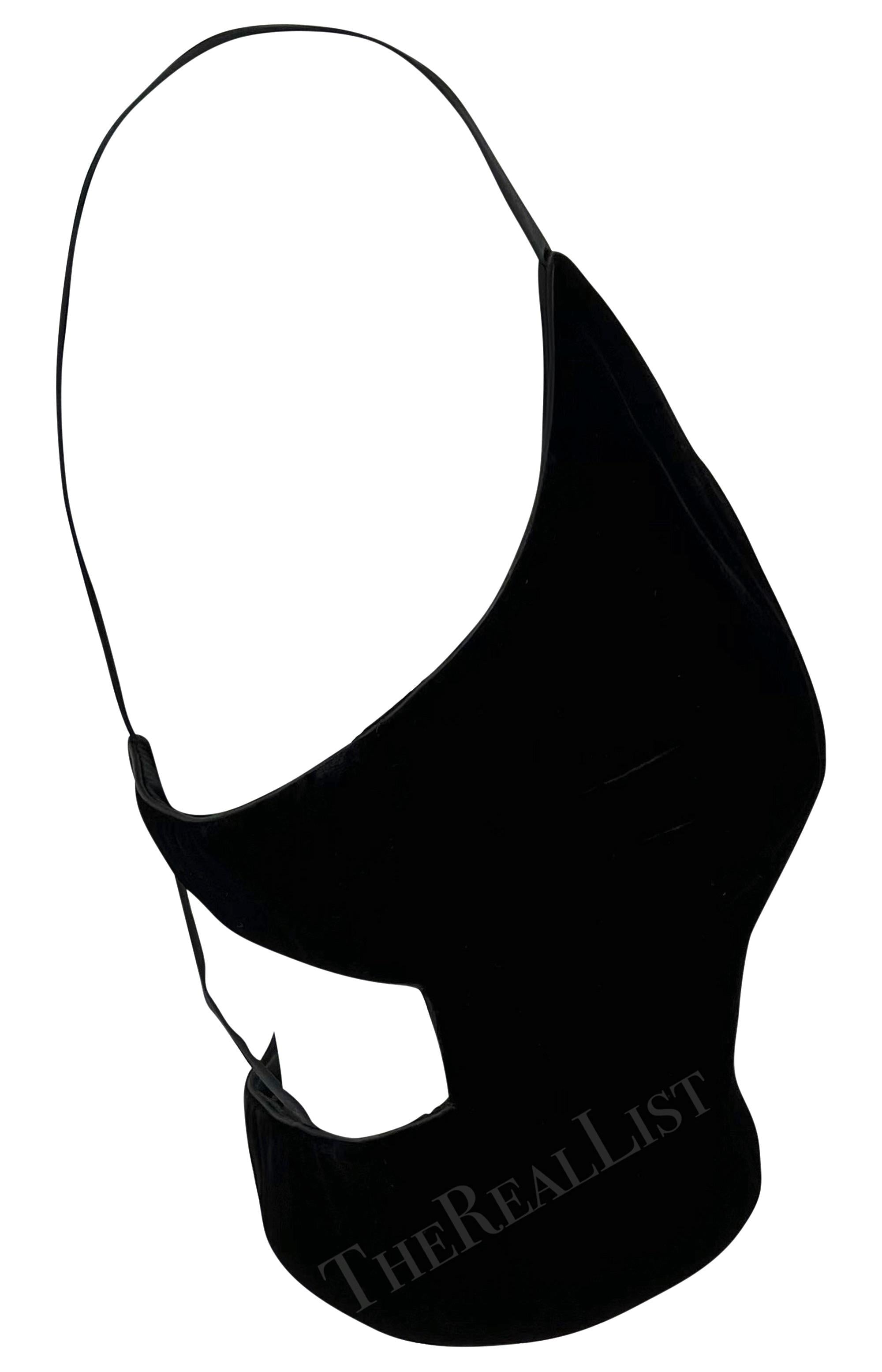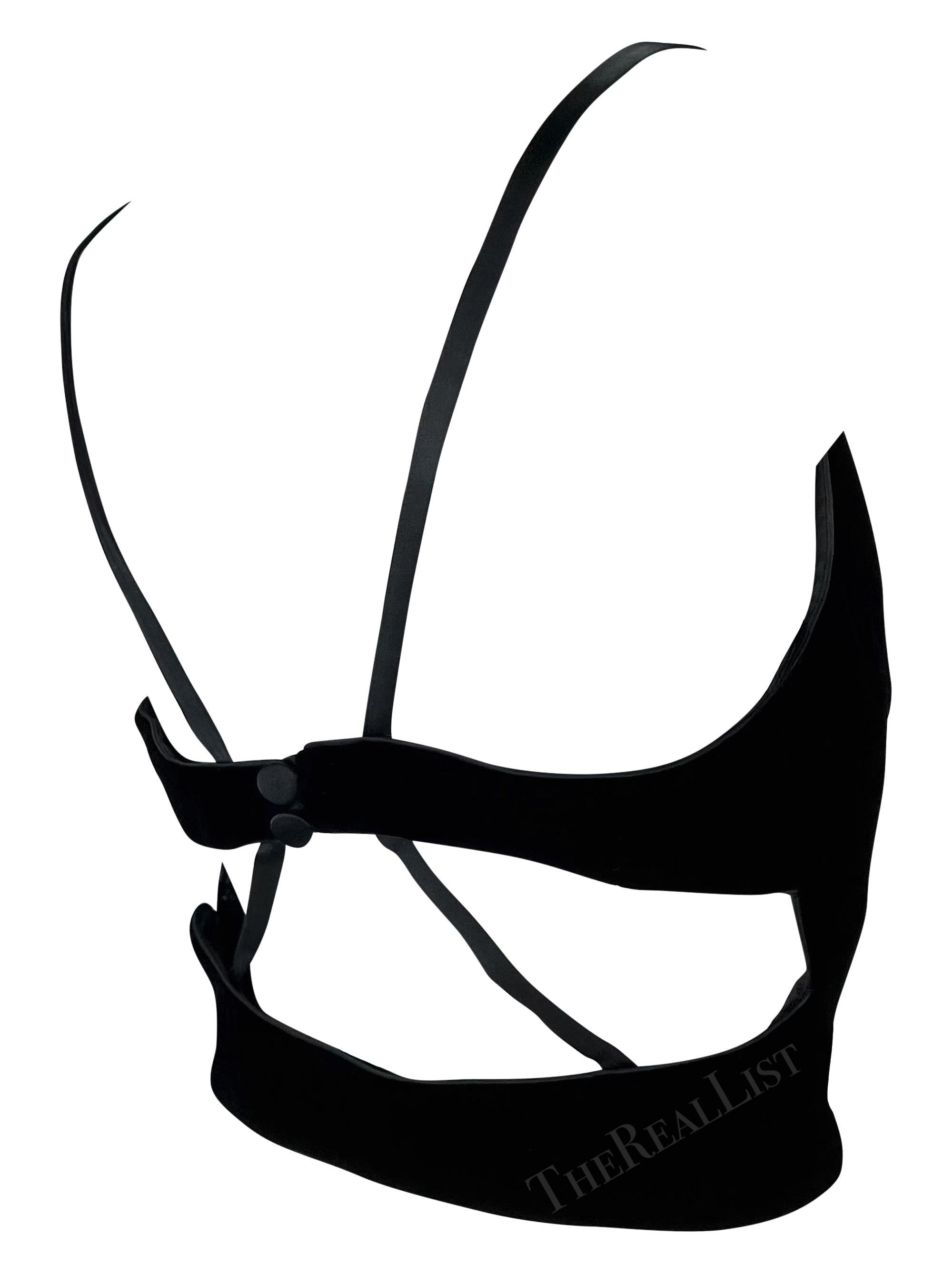 Presenting a captivating black velvet Giorgio Armani crop top from the Fall/Winter 1999 collection is a luxurious piece. Constructed from soft black velvet, this alluring top features an enticing strap design that graced the season's runway. Featuring a v-neckline and thin shoulder straps, this top is made complete with an exposed back and straps that run across the back. Perfectly sexy and chic, this Giorgio Armani top is the perfect luxurious and refined addition to any wardrobe!