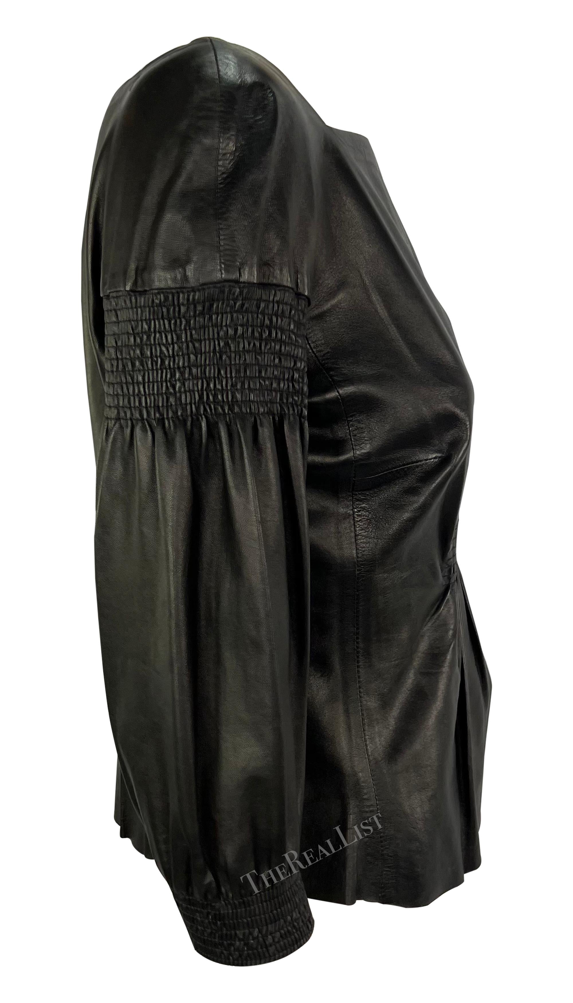This Gucci shirt from the Fall/Winter 1999 collection by Tom Ford is crafted in supple black leather and defined by ruched paneling at the waist, sleeves, and cuffs. Designed with a straight neckline and voluminous long sleeves, the piece highlights Ford’s ability to merge structure with sensual detailing. A version of this shirt was featured on the season's runway and in the campaign, captured by Mario Testino and modeled by Liisa Winkler.