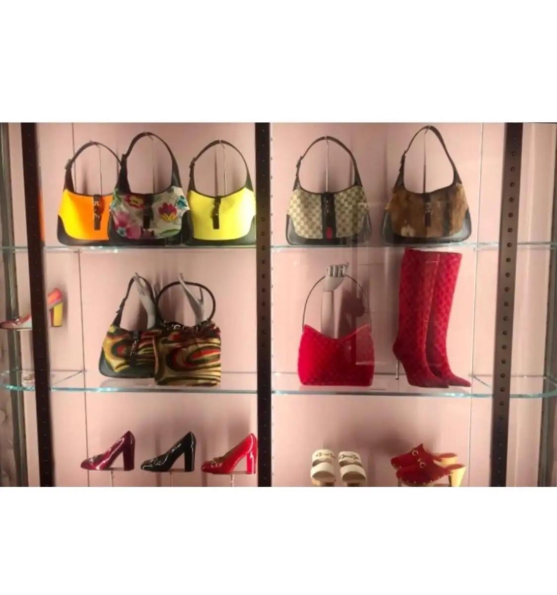 This exquisite bucket bag from Gucci's Fall/Winter 1999 collection, designed by Tom Ford, showcases his iconic psychedelic silk velvet pattern. The bag features a sleek lucite hoop handle, attached by silver metal rings that harmonize beautifully with the deep greens and reds of the velvet. A silver-plated brand plate adds a polished touch to the handle. The same pattern appears on other runway pieces, and a grey velvet version of this bag was featured in the ad campaign with model Liisa Winkler, photographed by Mario Testino. Inside, the bag is lined with silk and includes a small pocket. Notably, this bag is displayed in the Gucci Museum in Florence, alongside a matching Jackie bag in the same print.