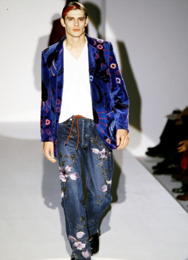 From Gucci's Fall/Winter 1999 collection by Tom Ford, these dark wash denim jeans feature intricate purple floral embroidery throughout. Originally debuting on the menswear runway, this style was also featured in the season's ad campaign on Paul Wignall and Oscar Svenson, photographed by Mario Testino.