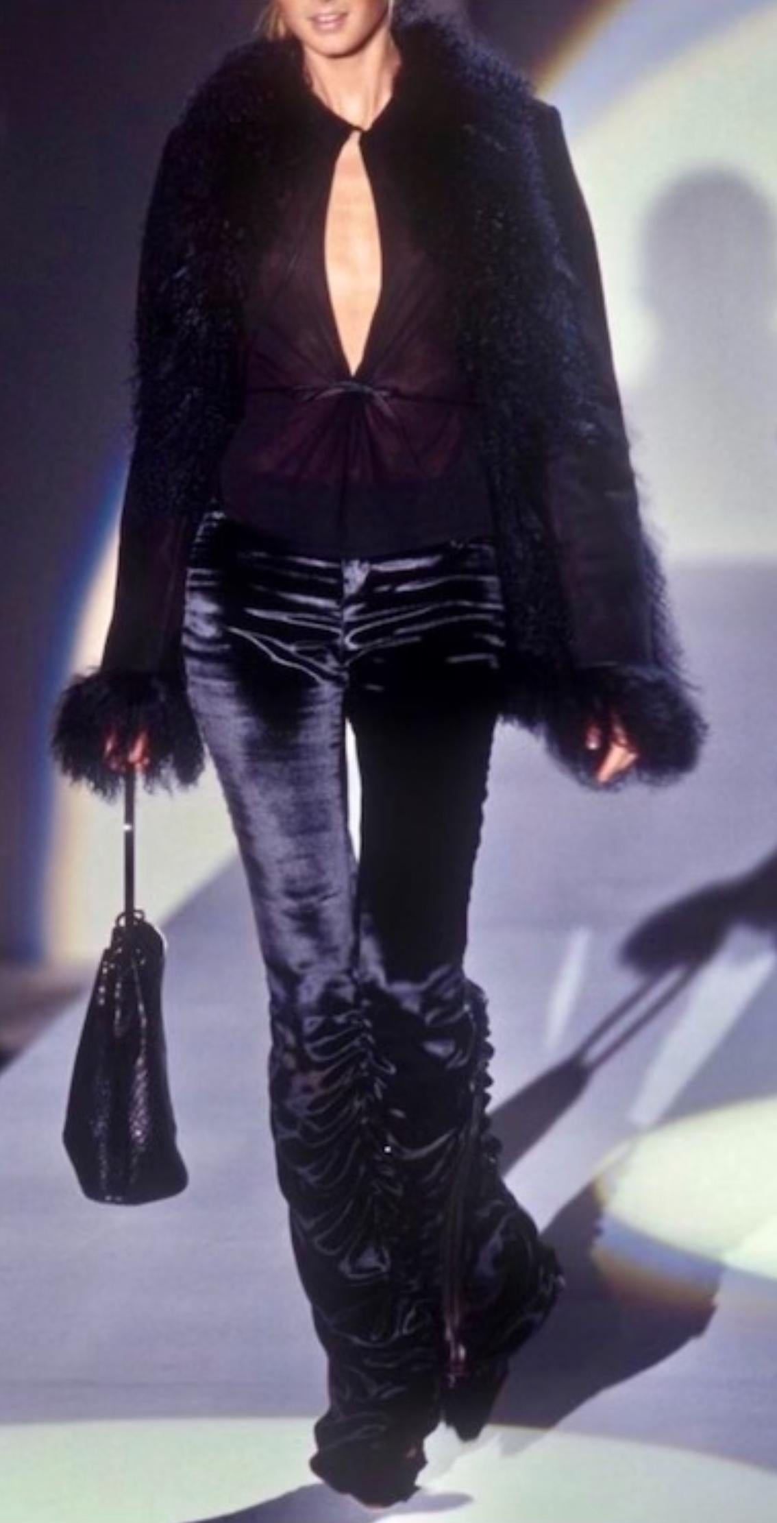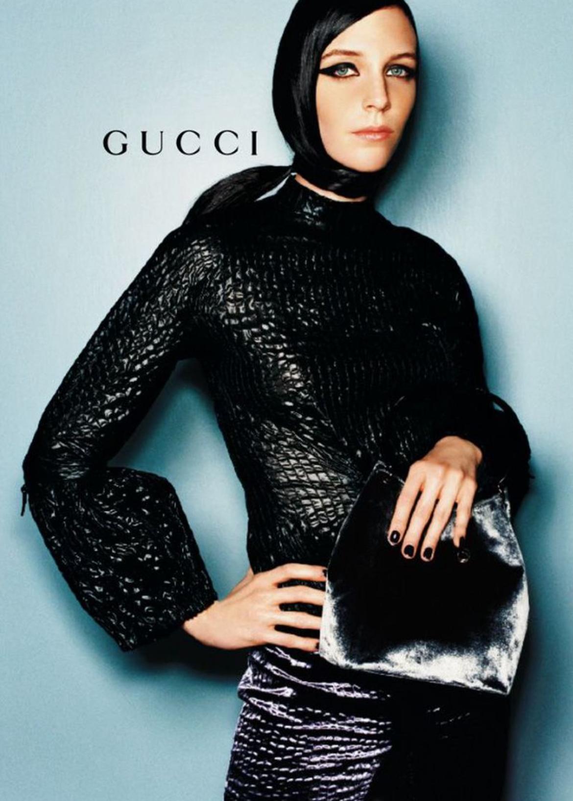 This exquisite bucket bag from Gucci's Fall/Winter 1999 collection, designed by Tom Ford, is crafted entirely from genuine python skin. It features a sleek lucite hoop handle, attached by silver metal rings, with a silver-plated brand plate. This bag made its debut on the season's runway. A grey velvet version and a black leather version were highlighted in the season's ad campaign, modeled by Liisa Winkler and photographed by Mario Testino. The interior includes a small pocket.