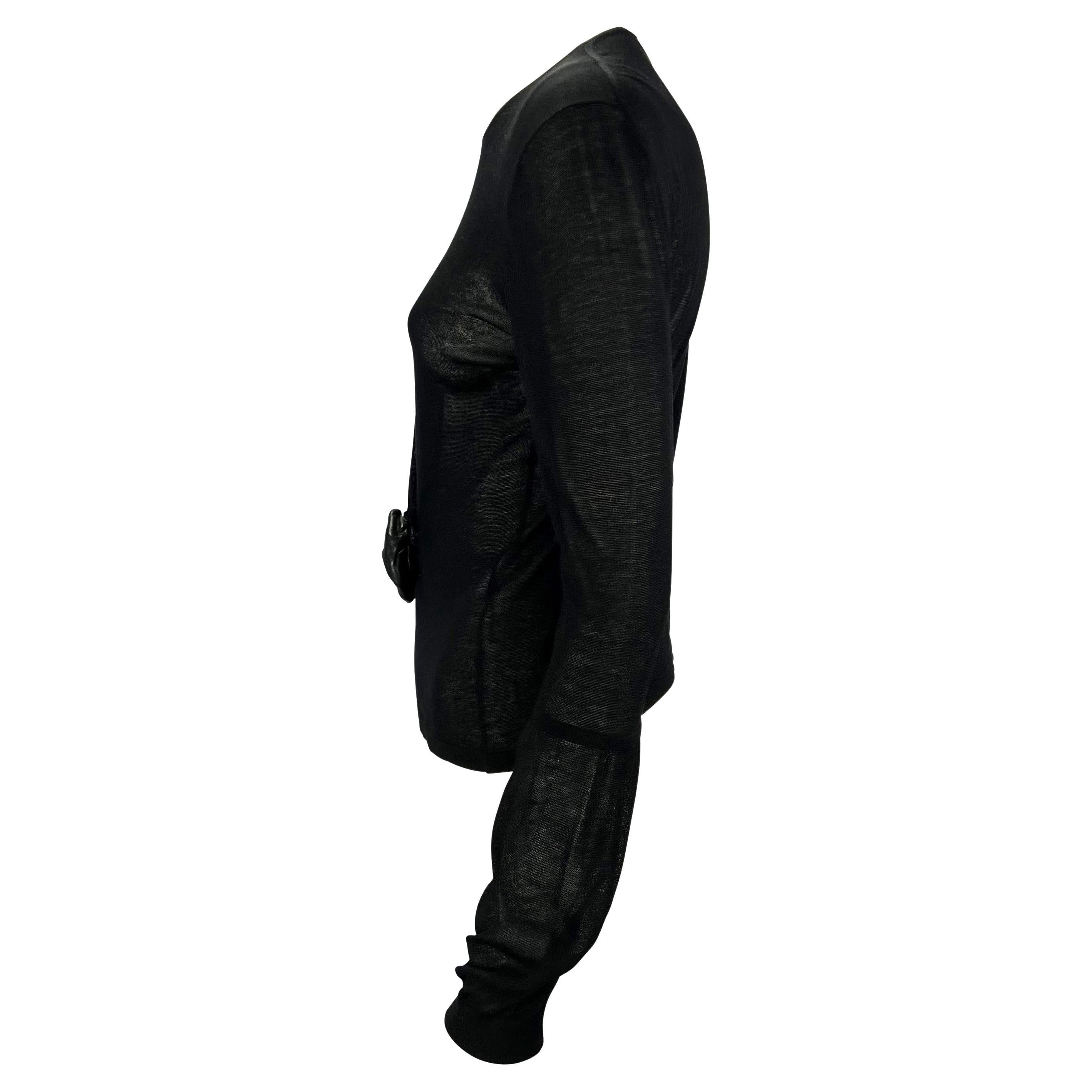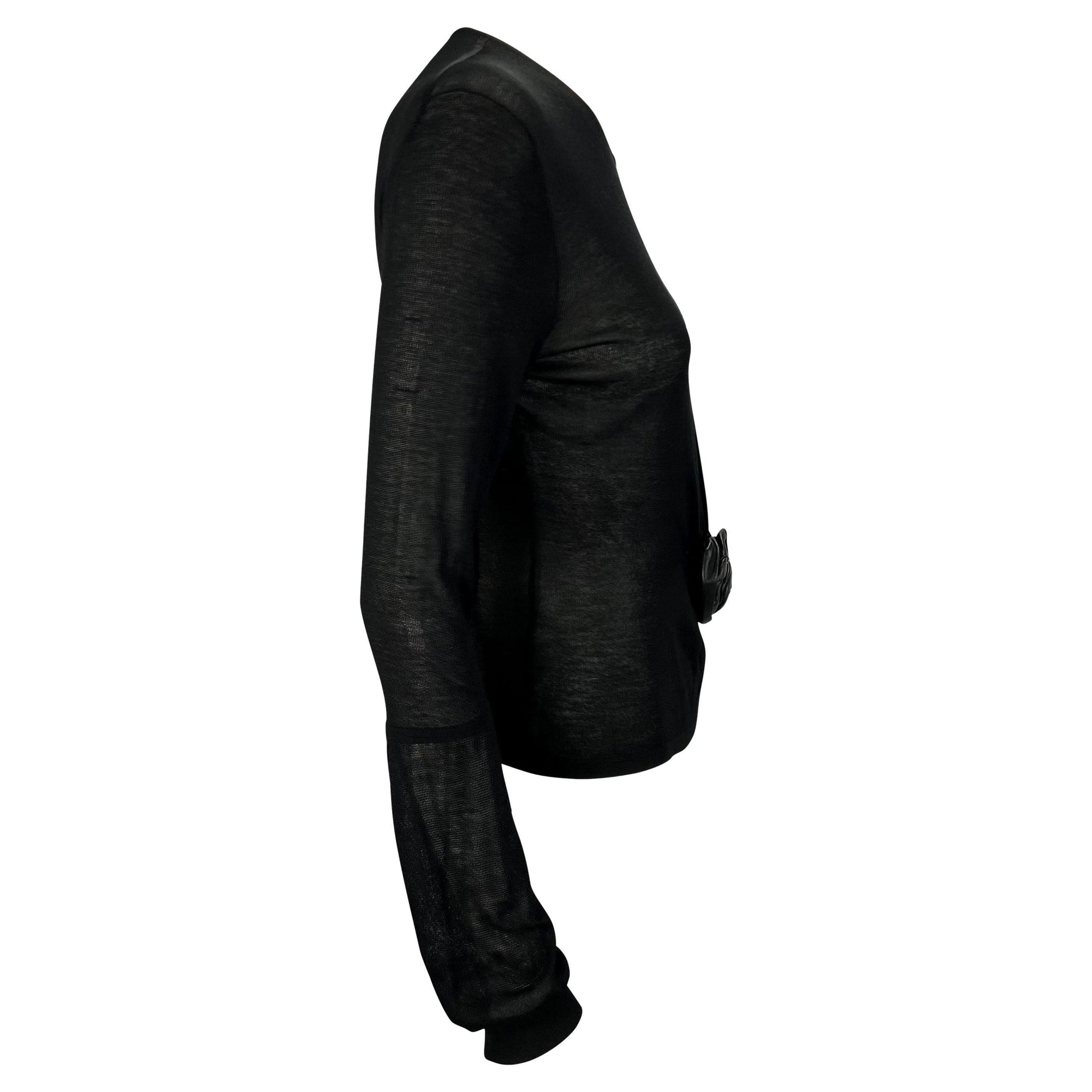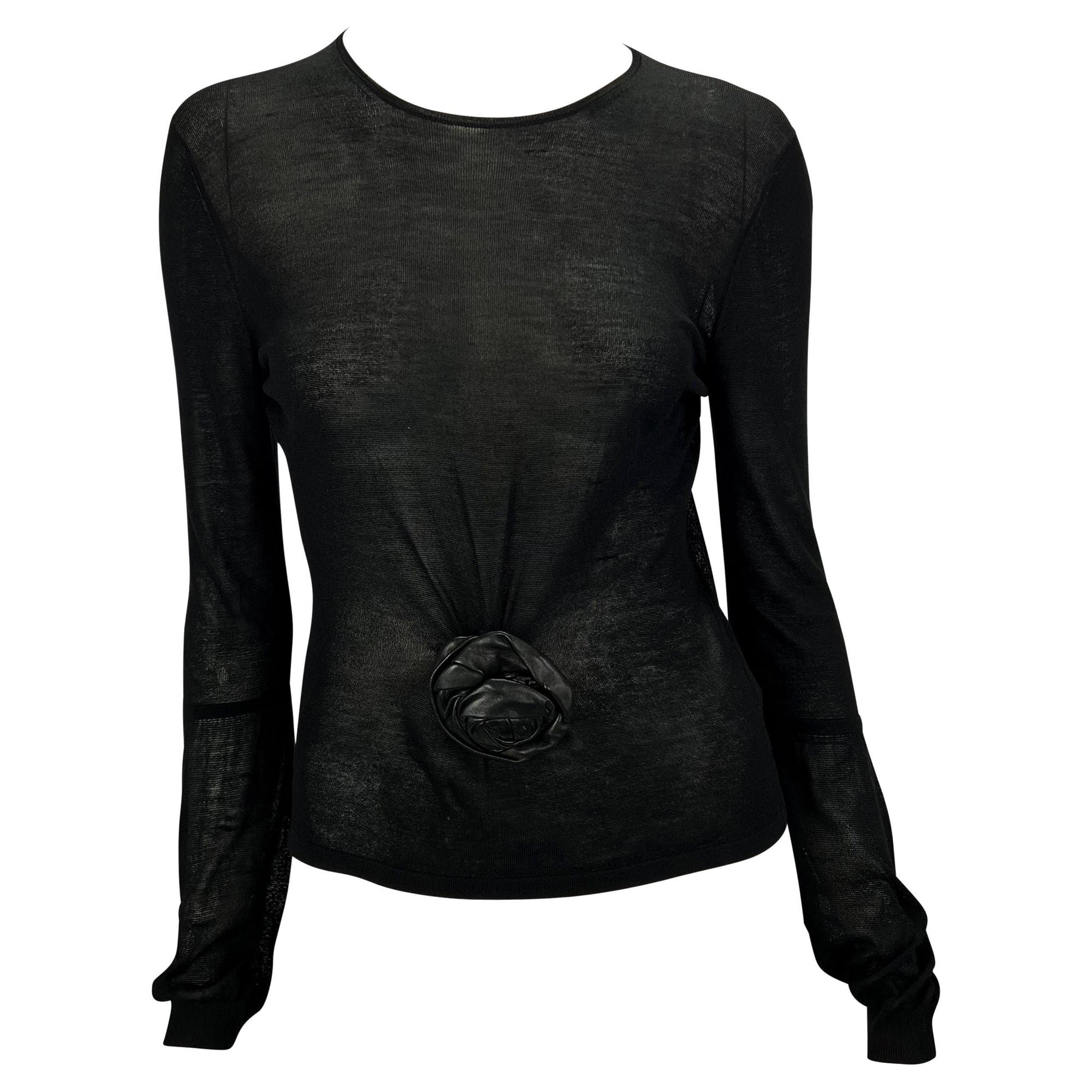 Presenting a beautiful semi-sheer Gucci blouse with a leather flower applique, designed by Tom Ford. From the Fall/Winter 1999 collection, this top debuted on the season's runway and was also used in the season's ad campaign photographed by Mario Testino. The knit top features a slight ballooning at the cuffs and ruching behind the leather flower as if it were pinching the fabric behind it. A fabulous and well-documented piece of Tom Ford Gucci runway history, this top is a must-have for any Tom Ford Gucci lover or collector!