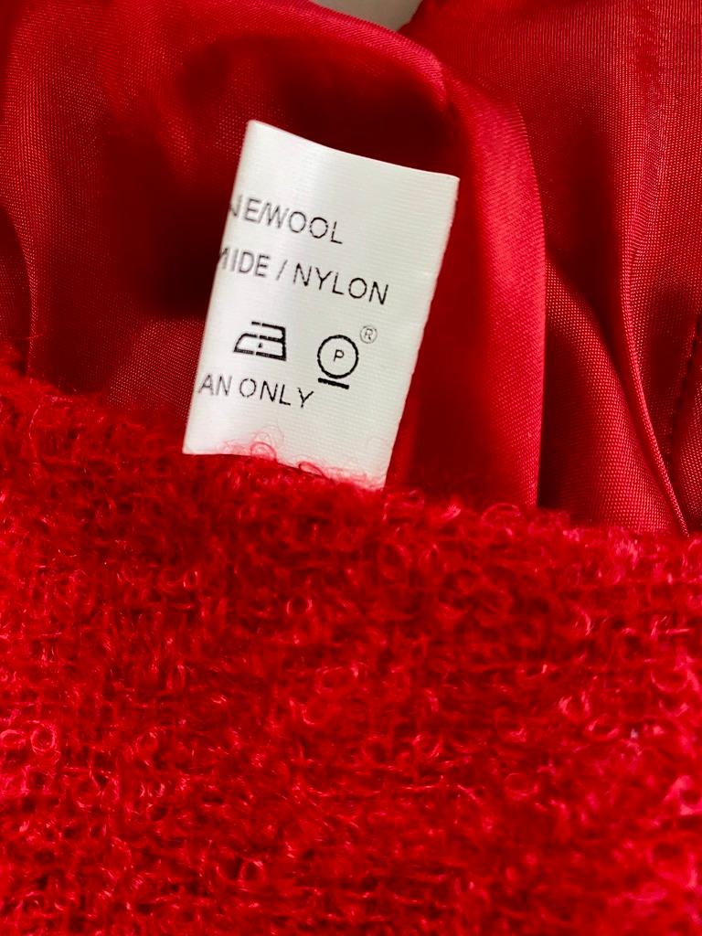 Presenting a bright red bouclé knit wool blend dress designed by Thierry Mugler for his Fall/Winter 1999 collection. This piece debuted as look number 15 in the season's runway presentation, displaying Mugler's expert figure-enhancing tailoring signature. The asymmetric design is enhanced by a delicately thin silver-toned chain strap at the right shoulder. Add this red-hot Mugler classic to your collection while it's here!