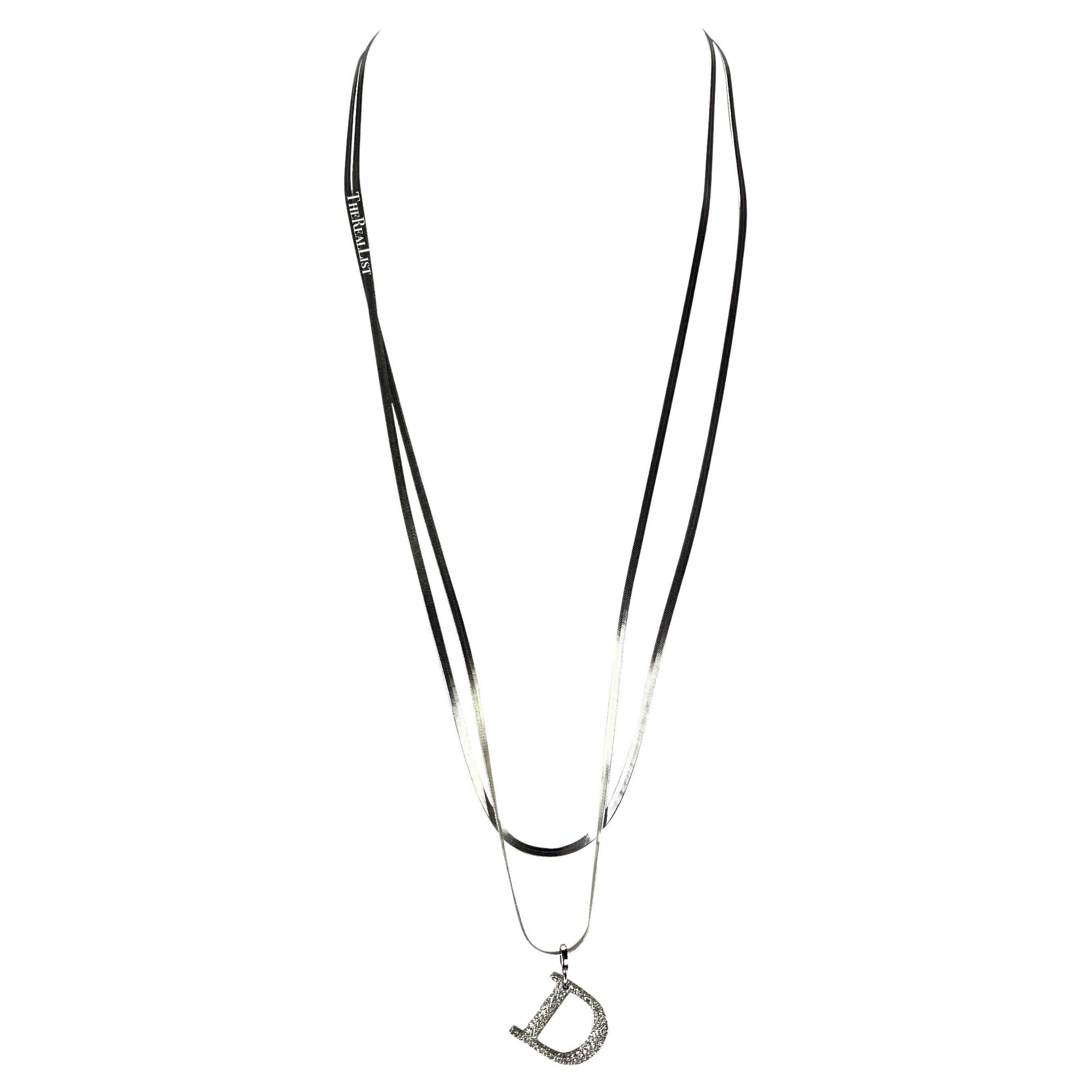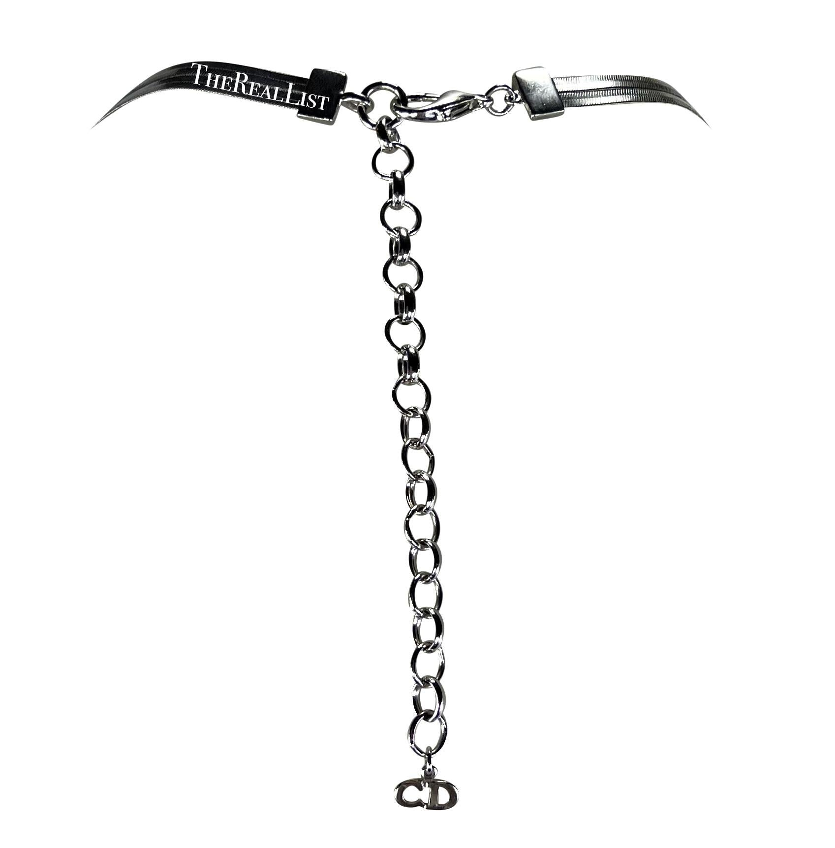 Presenting a stunning silver-tone Christian Dior necklace, designed by John Galliano. From the Fall/Winter 2000 collection, the necklace features a plunging design that gracefully descends down the neckline, drawing attention to the décolletage. Adorned with a rhinestone 'D' pendant, it sparkles with radiance and adds a touch of glamour to any ensemble. With a similar necklace recently worn by Rihanna, this choker is an extraordinary accessory that embodies the fusion of creativity, luxury, and allure synonymous with Galliano's tenure at Christian Dior.