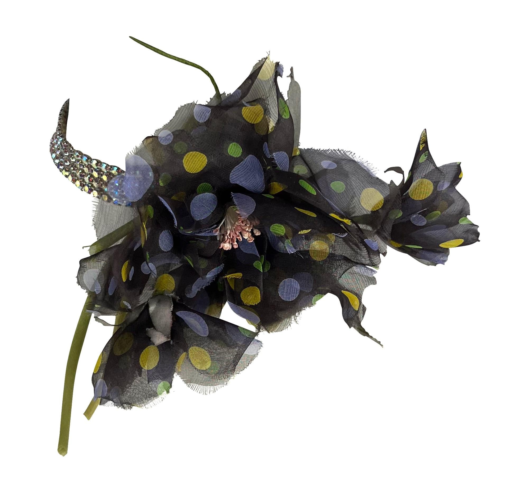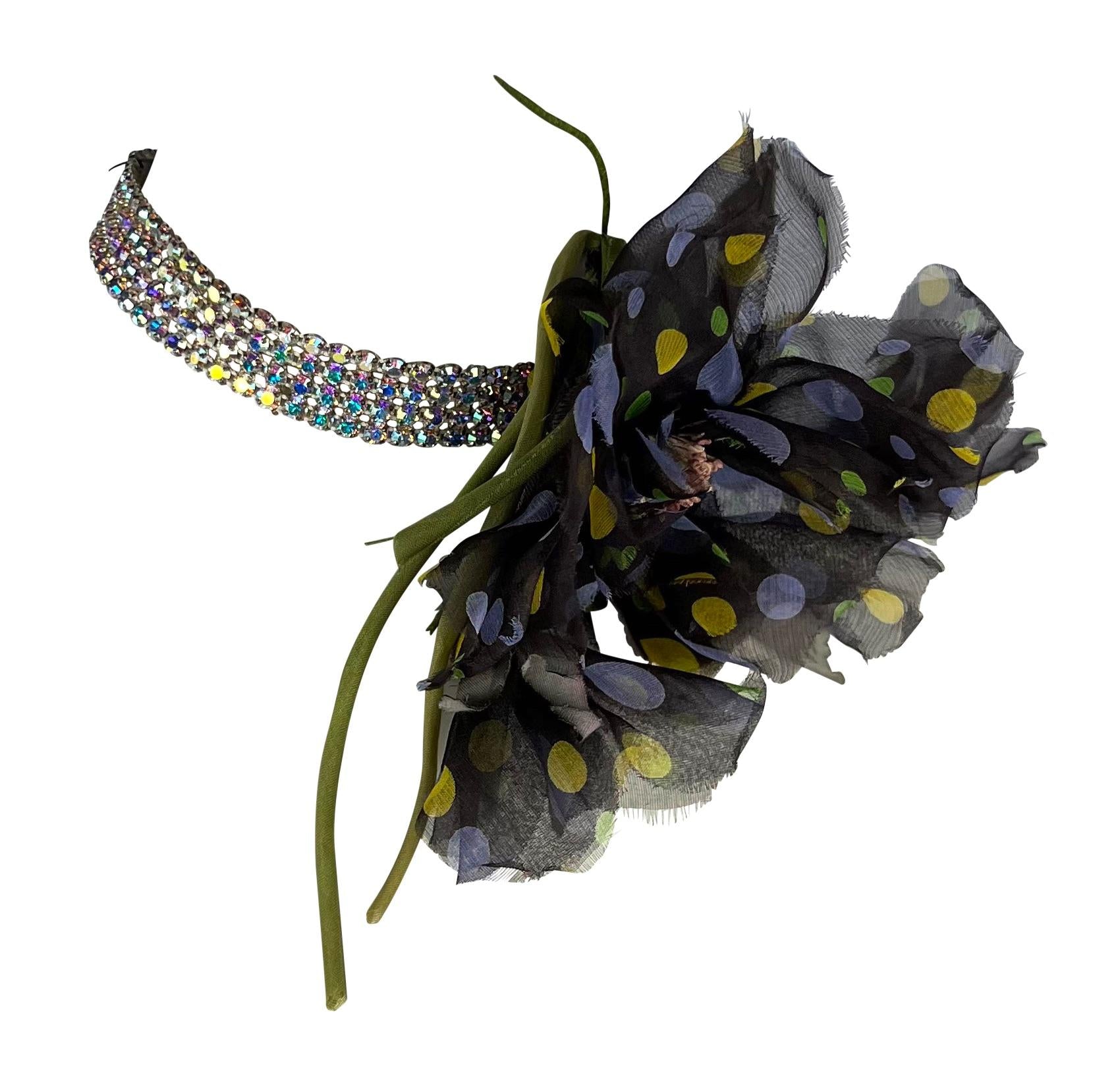 Make a statement with this rhinestone Dolce & Gabbana choker, a sparkly accessory from the Fall/Winter 2000 collection. This choker features rows of iridescent crystals that catch the light with every movement. The standout element is a large silk polka dot patterned flower. Very Carrie Bradshaw, this rare choker is the perfect flashy addition to any outfit.