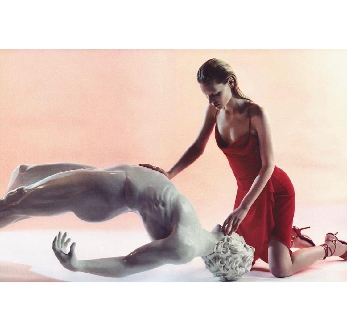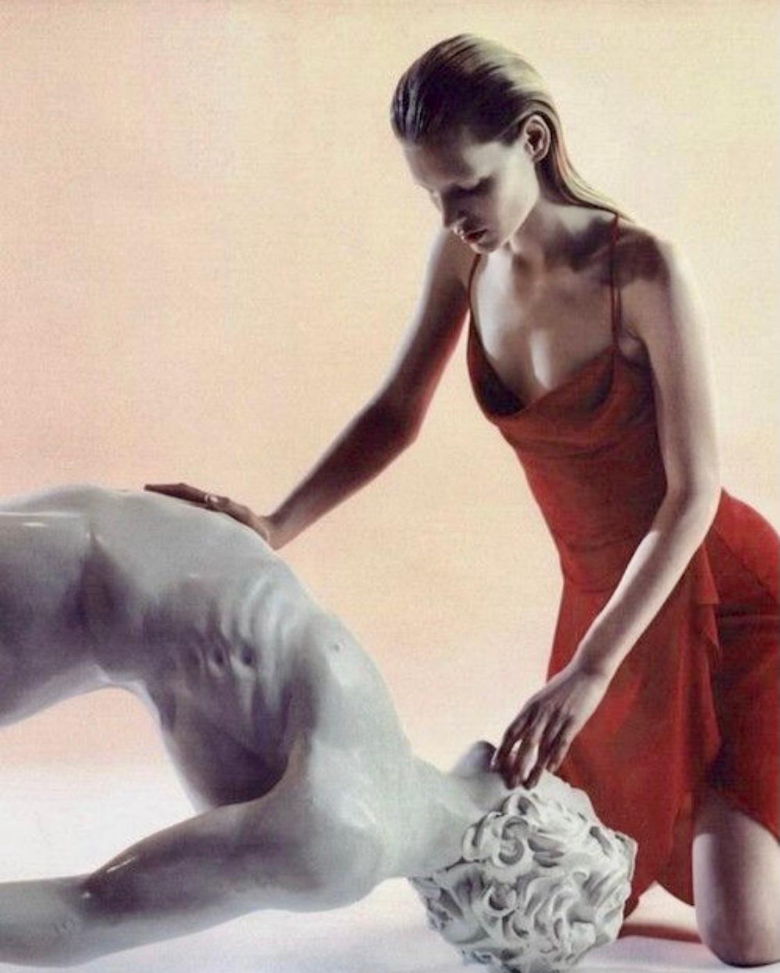 This blue watercolor silk chiffon dress from Emanuel Ungaro’s Fall/Winter 2000 collection embodies the house’s fluid sensuality in the Y2K era. The halterneck design debuted in red as Look 55 and appeared in the season’s ad campaign on Kristen Owen, photographed by Mario Sorrenti. Cut from lightweight chiffon, it features a plunging cowl neckline and a wrap detail at the high-slit skirt, creating movement and allure. Designed by Emanuel Ungaro himself before Giambattista Valli assumed creative direction of the ready-to-wear line, this dress is a rare example of the couturier’s late work.