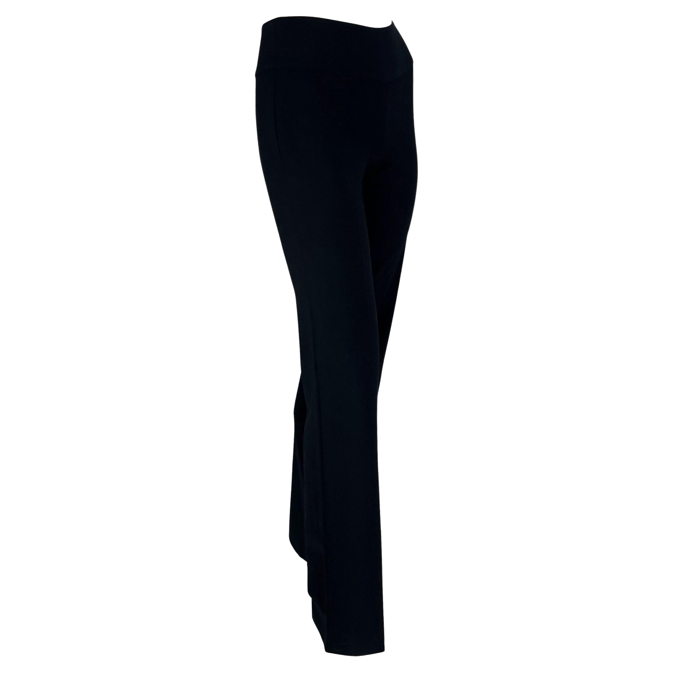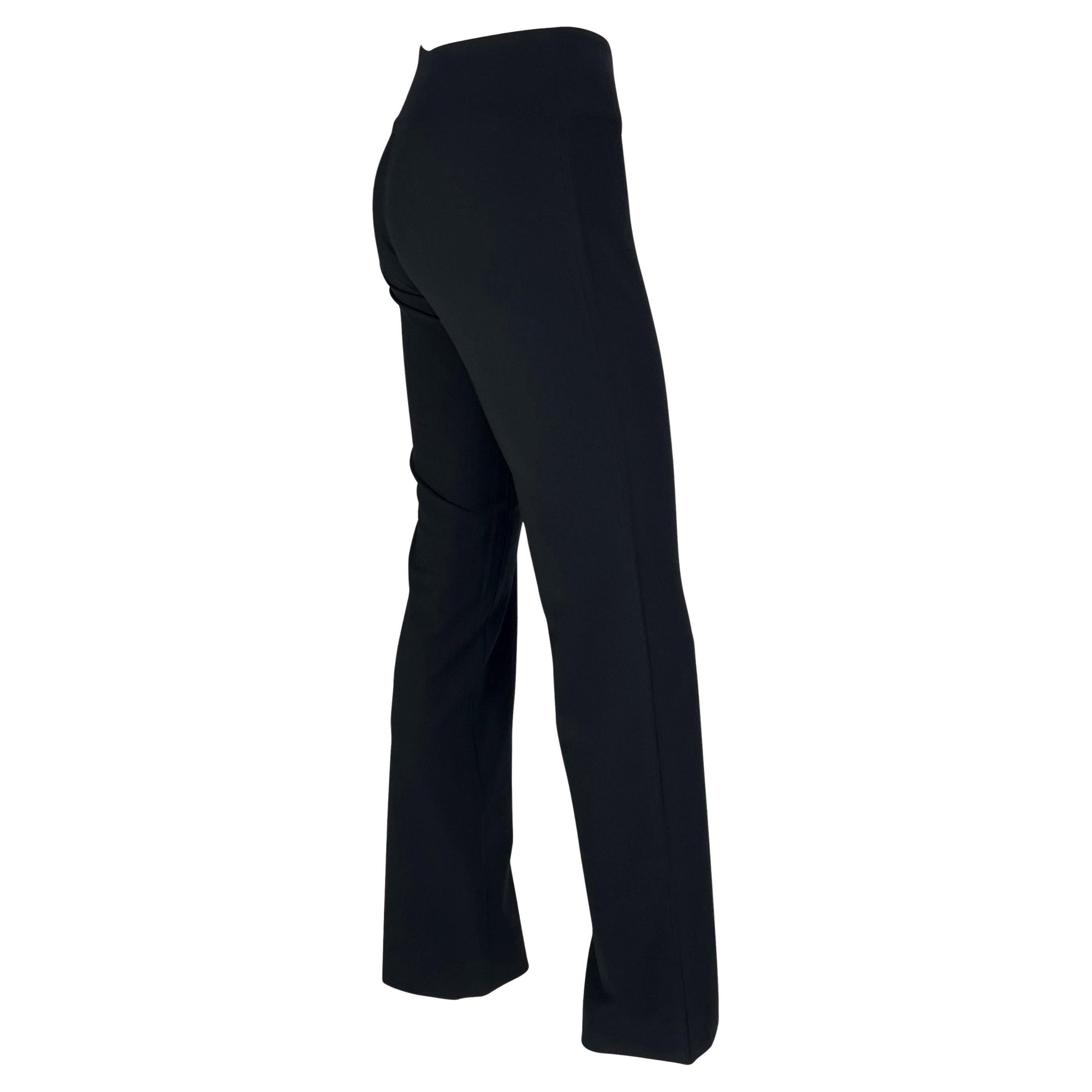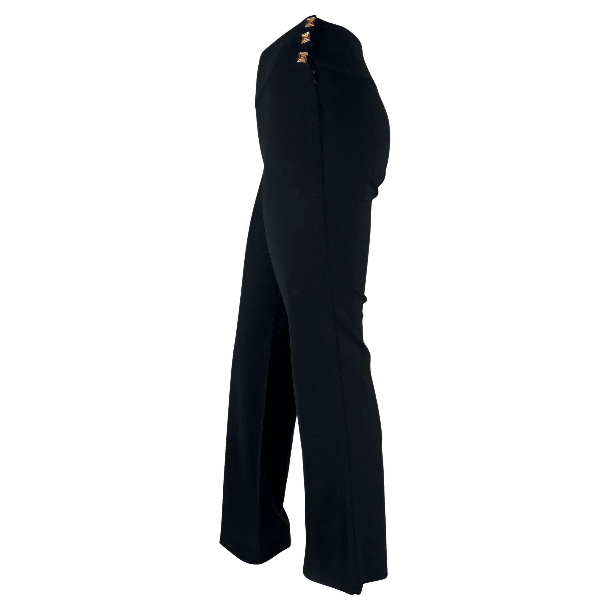 Presenting a pair of black Gianni Versace Couture pants, designed by Donatella Versace. From the Fall/Winter 2000 collection, these classic black pants are elevated with three gold Greek key buttons at the hip.