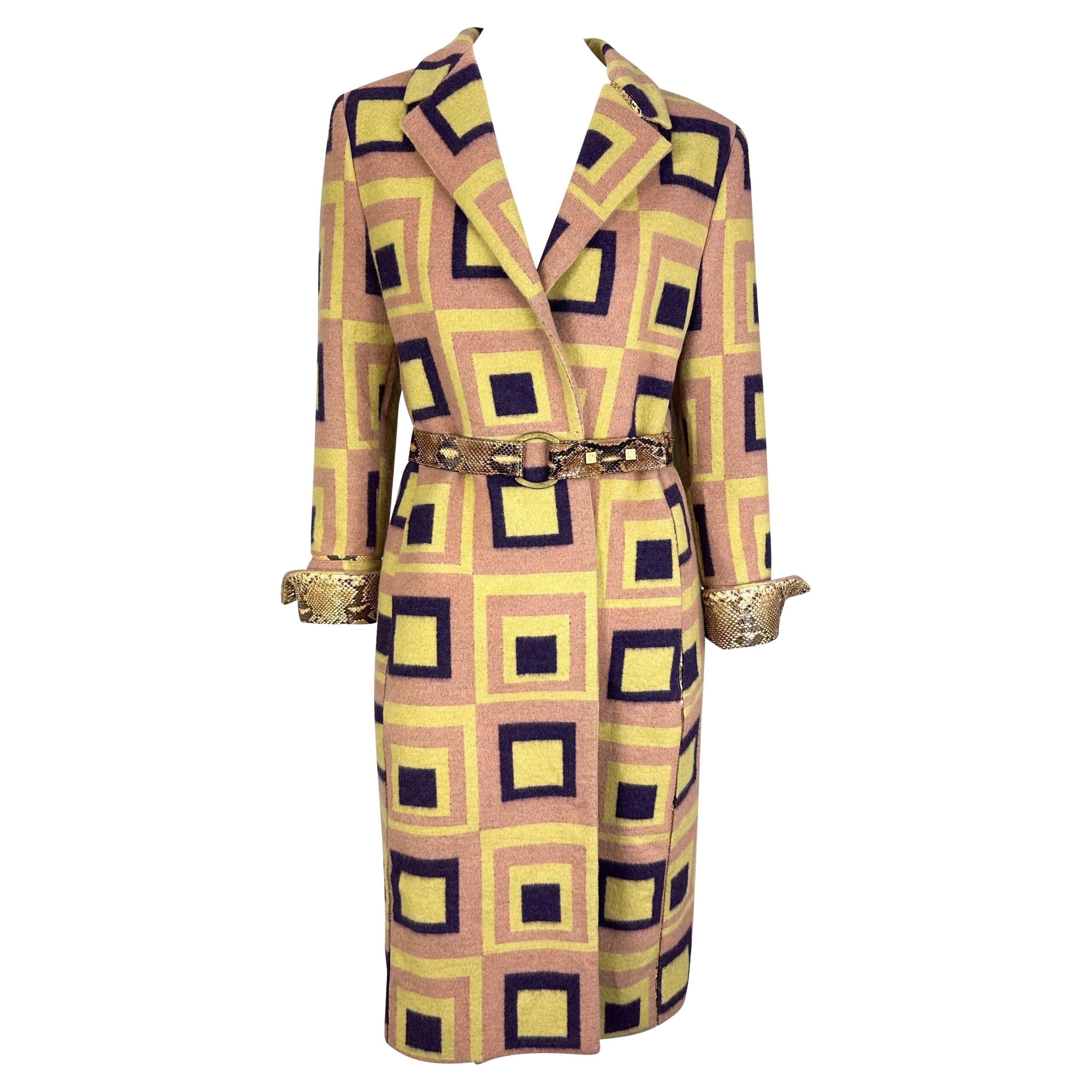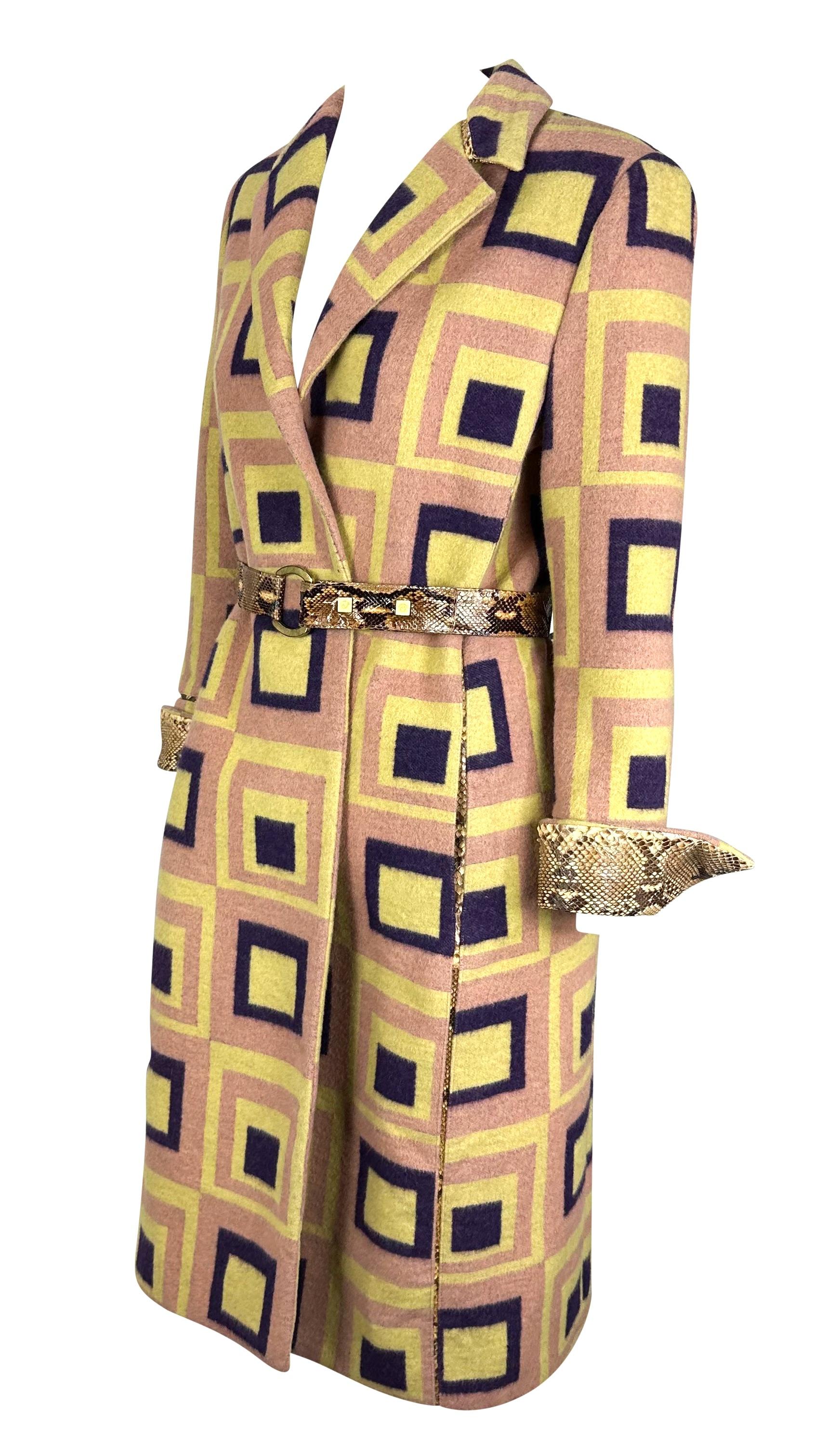 This light pink geometric wool coat from Gianni Versace’s Fall/Winter 2000 collection, designed by Donatella Versace, debuted on the runway as Look 12, modeled by Isabeli Fontana. The design was also featured in the season’s ad campaign, worn by Georgina Grenville and photographed by Steven Meisel. Constructed in wool, the coat showcases a bold square motif in light pink, yellow, and purple, and is finished with python trim at the cuffs and a matching python waist belt. An iconic documented piece, it represents Donatella Versace’s distinctive early vision for the house.