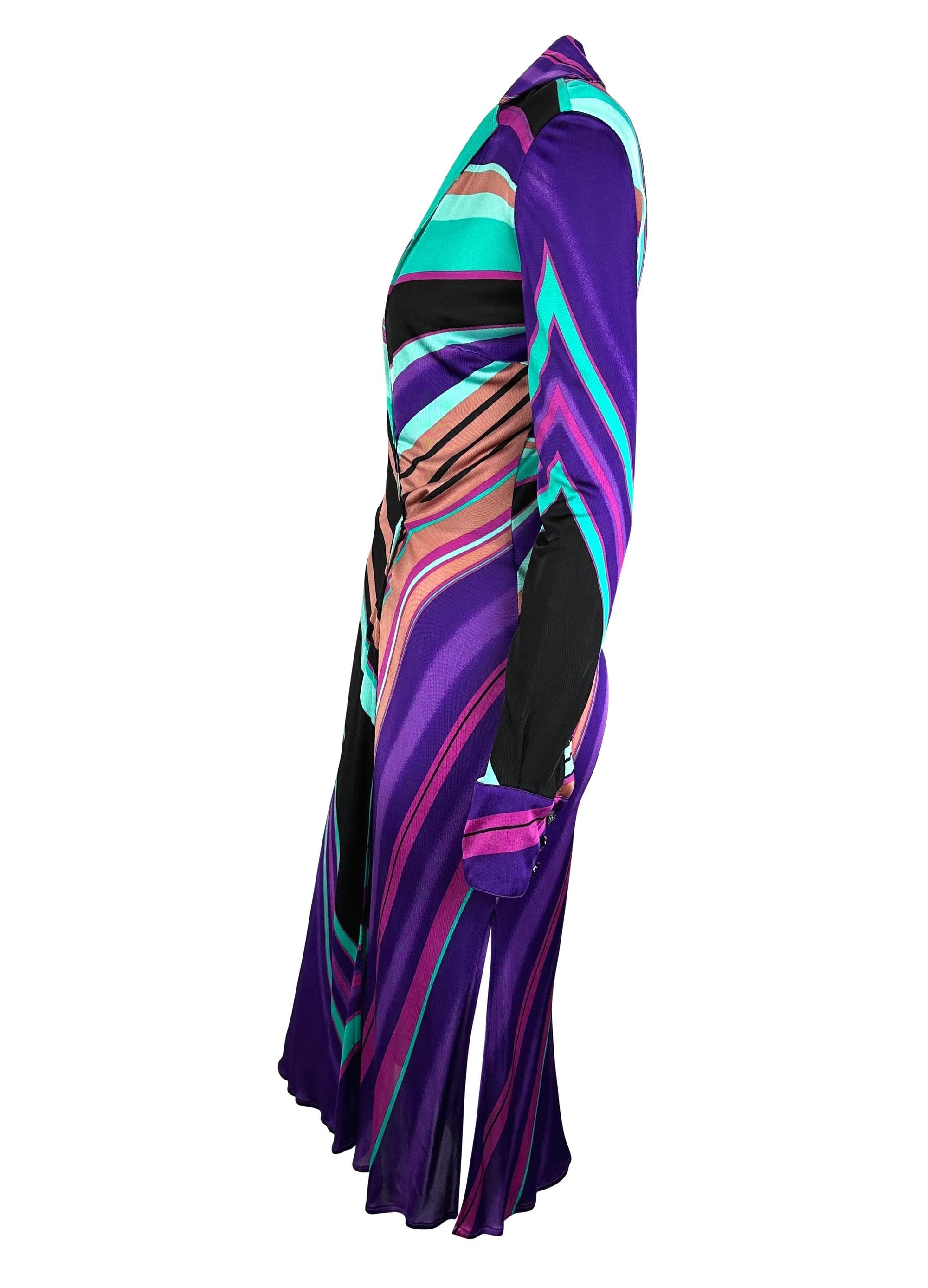 Presenting a fabulous blue and purple slinky Gianni Versace dress designed by Donatella Versace. From the Fall/Winter 2000 collection, this dress is covered in a multicolor abstract print. The dress features a plunging neckline, collar, and long sleeves, complete with iridescent crystal buttons at the cuffs. Add this rare Y2K Gianni Versace by Donatella piece to your collection!